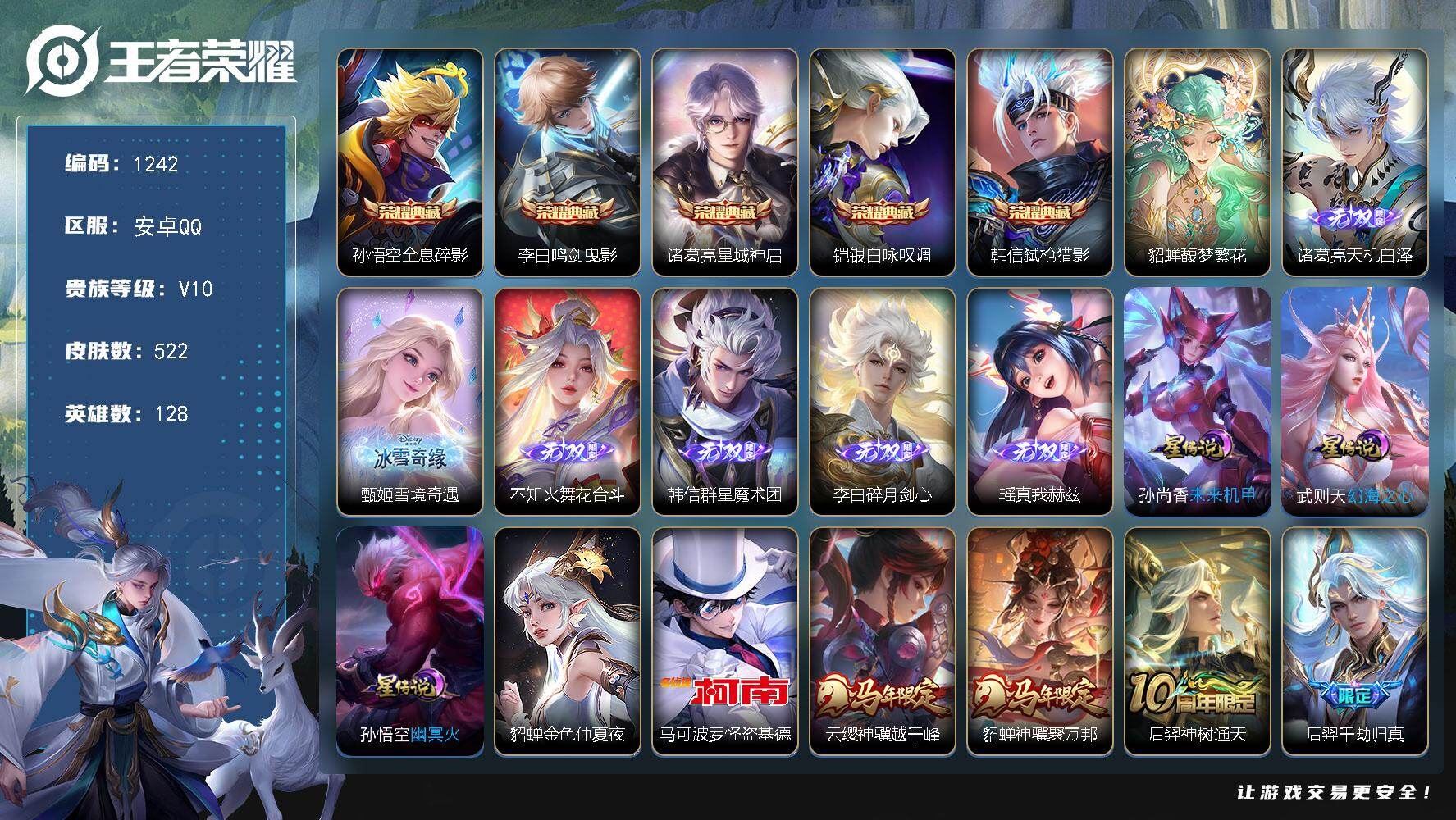 【账号佳】 【可二次实名】可二次安卓Q【营地:465144601】-V10-最强王者段位-128英雄-522皮肤-5典藏皮肤-1珍品无双-6无双-1珍品传说-56传说-164史诗【英雄全皮】:嬴政全皮,刘禅全皮,李白全皮,达摩全皮,刘邦全皮,孙权全皮,钟馗全皮,黄忠全皮,敖隐全皮,阿古朵全皮,司空震全皮,戈娅全皮,空空儿全皮,影全皮,海诺全皮【荣耀典藏】:孙悟空全息碎影,李白鸣剑曳影,诸葛亮星域神启,铠银白咏叹调,韩信弑枪猎影【珍品无双】:貂蝉馥梦繁花【无双皮肤】:诸葛亮天机白泽,甄姬雪境奇遇,不知火舞花合斗,韩信群星魔术团,李白碎月剑心,瑶真我赫兹【珍品传说】:马可波罗怪盗基德【传说皮肤】:云缨神骥越千峰,貂蝉神骥聚万邦,后羿神树通天,后羿千劫归真,司空震愿照山河定,女娲愿照千秋盛,妲己愿照众生和,澜愿照九州拓,蔡文姬愿照福禄聚,虞姬愿照岁时盈,嬴政玄雷天君,王昭君映山客,桑启鸣野蒿,铠冥王哈迪斯,孙策乘龙淬吴钩,赵云乘龙铭钟鼎,铠琥珀纪元,澜逐花归海,艾琳觅芳踪,露娜霜月吟,狄仁杰夜礼服假面,鲁班七号时之奇旅,马可波罗妄想实况,东皇太一灼幽烈阳,公孙离记忆之芯,虞姬无限倾心,李信山海炽霜斩,李白诗剑行,王昭君星穹之声,大乔挚爱花嫁,瑶时之祈愿,赵云淬星耀世,王昭君乞巧织情,李元芳飞鸢探春,铠绛天战甲,镜炽阳神光,虞姬启明星使,孙悟空零号赤焰,曜云鹰飞将,李信一念神魔,貂蝉猫影幻舞,张良黄金白羊座,干将莫邪久胜战神,达摩黄金狮子座,花木兰冠军飞将,后羿黄金射手座,杨戬永曜之星,诸葛亮武陵仙君,貂蝉仲夏夜之梦,李白凤求凰,孙尚香末日机甲,宫本武藏地狱之眼,孙悟空地狱火,吕布天魔缭乱,武则天海洋之心,狄仁杰超时空战士【限定皮肤】:铠冥王哈迪斯,暃埋骨钱,蔡文姬夏日便利店,大乔绒语心约,虞姬夏日便利店,姜子牙天穹之誓,杨戬破阵退雄兵,李白谪仙醉月,狄仁杰阴阳师,赵云皇家上将,赵云引擎之心,赵云百木心枪,墨子神迹守卫,嬴政优雅恋人,嬴政白昼王子,孙尚香蔷薇恋人,鲁班七号狮舞东方,鲁班七号时之奇旅,庄周云端筑梦师,庄周高山流水,高渐离玩趣恶龙,阿轲迷踪丽影,钟无艳超时空战士,扁鹊奇幻香踪,白起夜都怪侠,芈月幻夜卜梦,吕布天魔缭乱,周瑜赤莲之焰,元歌云间偶戏,元歌无心,夏侯惇朔风刀,甄姬游园惊梦,甄姬落雪兰心,曹操天狼征服者,典韦蓝屏警告,典韦岱宗,马可波罗暗影游猎,马可波罗山海玄木吟,马可波罗妄想实况,关羽冰锋战神,韩信飞衡,韩信傲雪梅枪,王昭君凤凰于飞,王昭君午后时光,王昭君星穹之声,兰陵王驯魔猎人,兰陵王金庭之子,花木兰青春决赛季,亚瑟潮玩骑士王,孙悟空美猴王,孙悟空至尊宝,孙悟空零号赤焰,孙悟空孙行者,后羿辉光之辰,后羿如梦令,虞姬启明星使,虞姬无限倾心,杨玉环遇见飞天,杨戬永曜之星,,鬼谷子五谷丰年,诸葛亮武陵仙君,大乔挚爱花嫁,黄忠烈魂,黄忠火炮绅士,铠青龙志,苏烈千军破阵,百里守约朱雀志,裴擒虎李小龙,,瑶时之祈愿,云中君纤云弄巧,李信山海炽霜斩,上官婉儿梁祝,,阿古朵江河有灵,张良古海寻踪,狄仁杰夜礼服假面,蒙犽百解令,艾琳觅芳踪,高渐离燃音魔法,妲己灵卜魔法,鬼谷子天穹祈灯,李白碎月剑心,伽罗琥珀纪元,铠琥珀纪元,大乔乘龙忆丹青,孙策乘龙淬吴钩,赵云乘龙铭钟鼎,沈梦溪龙舞盛年,鲁班七号蔬乡物语,李元芳蔬乡物语,刘邦剑破天穹,韩信群星魔术团,海诺心动手记,刘备异域游侠,周瑜熔金海岸,不知火舞花合斗【年限皮肤】:孙悟空美猴王,王昭君凤凰于飞,李白凤求凰,杨戬永曜之星,后羿辉光之辰,百里守约朱雀志,铠青龙志,典韦岱宗,韩信飞衡,李信山海炽霜斩,马可波罗山海玄木吟,孙策乘龙淬吴钩,赵云乘龙铭钟鼎,大乔乘龙忆丹青,司空震愿照山河定,女娲愿照千秋盛,妲己愿照众生和,澜愿照九州拓,蔡文姬愿照福禄聚,虞姬愿照岁时盈【夺宝幸运值257】各种道具详情看截图、低价出售找回包 赔、截图展示段位不代 表实际段位,如赛季更新等不可抗拒因素发生变化、时限道具不保证所剩时间、标题未写送点劵默认不送【卖号买号首选亿梦】