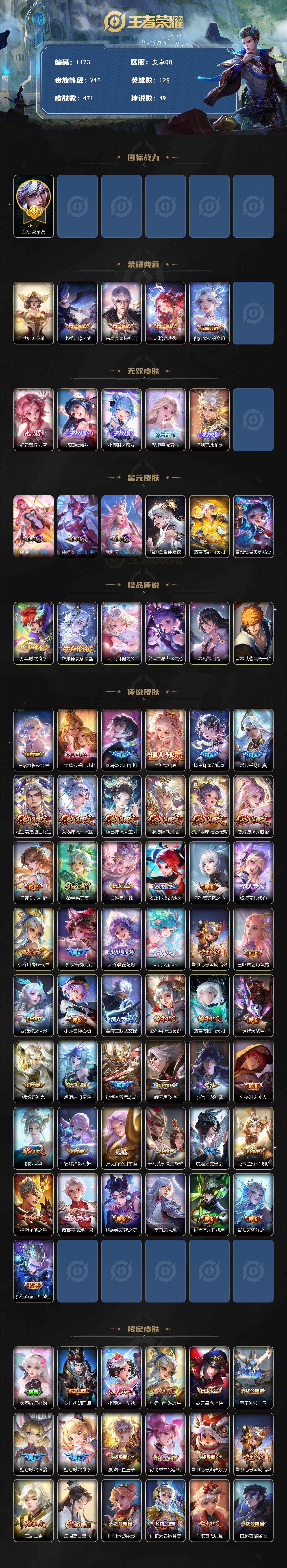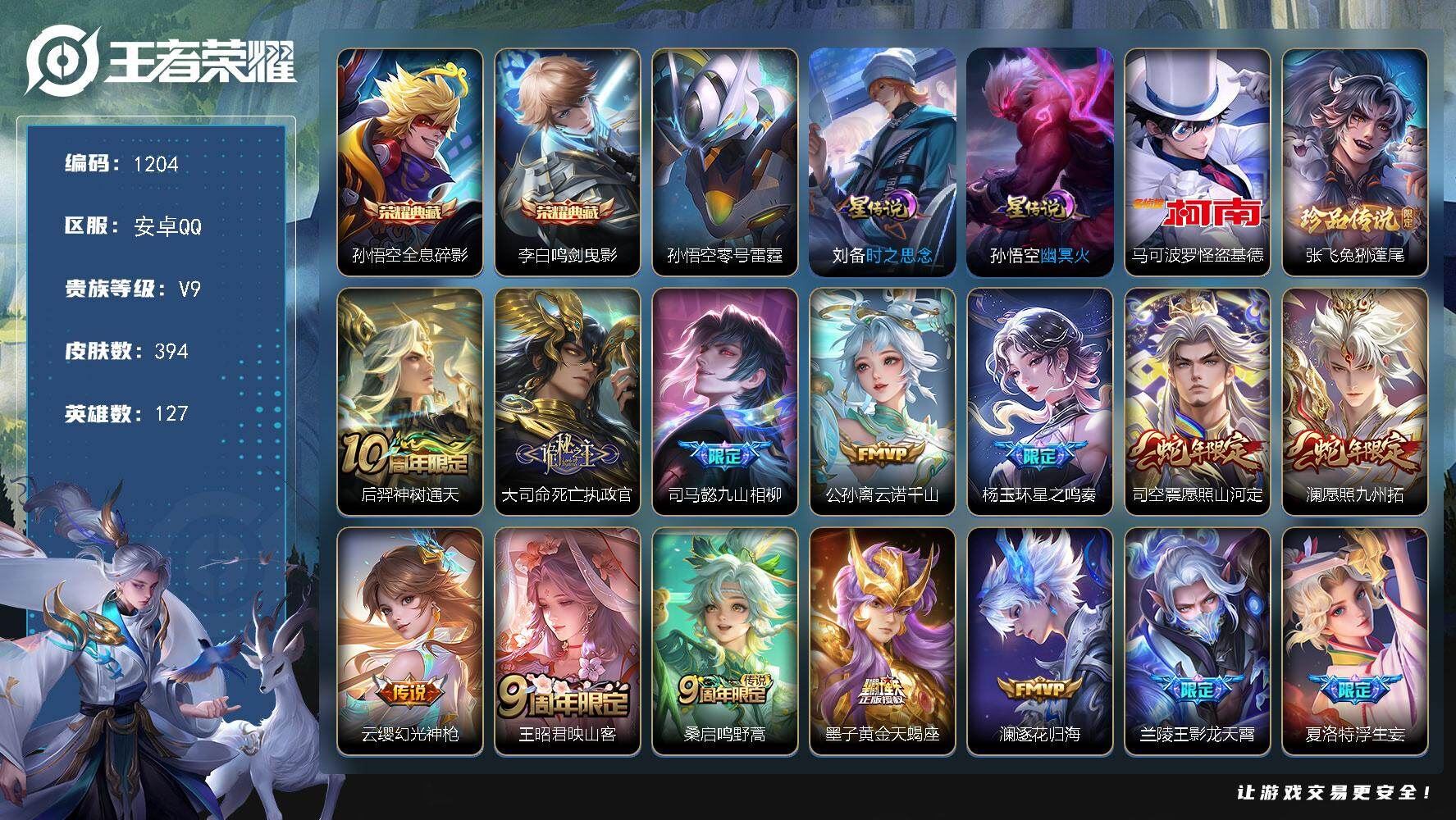 【账号佳】 【可二次实名】可二次安卓Q-V10-最强王者段位-128英雄-471皮肤-4典藏皮肤-1典藏英雄-5无双-6珍品传说-49传说-153史诗【英雄全皮】:小乔全皮,刘邦全皮,孙权全皮,杨玉环全皮,苍全皮,瑶全皮,嫦娥全皮,西施全皮,空空儿全皮,影全皮,少司缘全皮【荣耀典藏】:武则天英雄,小乔天鹅之梦,诸葛亮星域神启,瑶拾光映像,伽罗最初的交响【无双皮肤】:妲己青丘九尾,瑶真我赫兹,小乔时之魔女,甄姬雪境奇遇,曜器灵螭龙剑【营地ID】:484094981【金标】:金标高渐离【星元皮肤】:虞姬无限倾慕,貂蝉金色仲夏夜,鲁班七号寅虎焰心,诸葛亮岁雨灵司,孙尚香未来机甲,武则天幻海之心【珍品传说】:孙策时之奇旅,嫦娥器灵落星盏,瑶大耳狗之梦,安琪拉酷洛米之心,暃朽木白哉,宫本武藏黑崎一护【传说皮肤】:王昭君长夜焕生,干将莫邪千山共赴,司马懿九山相柳,西施续相思,杨玉环星之鸣奏,后羿千劫归真,司空震愿照山河定,女娲愿照千秋盛,妲己愿照众生和,澜愿照九州拓,蔡文姬愿照福禄聚,虞姬愿照岁时盈,云缨幻光神枪,桑启鸣野蒿,艾琳觅芳踪,安琪拉追逃游戏,公孙离记忆之芯,虞姬无限倾心,小乔山海琳琅生,不知火舞绯月行,大乔挚爱花嫁,瑶时之祈愿,鲁班七号寅虎瑞焰,王昭君乞巧织情,西施游龙清影,小乔音你心动,兰陵王默契交锋,公孙离祈雪灵祝,诸葛亮时雨天司,铠绛天战甲,镜炽阳神光,虞姬启明星使,孙悟空零号赤焰,曜云鹰飞将,李信一念神魔,刘备时之恋人,伽罗太华,貂蝉猫影幻舞,张良黄金白羊座,干将莫邪久胜战神,虞姬云霓雀翎,花木兰冠军飞将,杨戬永曜之星,诸葛亮武陵仙君,貂蝉仲夏夜之梦,李白凤求凰,孙尚香末日机甲,武则天海洋之心,狄仁杰超时空战士【限定皮肤】:大乔绒语心约,狄仁杰阴阳师,小乔纯白花嫁,小乔山海琳琅生,赵云皇家上将,墨子神迹守卫,妲己时之彼端,妲己时之奇旅,嬴政白昼王子,孙尚香蔷薇恋人,鲁班七号狮舞东方,鲁班七号寅虎瑞焰,庄周玄嵩,庄周高山流水,阿轲迷踪丽影,孙膑天狼运算者,孙膑寅虎展翼,白起夜都怪侠,芈月白晶晶,芈月幻夜卜梦,吕布猎兽之王,吕布御风骁将,周瑜赤莲之焰,元歌云间偶戏,元歌无心,夏侯惇朔风刀,甄姬幽恒,甄姬女儿国国王,甄姬游园惊梦,曹操天狼征服者,典韦穷奇,典韦蓝屏警告,典韦岱宗,马可波罗暗影游猎,狄仁杰魔术师,狄仁杰万华元夜,达摩星际陆战队,达摩沙漠行僧,项羽海滩派对,项羽霸王别姬,老夫子醍醐杖,老夫子航海奇遇记,安琪拉魔法小厨娘,安琪拉追逃游戏,程咬金演武夺筹,露娜一生所爱,刘邦夺宝奇兵,韩信逐梦之影,韩信飞衡,王昭君凤凰于飞,兰陵王默契交锋,兰陵王驯魔猎人,兰陵王金庭之子,花木兰默契交锋,不知火舞绯月行,亚瑟潮玩骑士王,孙悟空至尊宝,孙悟空零号赤焰,孙悟空孙行者,牛魔御旌,牛魔奔雷神使,后羿辉光之辰,后羿如梦令,后羿圣弓游侠,李元芳银河之约,李元芳云中旅人,虞姬霸王别姬,虞姬启明星使,虞姬无限倾心,钟馗神迹守卫,钟馗驱傩正仪,杨玉环遇见飞天,杨玉环寅虎心曲,杨戬永曜之星,杨戬潮玩骑兵,女娲朔望之晖,干将莫邪冰霜恋舞曲,干将莫邪胡桃夹子,干将莫邪真爱魔法,雅典娜单词大作战,雅典娜黎明之约,蔡文姬奇迹圣诞,蔡文姬繁星吟游,东皇太一逐梦之光,鬼谷子原初探秘者,鬼谷子五谷丰年,诸葛亮武陵仙君,诸葛亮时雨天司,大乔白鹤梁神女,大乔挚爱花嫁,黄忠火炮绅士,苏烈千军破阵,百里玄策原初追逐者,百里守约朱雀志,弈星混沌棋,梦奇顽趣,公孙离蜜橘之夏,公孙离祈雪灵祝,裴擒虎李小龙,裴擒虎擒涛扼浪,狂铁御狮,米莱狄御霄,米莱狄胡桃异想国,瑶时之祈愿,瑶山海碧波行,云中君纤云弄巧,伽罗太华,伽罗天狼溯光者,盾山御銮,猪八戒西部大镖客,上官婉儿梁祝,上官婉儿天狼绘梦者,嫦娥如梦令,嫦娥拒霜思,嫦娥暖冬兔眠,西施玲珑珍味,西施至美乘鲤谣,蒙犽狂想玩偶喵,鲁班大师探海日志,桑启海盐诗旅,张良古海寻踪,艾琳觅芳踪,高渐离燃音魔法,妲己灵卜魔法,鬼谷子天穹祈灯,姬小满妄想食味,小乔时之魔女,安琪拉乘龙聚宝船,沈梦溪龙舞盛年,李元芳蔬乡物语,刘邦剑破天穹,周瑜熔金海岸【年限皮肤】:王昭君凤凰于飞,李白凤求凰,杨戬永曜之星,后羿辉光之辰,百里守约朱雀志,庄周玄嵩,甄姬幽恒,伽罗太华,典韦岱宗,韩信飞衡,公孙离祈雪灵祝,诸葛亮时雨天司,吕布御风骁将,牛魔奔雷神使,鲁班七号寅虎瑞焰,孙膑寅虎展翼,杨玉环寅虎心曲,小乔山海琳琅生,瑶山海碧波行,安琪拉乘龙聚宝船,司空震愿照山河定,女娲愿照千秋盛,妲己愿照众生和,澜愿照九州拓,蔡文姬愿照福禄聚,虞姬愿照岁时盈,各种道具详情看截图、低价出售找回包 赔、截图展示段位不代 表实际段位,如赛季更新等不可抗拒因素发生变化、时限道具不保证所剩时间、标题未写送点劵默认不送【卖号买号首选亿梦】
