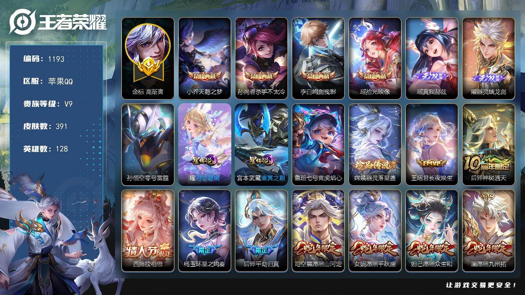 【账号佳】 【可二次实名】可二次苹果Q【营地:57151407】-V9-最强王者段位-128英雄-391皮肤-4典藏皮肤-2无双-1珍品传说-41传说-110史诗【金标】:金标高渐离【星元皮肤】:孙悟空零号雷霆,瑶时之愿境,鲁班七号寅虎焰心,宫本武藏幽冥之眼【英雄全皮】:达摩全皮,孙权全皮,钟馗全皮,狂铁全皮,猪八戒全皮,蒙恬全皮【荣耀典藏】:小乔天鹅之梦,孙尚香杀手不太冷,李白鸣剑曳影,瑶拾光映像【无双皮肤】:瑶真我赫兹,曜器灵螭龙剑【珍品传说】:嫦娥器灵落星盏【传说皮肤】:王昭君长夜焕生,后羿神树通天,西施续相思,杨玉环星之鸣奏,后羿千劫归真,司空震愿照山河定,女娲愿照千秋盛,妲己愿照众生和,澜愿照九州拓,蔡文姬愿照福禄聚,虞姬愿照岁时盈,桑启鸣野蒿,大乔时之奇旅,诸葛亮鹤羽星尊,项羽无限倾心,小乔山海琳琅生,曜山海苍雷引,李信山海炽霜斩,不知火舞绯月行,马超无双飞将,大乔挚爱花嫁,孙策挚爱之约,女娲补天,瑶时之祈愿,裴擒虎寅虎赤拳,鲁班七号寅虎瑞焰,孙尚香异界灵契,貂蝉遇见胡旋,西施游龙清影,公孙离祈雪灵祝,虞姬启明星使,孙悟空零号赤焰,关羽武圣,曜云鹰飞将,伽罗太华,貂蝉猫影幻舞,张良黄金白羊座,干将莫邪久胜战神,虞姬云霓雀翎,达摩黄金狮子座,宫本武藏地狱之眼【限定皮肤】:狄仁杰阴阳师,廉颇寅虎御盾,小乔山海琳琅生,赵云皇家上将,赵云百木心枪,墨子神迹守卫,孙尚香异界灵契,鲁班七号寅虎瑞焰,庄周高山流水,孙膑寅虎展翼,马可波罗山海玄木吟,项羽无限倾心,关羽武圣,貂蝉遇见胡旋,孙悟空零号赤焰,孙悟空孙行者,牛魔御旌,后羿如梦令,虞姬启明星使,杨玉环寅虎心曲,鬼谷子五谷丰年,大乔挚爱花嫁,大乔时之奇旅,铠青龙志,公孙离祈雪灵祝,裴擒虎李小龙,裴擒虎寅虎赤拳,瑶时之祈愿,瑶山海碧波行,云中君纤云弄巧,云中君时之祈愿,李信山海炽霜斩,伽罗太华,盾山御銮,孙策挚爱之约,猪八戒猪悟能,上官婉儿梁祝,嫦娥如梦令,曜山海苍雷引,阿古朵江河有灵【年限皮肤】:铠青龙志,伽罗太华,公孙离祈雪灵祝,裴擒虎寅虎赤拳,鲁班七号寅虎瑞焰,孙膑寅虎展翼,廉颇寅虎御盾,杨玉环寅虎心曲,小乔山海琳琅生,曜山海苍雷引,李信山海炽霜斩,瑶山海碧波行,马可波罗山海玄木吟,司空震愿照山河定,女娲愿照千秋盛,妲己愿照众生和,澜愿照九州拓,蔡文姬愿照福禄聚,虞姬愿照岁时盈,各种道具详情看截图、低价出售找回包 赔、截图展示段位不代 表实际段位,如赛季更新等不可抗拒因素发生变化、时限道具不保证所剩时间、标题未写送点劵默认不送【卖号买号首选亿梦】