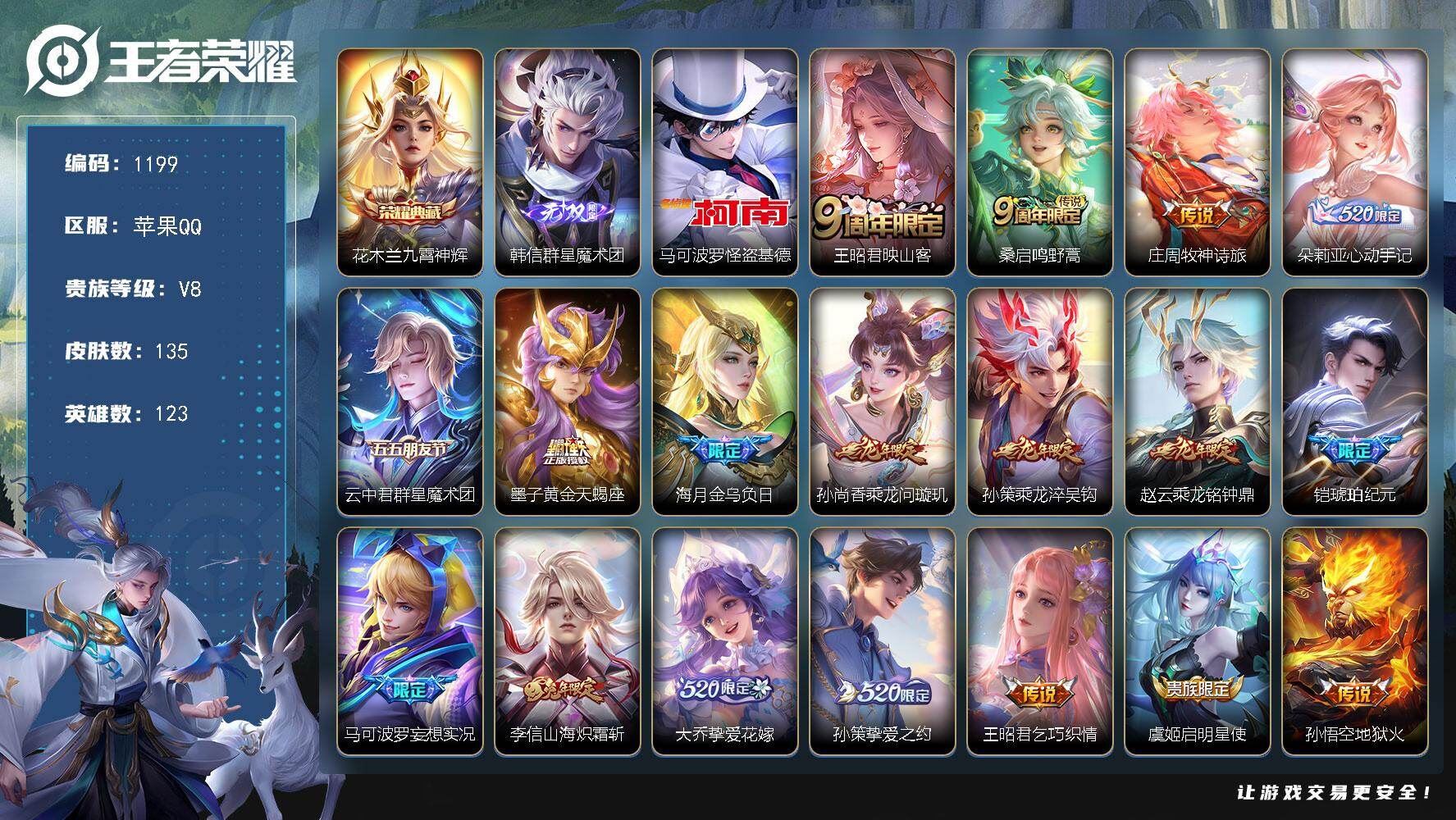 【账号佳】 【可二次实名】可二次苹果Q【营地:1785925933】-V8-至尊星耀III段位-127英雄-245皮肤-3典藏皮肤-1无双-5珍品传说-12传说-73史诗【英雄全皮】:孙权全皮,女娲全皮,空空儿全皮,影全皮【荣耀典藏】:貂蝉幻阙歌,虞姬神鉴启示录,吕布千魇归渊【无双皮肤】:甄姬雪境奇遇【珍品传说】:马可波罗怪盗基德,鲁班七号江户川柯南,嫦娥器灵落星盏,瑶大耳狗之梦,安琪拉酷洛米之心【传说皮肤】:后羿神树通天,女娲愿照千秋盛,妲己愿照众生和,桑启鸣野蒿,貂蝉曦玄引,女娲补天,孙策末日机甲,虞姬启明星使,虞姬云霓雀翎,后羿黄金射手座,貂蝉仲夏夜之梦,孙尚香末日机甲【限定皮肤】:狄仁杰阴阳师,赵云皇家上将,赵云百木心枪,嬴政优雅恋人,孙尚香蔷薇恋人,高渐离死亡摇滚,孙膑寅虎展翼,扁鹊奇幻香踪,白起夜都怪侠,芈月白晶晶,芈月幻夜卜梦,元歌无心,狄仁杰魔术师,达摩沙漠行僧,项羽海滩派对,王昭君午后时光,兰陵王金庭之子,后羿圣弓游侠,李元芳云中旅人,虞姬启明星使,杨玉环寅虎心曲,杨戬潮玩骑兵,女娲朔望之晖,女娲补天,干将莫邪真爱魔法,鬼谷子五谷丰年,黄忠火炮绅士,苏烈千军破阵,沈梦溪大漠名商,明世隐吟游魔法,裴擒虎擒涛扼浪,狂铁电玩高手,瑶山海碧波行,上官婉儿神器万象笔,嫦娥拒霜思,嫦娥暖冬兔眠,鲁班大师探海日志,桑启海盐诗旅,暃星界游侠,艾琳女武神,张良古海寻踪,高渐离燃音魔法,妲己灵卜魔法,鬼谷子天穹祈灯,伽罗琥珀纪元,貂蝉曦玄引,沈梦溪龙舞盛年,鲁班七号蔬乡物语,李元芳蔬乡物语,刘邦剑破天穹,上官婉儿群星魔术团,程咬金群星魔术团,镜青焰无极,项羽苍威无极,周瑜熔金海岸【年限皮肤】:孙膑寅虎展翼,杨玉环寅虎心曲,瑶山海碧波行,女娲愿照千秋盛,妲己愿照众生和,各种道具详情看截图、低价出售找回包 赔、截图展示段位不代 表实际段位,如赛季更新等不可抗拒因素发生变化、时限道具不保证所剩时间、标题未写送点劵默认不送【卖号买号首选亿梦】