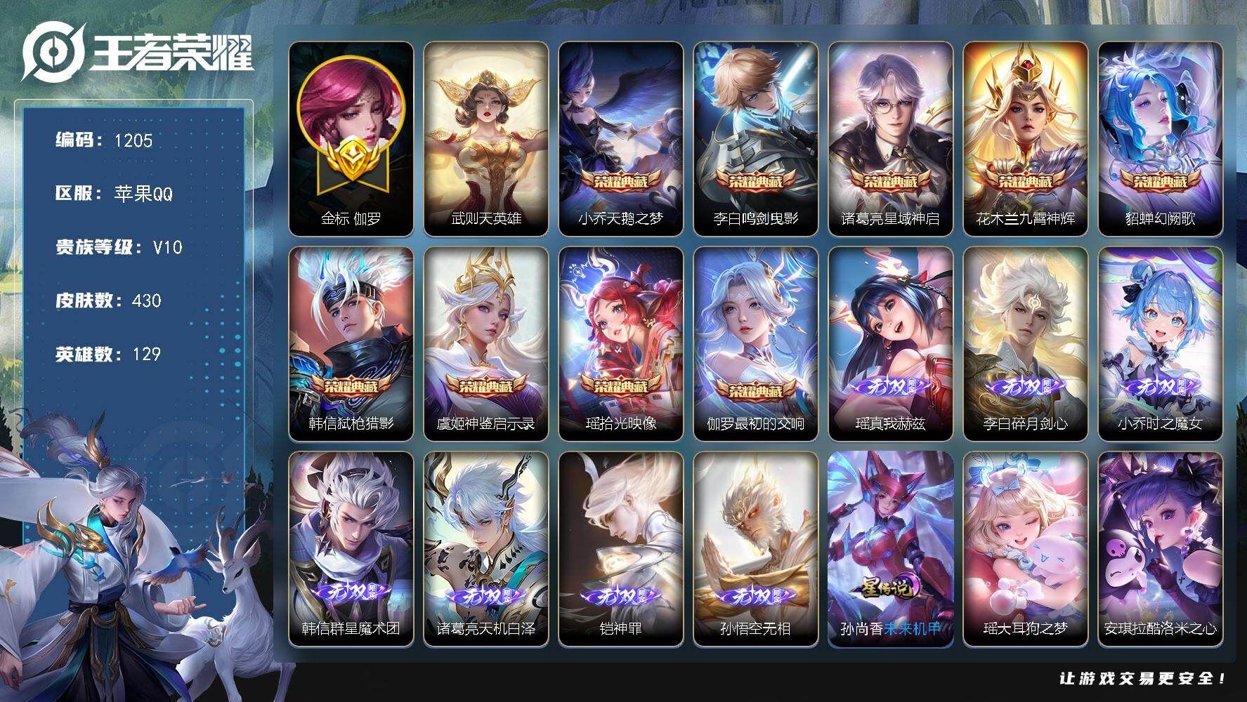 【账号佳】 【可二次实名】可二次苹果Q-V10-最强王者段位-129英雄-643皮肤-4典藏皮肤-1典藏英雄-1珍品无双-9无双-9珍品传说-113传说-214史诗【英雄全皮】:廉颇全皮,刘禅全皮,高渐离全皮,阿轲全皮,宫本武藏全皮,李白全皮,狄仁杰全皮,貂蝉全皮,姜子牙全皮,刘邦全皮,孙权全皮,不知火舞全皮,朵莉亚全皮,娜可露露全皮,橘右京全皮,牛魔全皮,刘备全皮,钟馗全皮,杨玉环全皮,苍全皮,太乙真人全皮,鬼谷子全皮,大乔全皮,百里守约全皮,公孙离全皮,狂铁全皮,瑶全皮,云中君全皮,李信全皮,盾山全皮,孙策全皮,猪八戒全皮,上官婉儿全皮,亚连全皮,马超全皮,海月全皮,西施全皮,澜全皮,镜全皮,阿古朵全皮,桑启全皮,夏洛特全皮,司空震全皮,云缨全皮,赵怀真全皮,戈娅全皮,空空儿全皮,影全皮,海诺全皮,姬小满全皮,少司缘全皮【荣耀典藏】:武则天英雄,李白鸣剑曳影,花木兰九霄神辉,貂蝉幻阙歌,瑶拾光映像【珍品无双】:貂蝉馥梦繁花【无双皮肤】:妲己青丘九尾,瑶真我赫兹,李白碎月剑心,小乔时之魔女,不知火舞花合斗,公孙离离恨烟,甄姬雪境奇遇,曜器灵螭龙剑,孙悟空无相【营地ID】:236396975【大国标】:大国标太乙真人【小国标】:小国标瑶,小国标亚连,小国标花木兰,小国标达摩,小国标姬小满【金标】:金标梦奇,金标嫦娥,金标关羽,金标貂蝉,金标张飞,金标廉颇,金标大乔,金标马超,金标苏烈,金标狂铁,金标曹操,金标夏洛特,金标宫本武藏,金标元歌,金标艾琳,金标孙膑,金标朵莉亚,金标庄周,金标王昭君,金标公孙离,金标裴擒虎,金标鲁班大师,金标上官婉儿,金标西施,金标戈娅,金标孙策,金标蒙犽,金标李信【星元皮肤】:宫本武藏幽冥之眼,貂蝉金色仲夏夜,狄仁杰星际治安官,孙悟空幽冥火,瑶时之愿境,鲁班七号寅虎焰心,孙尚香未来机甲【珍品传说】:马可波罗怪盗基德,鲁班七号江户川柯南,孙策时之奇旅,嫦娥器灵落星盏,张飞兔狲蓬尾,瑶大耳狗之梦,安琪拉酷洛米之心,暃朽木白哉,宫本武藏黑崎一护【传说皮肤】:王昭君长夜焕生,后羿神树通天,干将莫邪千山共赴,公孙离云诺千山,西施续相思,杨玉环星之鸣奏,后羿千劫归真,司空震愿照山河定,女娲愿照千秋盛,妲己愿照众生和,澜愿照九州拓,蔡文姬愿照福禄聚,虞姬愿照岁时盈,云缨幻光神枪,裴擒虎祥瑞亨通,嬴政玄雷天君,王昭君映山客,桑启鸣野蒿,庄周牧神诗旅,夏侯惇霜北刀,朵莉亚心动手记,云中君群星魔术团,墨子黄金天蝎座,海月金乌负日,亚连落雪白狼,吕布曦玄引,貂蝉曦玄引,典韦战鼓燎原,孙尚香乘龙问璇玑,孙策乘龙淬吴钩,赵云乘龙铭钟鼎,马超琥珀纪元,铠琥珀纪元,澜逐花归海,艾琳觅芳踪,露娜霜月吟,孙膑小动物乐团,狄仁杰夜礼服假面,王昭君永恒水手月亮,甄姬至美化雀舞,大乔时之奇旅,鲁班七号时之奇旅,兰陵王影龙天霄,吕布遇见神鼓,宫本武藏惊梅引,云缨鹤归松栖,上官婉儿妄想奇谈,马可波罗妄想实况,东皇太一灼幽烈阳,诸葛亮鹤羽星尊,澜电玩雷克斯,安琪拉追逃游戏,张飞百相守梦,公孙离记忆之芯,夏洛特浮生妄,伽罗炽翼辉光,孙悟空齐天大圣,小乔山海琳琅生,曜山海苍雷引,李信山海炽霜斩,吕布怒海麟威,李白诗剑行,狄仁杰神器狴犴令,不知火舞绯月行,王昭君星穹之声,百里守约碎云,橘右京枫霜尽,娜可露露前尘镜,孙尚香音你闪耀,马可波罗深海之息,马超无双飞将,大乔挚爱花嫁,孙策挚爱之约,露娜启示之音,蔡文姬花朝如约,女娲补天,孙策末日机甲,瑶时之祈愿,裴擒虎寅虎赤拳,鲁班七号寅虎瑞焰,孙尚香异界灵契,貂蝉遇见胡旋,赵云淬星耀世,王昭君乞巧织情,西施游龙清影,周瑜音你心动,小乔音你心动,李元芳飞鸢探春,公孙离祈雪灵祝,诸葛亮时雨天司,铠绛天战甲,镜炽阳神光,虞姬启明星使,曜云鹰飞将,李信一念神魔,刘备时之恋人,伽罗太华,貂蝉猫影幻舞,张良黄金白羊座,干将莫邪久胜战神,虞姬云霓雀翎,达摩黄金狮子座,百里玄策白虎志,花木兰冠军飞将,梦奇胖达荣荣,后羿黄金射手座,貂蝉仲夏夜之梦,李白凤求凰,孙尚香末日机甲,宫本武藏地狱之眼,孙悟空地狱火,武则天海洋之心,狄仁杰超时空战士,各种道具详情看截图、低价出售找回包 赔、截图展示段位不代 表实际段位,如赛季更新等不可抗拒因素发生变化、时限道具不保证所剩时间、标题未写送点劵默认不送【卖号买号首选亿梦】