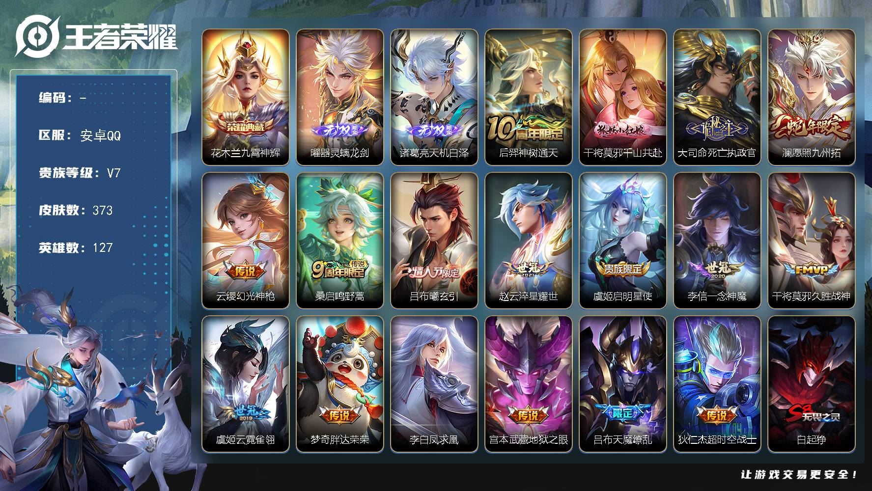 【账号佳】 【可二次实名】可二次安卓Q-V9-最强王者段位-129英雄-365皮肤-5典藏皮肤-1典藏英雄-3无双-20传说-107史诗【英雄全皮】:孙权全皮,狂铁全皮【荣耀典藏】:武则天英雄,孙悟空全息碎影,武则天倪克斯神谕,鲁班七号星空梦想,芈月大秦宣太后,韩信弑枪猎影【无双皮肤】:韩信群星魔术团,诸葛亮天机白泽,孙悟空无相【营地ID】:491505914【星元皮肤】:宫本武藏幽冥之眼,貂蝉金色仲夏夜,狄仁杰星际治安官【传说皮肤】:司马懿九山相柳,孙尚香乘龙问璇玑,孙策末日机甲,瑶时之祈愿,鲁班七号寅虎瑞焰,孙尚香异界灵契,虞姬启明星使,刘备时之恋人,伽罗太华,百里玄策白虎志,花木兰冠军飞将,梦奇胖达荣荣,后羿黄金射手座,杨戬永曜之星,貂蝉仲夏夜之梦,孙尚香末日机甲,宫本武藏地狱之眼,孙悟空地狱火,武则天海洋之心,狄仁杰超时空战士【限定皮肤】:白起狰,杨戬破阵退雄兵,狄仁杰阴阳师,虞姬凯尔特女王,廉颇寅虎御盾,赵云皇家上将,赵云引擎之心,墨子神迹守卫,妲己时之彼端,嬴政白昼王子,孙尚香异界灵契,鲁班七号寅虎瑞焰,庄周蜃楼王,庄周云端筑梦师,庄周高山流水,高渐离玩趣恶龙,钟无艳超时空战士,孙膑妖精王,孙膑天狼运算者,扁鹊炼金王,白起夜都怪侠,芈月重明,芈月白晶晶,芈月幻夜卜梦,吕布猎兽之王,元歌云间偶戏,夏侯惇朔风刀,甄姬游园惊梦,甄姬落雪兰心,曹操烛龙,典韦穷奇,典韦岱宗,马可波罗逐梦之星,马可波罗暗影游猎,狄仁杰魔术师,狄仁杰万华元夜,达摩沙漠行僧,项羽海滩派对,老夫子圣诞老人,老夫子醍醐杖,老夫子航海奇遇记,关羽冰锋战神,程咬金演武夺筹,露娜一生所爱,王昭君午后时光,兰陵王金庭之子,花木兰瑞麟志,亚瑟狮心王,亚瑟潮玩骑士王,孙悟空大圣娶亲,牛魔御旌,后羿圣弓游侠,李元芳云中旅人,虞姬启明星使,钟馗神迹守卫,钟馗驱傩正仪,杨玉环遇见飞天,杨戬永曜之星,干将莫邪冰霜恋舞曲,干将莫邪真爱魔法,雅典娜单词大作战,雅典娜黎明之约,蔡文姬奇迹圣诞,蔡文姬繁星吟游,东皇太一逐梦之光,鬼谷子原初探秘者,鬼谷子五谷丰年,黄忠火炮绅士,铠青龙志,苏烈玄武志,苏烈千军破阵,百里玄策白虎志,百里玄策原初追逐者,百里守约朱雀志,弈星混沌棋,公孙离蜜橘之夏,公孙离玉兔公主,沈梦溪大漠名商,明世隐疑决卦,明世隐吟游魔法,裴擒虎天狼狩猎者,裴擒虎擒涛扼浪,狂铁御狮,狂铁电玩高手,米莱狄御霄,瑶时之祈愿,伽罗太华,盾山御銮,猪八戒西部大镖客,上官婉儿天狼绘梦者,嫦娥拒霜思,西施玲珑珍味,桑启海盐诗旅,艾琳女武神,高渐离燃音魔法,妲己灵卜魔法,鬼谷子天穹祈灯,安琪拉乘龙聚宝船,孙尚香乘龙问璇玑,沈梦溪龙舞盛年,鲁班七号蔬乡物语,李元芳蔬乡物语,刘邦剑破天穹,程咬金群星魔术团,韩信群星魔术团,镜青焰无极,项羽苍威无极,刘备异域游侠,芈月浮光幕影【年限皮肤】:杨戬永曜之星,花木兰瑞麟志,苏烈玄武志,百里玄策白虎志,百里守约朱雀志,铠青龙志,伽罗太华,典韦岱宗,鲁班七号寅虎瑞焰,廉颇寅虎御盾,孙尚香乘龙问璇玑,安琪拉乘龙聚宝船,各种道具详情看截图、低价出售找回包 赔、截图展示段位不代 表实际段位,如赛季更新等不可抗拒因素发生变化、时限道具不保证所剩时间、标题未写送点劵默认不送【卖号买号首选亿梦】