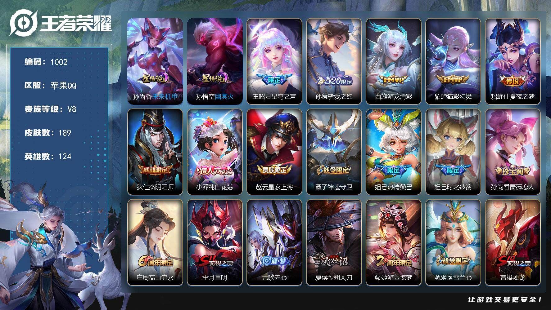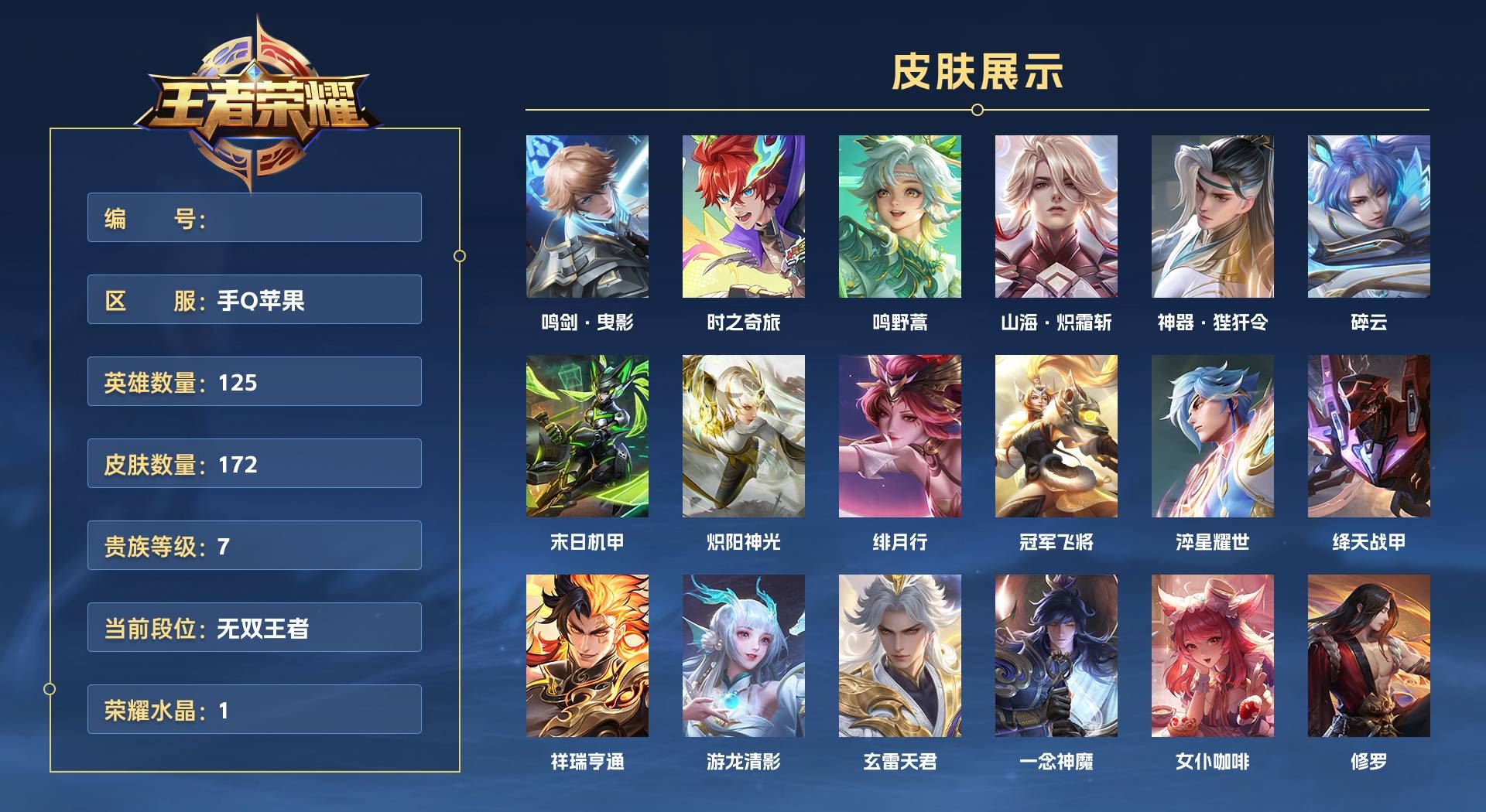【账号佳】 【可二次实名】手Q苹果 125英雄 172皮肤 贵族等级7 已兑换荣耀水晶数1 鸣剑·曳影 时之奇旅 鸣野蒿 山海·炽霜斩 神器·狴犴令 碎云 末日机甲 炽阳神光 绯月行 冠军飞将 淬星耀世 绛天战甲 祥瑞亨通 游龙清影 玄雷天君 一念神魔 女仆咖啡 修罗 冰雪圆舞曲 绅士熊喵 末日机甲 节奏热浪 鬼剑武藏 金属风暴 地狱岩魂 魅力维加斯 曙光守护者 赏金猎手 顽趣 无心 晚萤 功夫厨神 摇滚巨星 圣诞恋歌 雪上飞焰 箭羽风息 猫狗日记 天才门将 冰冠公主 紫霞仙子 江河有灵 匿光侦查者 地狱燃心 百解令 灵卜魔法 燃音魔法 妄想食味 百相守梦 苍鳞隐世 飞车小橘子 茶境仙 化蝶舞 涂山容容 魔术师 落雪兰心 孙行者 阴阳师 暖冬·兔眠 暗影游猎 超时空战士 五谷丰年 李小龙 纤云弄巧 星界游侠 蔚蓝守将 海滩派对 傲雪梅枪 皇家上将 神器·万象笔 水晶猎龙者 劲辣红锅 拒霜思 金福满堂 铁骨偃魂 潮玩造梦师 无尽征程 灵野札记 春野闲踪 玫蓝誓约 西部游侠 万事如意 鲨炮海盗猫 汉昭烈帝 妄想特派 命运角斗场 破局者 海滩丽影 浪漫序章 花好人间 五福同心 暖冬絮语 幻夜行动 时空谍影 白色死神 决胜大满贯 死亡骑士 鸿运当头 完美运算 功夫炙烤 爱心护理 漠中幻影 无尽旅途 暗都幽影 天使之翼 忍·炎影 潮玩探月行 红桃皇后 百相守梦 化身博士 逐霄战戟 牛运亨通 街头霸王 拳王 乐园追猎者 访茗客 少女阿狸 雪境奇遇 万象初新 黄金武士 星梦巡礼 玩偶对对碰 魅影绮裳 太极少年 功夫老勺 虹云星官 缤纷绘卷 救世之瞳 兔女郎 苍林狼骑 龙腾万里 天穹祈灯 海盐诗旅 虚灵犬护 流音漫舞 擒涛扼浪 古海寻踪 探海日志 噬灭天穹 剑破天穹 逆浪荇歌 原初追逐者 谧流熔炉 云中旅人