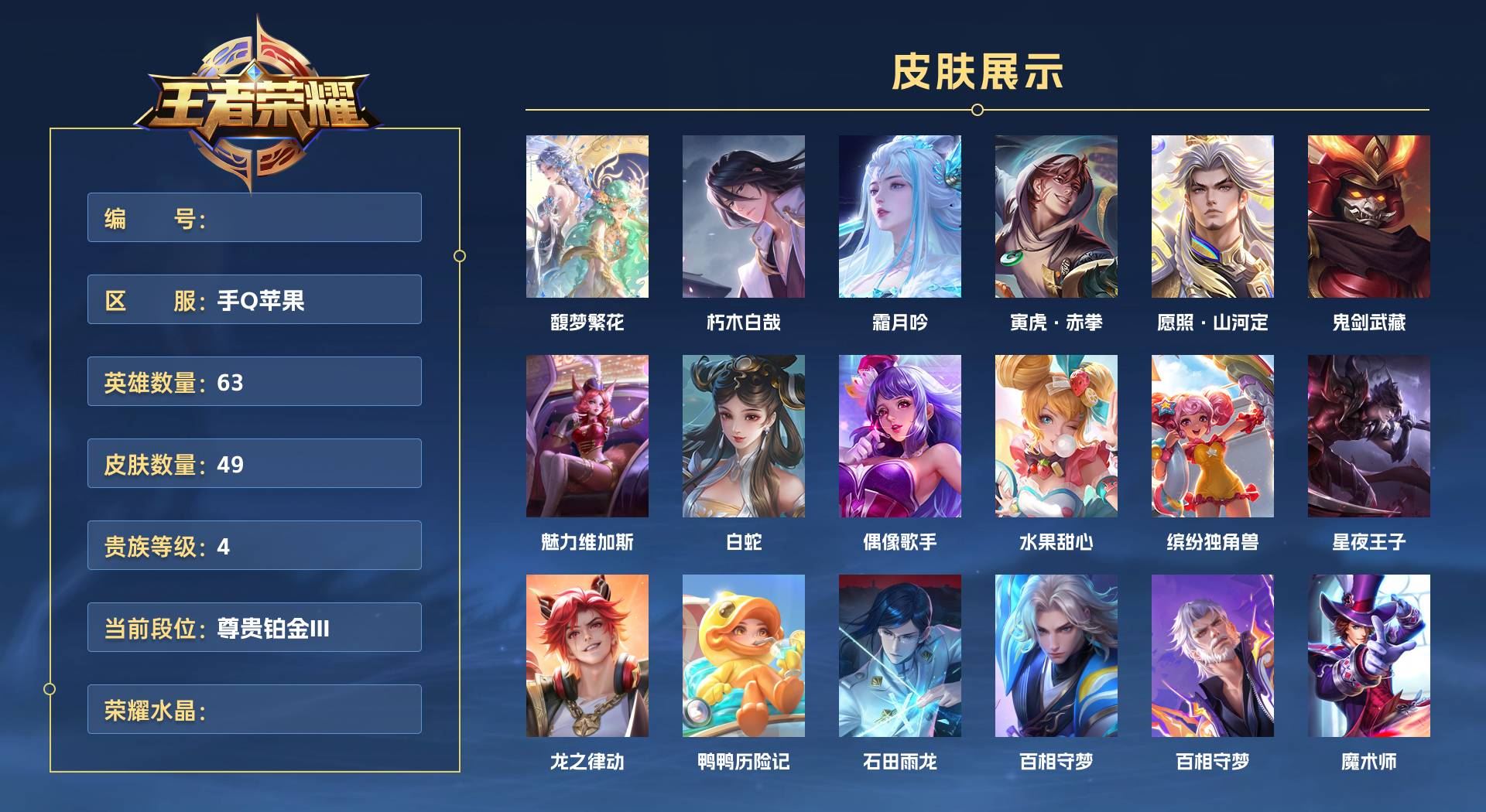 【账号佳】 【可包人脸】手Q苹果 63英雄 49皮肤 贵族等级4 馥梦繁花 朽木白哉 霜月吟 寅虎·赤拳 愿照·山河定 鬼剑武藏 魅力维加斯 白蛇 偶像歌手 水果甜心 缤纷独角兽 星夜王子 龙之律动 鸭鸭历险记 石田雨龙 百相守梦 百相守梦 魔术师 奇幻香踪 云间偶戏 驭风魔法 海滩派对 至尊宝 皇家上将 踏浪烽翎 鸭鸭历险记 零食大作战 布丁狗之约 命运加冕 小满鸭 戏梦巡演 死霸装 百相守梦 锦麟游梦 白执事 克喵 拳王 万象初新 野性能量 虚灵犬护 逆浪荇歌