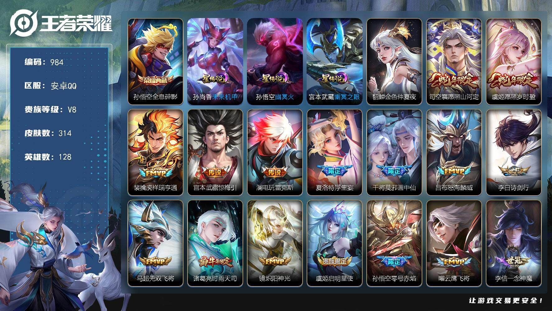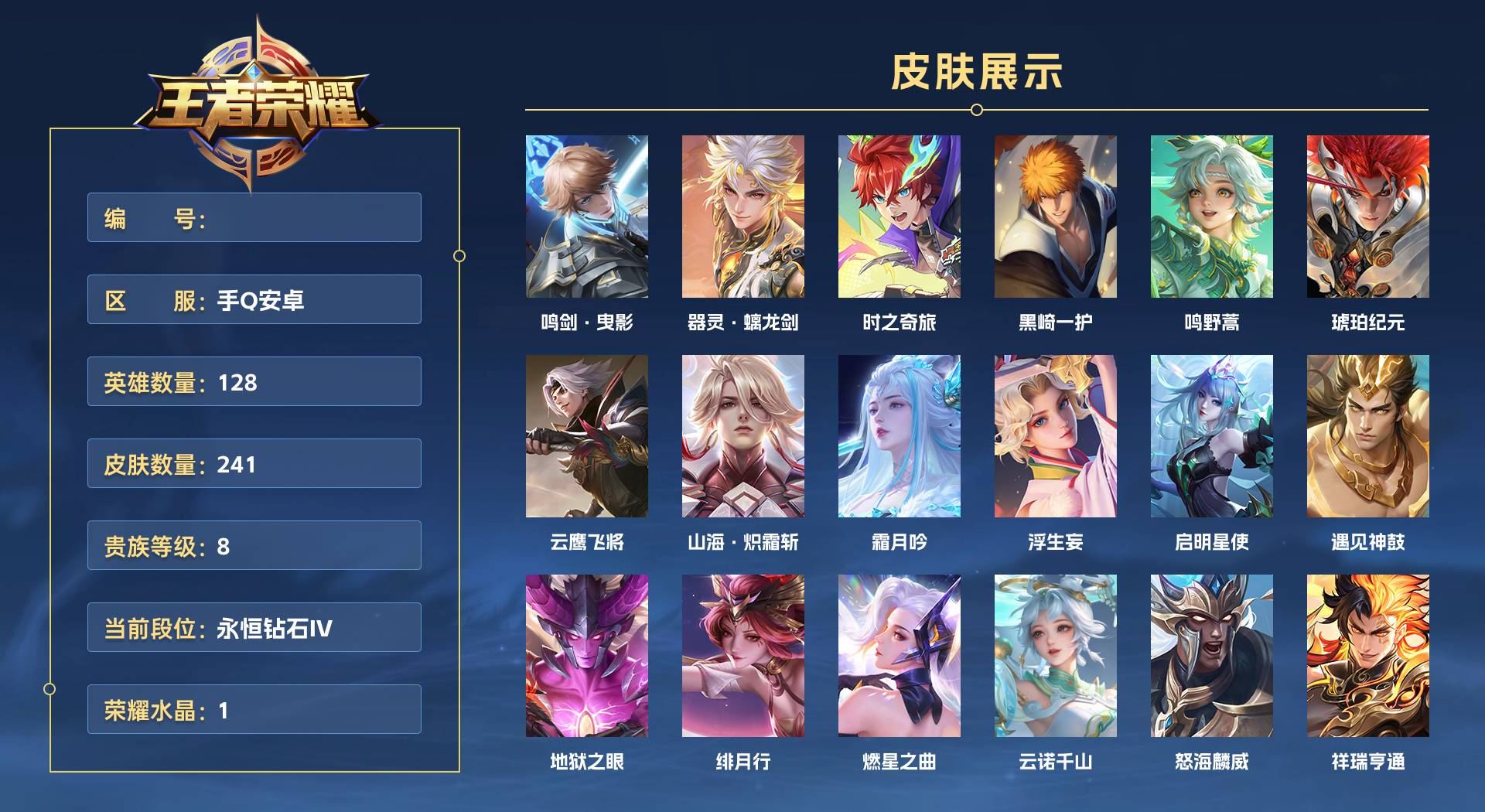 【账号佳】 【可包人脸】手Q安卓 128英雄 241皮肤 贵族等级8 已兑换荣耀水晶数1 鸣剑·曳影 器灵·螭龙剑 时之奇旅 黑崎一护 鸣野蒿 琥珀纪元 云鹰飞将 山海·炽霜斩 霜月吟 浮生妄 启明星使 遇见神鼓 地狱之眼 绯月行 燃星之曲 云诺千山 怒海麟威 祥瑞亨通 愿照·山河定 黄金狮子座 愿照·千秋盛 愿照·福禄聚 愿照·岁时盈 愿照·众生和 幻光神枪 愿照·九州拓 地狱火 修罗 冰雪圆舞曲 苍穹之光 绅士熊喵 特工魅影 暗隐猎兽者 节奏热浪 未来纪元 鬼剑武藏 金属风暴 地狱岩魂 乐园奇幻夜 曙光守护者 赏金猎手 幽灵船长 乘风破浪 无心 功夫厨神 黄金分割率 心灵骇客 逐浪之夏 心灵战警 水果甜心 无限星赏官 天才门将 冰冠公主 玩趣恶龙 千年之狐 紫霞仙子 星夜王子 江河有灵 百解令 荣光圣徽 妄想食味 蔬乡物语 青焰无极 决胜骁骑 夏日便利店 埋骨钱 破空之剑 谪仙醉月 星界特工 苍鳞隐世 茶境仙 器灵·浮梦炉 龙之律动 雪豹·霜爪 化蝶舞 鸭鸭历险记 藏狐·褐绒 石田雨龙 魔术师 阴阳师 朔望之晖 沉稳之力 火炮绅士 霸王丸 玲珑珍味 驭风魔法 五谷丰年 李小龙 梁祝 海滩派对 乓乓大师 皇家上将 水晶猎龙者 劲辣红锅 幻夜卜梦 守护之力 金福满堂 特工战影 教廷特使 鹤鸣心笺 铁骨偃魂 灵野札记 春野闲踪 无双福将 玫蓝誓约 鸭鸭历险记 鲨炮海盗猫 秘证寻踪 虎啸剑宗 汉昭烈帝 妄想特派 命运角斗场 景韶洛都 海滩丽影 浪漫序章 花好人间 五福同心 幻夜行动 布丁狗之约 白色死神 命运加冕 潮玩士官长 鸿运当头 功夫炙烤 金色潮汐 小满鸭 暗都幽影 龙舞盛年 黑桃队长 死霸装 群星魔术团 天使之翼 忍·炎影 线条小狗 苍威无极 蔬乡物语 熔金海岸 夏日便利店 白执事 云械蓝图 潮玩探月行 神迹守卫 大发明家 化身博士 逐霄战戟 爆裂喵拳 牛运亨通 街头霸王 拳王 奇妙博物学 访茗客 少女阿狸 哥特玫瑰 幻泉雾影 万象初新 星梦巡礼 魅影绮裳 西部大镖客 次元突破 功夫老勺 胡桃夹子 幻想奇妙夜 丁香结 虹云星官 野性能量 未来纪元 幻乐之宴 秘密基地 纽约教父 缤纷绘卷 兔女郎 龙腾万里 灵卦秘语 天穹祈灯 海盐诗旅 金庭之子 虚灵犬护 擒涛扼浪 沙漠行僧 聚星闪耀 古海寻踪 原初探秘者 探海日志 荣光之誓 演武夺筹 混沌棋 噬灭天穹 大漠名商 天穹之誓 驱傩正仪 醍醐杖 剑破天穹 万华元夜 星界战将 逆浪荇歌 原初追逐者 谧流熔炉 云中旅人 千军破阵 疑决卦 朔风刀