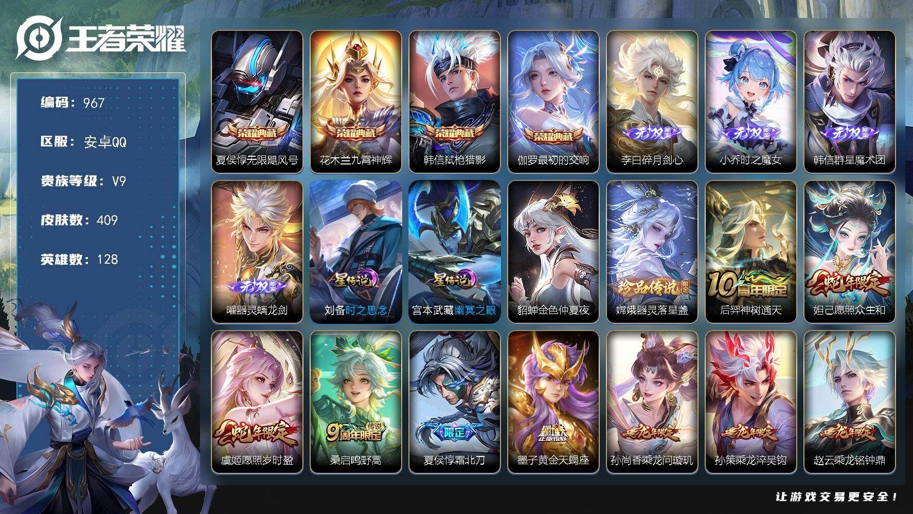 【账号佳】 【可二次实名】R51353 可二次安卓Q【营地:327036206】-V9-至尊星耀IV段位-128英雄-409皮肤-4典藏皮肤-4无双-1珍品传说-37传说-126史诗【英雄全皮】:孙权全皮,橘右京全皮,李信全皮,金蝉全皮,空空儿全皮,影全皮【荣耀典藏】:夏侯惇无限飓风号,花木兰九霄神辉,韩信弑枪猎影,伽罗最初的交响【无双皮肤】:李白碎月剑心,小乔时之魔女,韩信群星魔术团,曜器灵螭龙剑【珍品传说】:嫦娥器灵落星盏【传说皮肤】:后羿神树通天,妲己愿照众生和,虞姬愿照岁时盈,桑启鸣野蒿,夏侯惇霜北刀,墨子黄金天蝎座,孙尚香乘龙问璇玑,孙策乘龙淬吴钩,赵云乘龙铭钟鼎,马超琥珀纪元,澜逐花归海,露娜霜月吟,狄仁杰夜礼服假面,王昭君永恒水手月亮,吕布遇见神鼓,宫本武藏惊梅引,诸葛亮鹤羽星尊,澜电玩雷克斯,夏洛特浮生妄,李信山海炽霜斩,李白诗剑行,不知火舞绯月行,橘右京枫霜尽,孙策挚爱之约,曜李逍遥 ,李元芳飞鸢探春,镜炽阳神光,虞姬启明星使,李信一念神魔,刘备时之恋人,虞姬云霓雀翎,达摩黄金狮子座,花木兰冠军飞将,梦奇胖达荣荣,后羿黄金射手座,貂蝉仲夏夜之梦,宫本武藏地狱之眼【限定皮肤】:白起狰,夏侯惇霜北刀,赵云龙胆,墨子神迹守卫,嬴政优雅恋人,嬴政白昼王子,孙尚香蔷薇恋人,庄周云端筑梦师,庄周高山流水,吕布遇见神鼓,元歌云间偶戏,元歌无心,夏侯惇朔风刀,甄姬游园惊梦,甄姬落雪兰心,典韦岱宗,关羽冰锋战神,关羽百相守梦,程咬金演武夺筹,韩信傲雪梅枪,兰陵王金庭之子,花木兰默契交锋,不知火舞绯月行,橘右京枫霜尽,亚瑟潮玩骑士王,孙悟空孙行者,后羿圣弓游侠,刘备百相守梦,李元芳云中旅人,虞姬启明星使,钟馗驱傩正仪,杨玉环遇见飞天,鬼谷子五谷丰年,诸葛亮鹤羽星尊,黄忠烈魂,铠青龙志,公孙离玉兔公主,裴擒虎李小龙,云中君纤云弄巧,李信山海炽霜斩,盾山御銮,孙策挚爱之约,猪八戒西部大镖客,上官婉儿梁祝,嫦娥拒霜思,嫦娥暖冬兔眠,曜李逍遥 ,西施至美乘鲤谣,蒙犽狂想玩偶喵,鲁班大师探海日志,桑启海盐诗旅,夏洛特浮生妄,金蝉唐三藏,暃星界游侠,艾琳流音漫舞,赵怀真鹤归松栖,司空震地狱燃心,阿古朵江河有灵,张良古海寻踪,王昭君永恒水手月亮,狄仁杰夜礼服假面,蒙犽百解令,蒙恬荣光圣徽,高渐离燃音魔法,妲己灵卜魔法,鬼谷子天穹祈灯,李白碎月剑心,马超琥珀纪元,姬小满妄想食味,小乔时之魔女,大乔乘龙忆丹青,安琪拉乘龙聚宝船,孙尚香乘龙问璇玑,孙策乘龙淬吴钩,赵云乘龙铭钟鼎,沈梦溪龙舞盛年,鲁班七号蔬乡物语,李元芳蔬乡物语,刘邦剑破天穹,上官婉儿群星魔术团,程咬金群星魔术团,韩信群星魔术团,镜青焰无极,项羽苍威无极,周瑜熔金海岸【年限皮肤】:铠青龙志,典韦岱宗,李信山海炽霜斩,马可波罗山海玄木吟,孙尚香乘龙问璇玑,孙策乘龙淬吴钩,赵云乘龙铭钟鼎,大乔乘龙忆丹青,安琪拉乘龙聚宝船,妲己愿照众生和,虞姬愿照岁时盈,各种道具详情看截图、低价出售找回包 赔、截图展示段位不代 表实际段位,如赛季更新等不可抗拒因素发生变化、时限道具不保证所剩时间、标题未写送点劵默认不送【卖号买号首选亿梦】