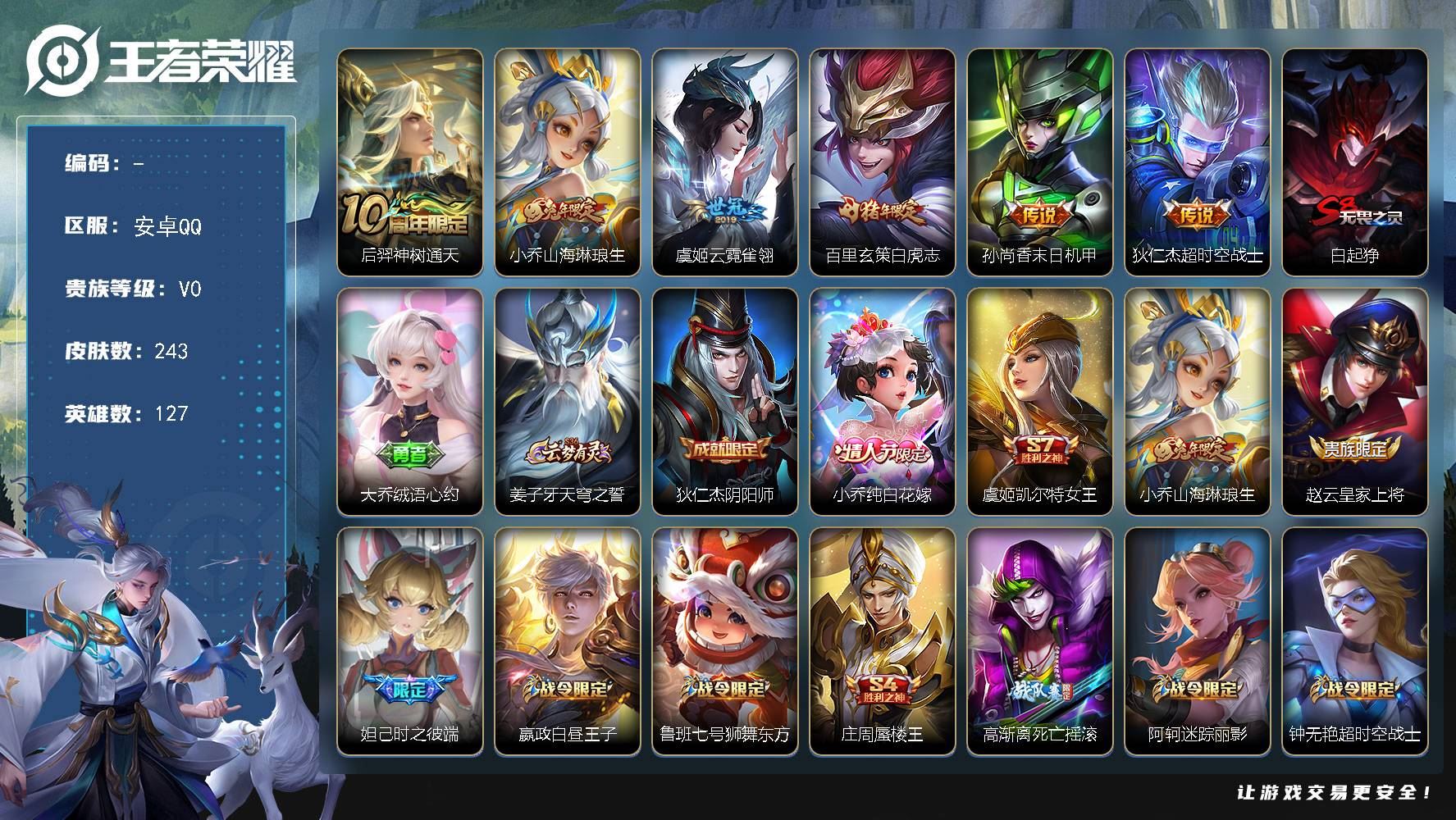 【账号佳】 【可包人脸】安卓Q V0 荣耀黄金I段位 127英雄 243皮肤 0典藏 0珍品无双 0无双 0珍品传说 6传说 51史诗大区:安卓Q,营地:224081441,贵族等级:0,【热门皮肤】:,【限定皮肤】:桑启线条小狗,鲁班七号班班快跑,后羿神树通天,艾琳鹤鸣心笺,扁鹊救世之瞳,牛魔西部大镖客,韩信街头霸王,姜子牙星梦巡礼,艾琳女武神,莱西奥西部游侠,典韦铁骨偃魂,苍苍林狼骑,赵云忍·炎影,后羿完美运算,鲁班大师乓乓大师,大乔绒语心约,周瑜熔金海岸,姜子牙天穹之誓,廉颇功夫炙烤,刘邦剑破天穹,程咬金无双福将,甄姬花好人间,花木兰兔女郎,鲁班大师探海日志,姬小满零食大作战,裴擒虎擒涛扼浪,宫本武藏未来纪元,刘禅秘密基地,白起乐园追猎者,亚瑟心灵战警,瑶山海·碧波行,小乔山海·琳琅生,猪八戒潮玩探月行,桑启海盐诗旅,海月幻泉雾影,钟无艳超时空战士,鬼谷子五谷丰年,刘备潮玩造梦师,苏烈坚韧之力,李元芳云中旅人,戈娅危途狂花,甄姬落雪兰心,程咬金演武夺筹,狄仁杰万华元夜,云中君纤云弄巧,蒙犽狂想玩偶喵,项羽科学大爆炸,姜子牙炽热元素使,大乔守护之力,鬼谷子原初探秘者,雅典娜单词大作战,百里玄策原初追逐者,猪八戒西部大镖客,马可波罗暗影游猎,廉颇无尽征程,白起白色死神,老夫子醍醐杖,狂铁命运角斗场,阿轲迷踪丽影,盾山圆桌骑士,明世隐疑决卦,刘邦夺宝奇兵,李元芳银河之约,哪吒次元突破,后羿如梦令,安琪拉玩偶对对碰,妲己时之彼端,姜子牙时尚教父,貂蝉圣诞恋歌,韩信飞衡,孙膑天使之翼,鲁班七号黑桃队长,弈星混沌棋,沈梦溪星空之诺,太乙真人华丽摇滚,蔡文姬繁星吟游,兰陵王驯魔猎人,程咬金星际陆战队,王昭君幻想奇妙夜,上官婉儿梁祝【荣耀典藏】:【截图或标题展示段位不代表实际段位,赛季更新等不可抗拒因素发生变化、时限道具不保证所剩时间,详情请看截图哦~】