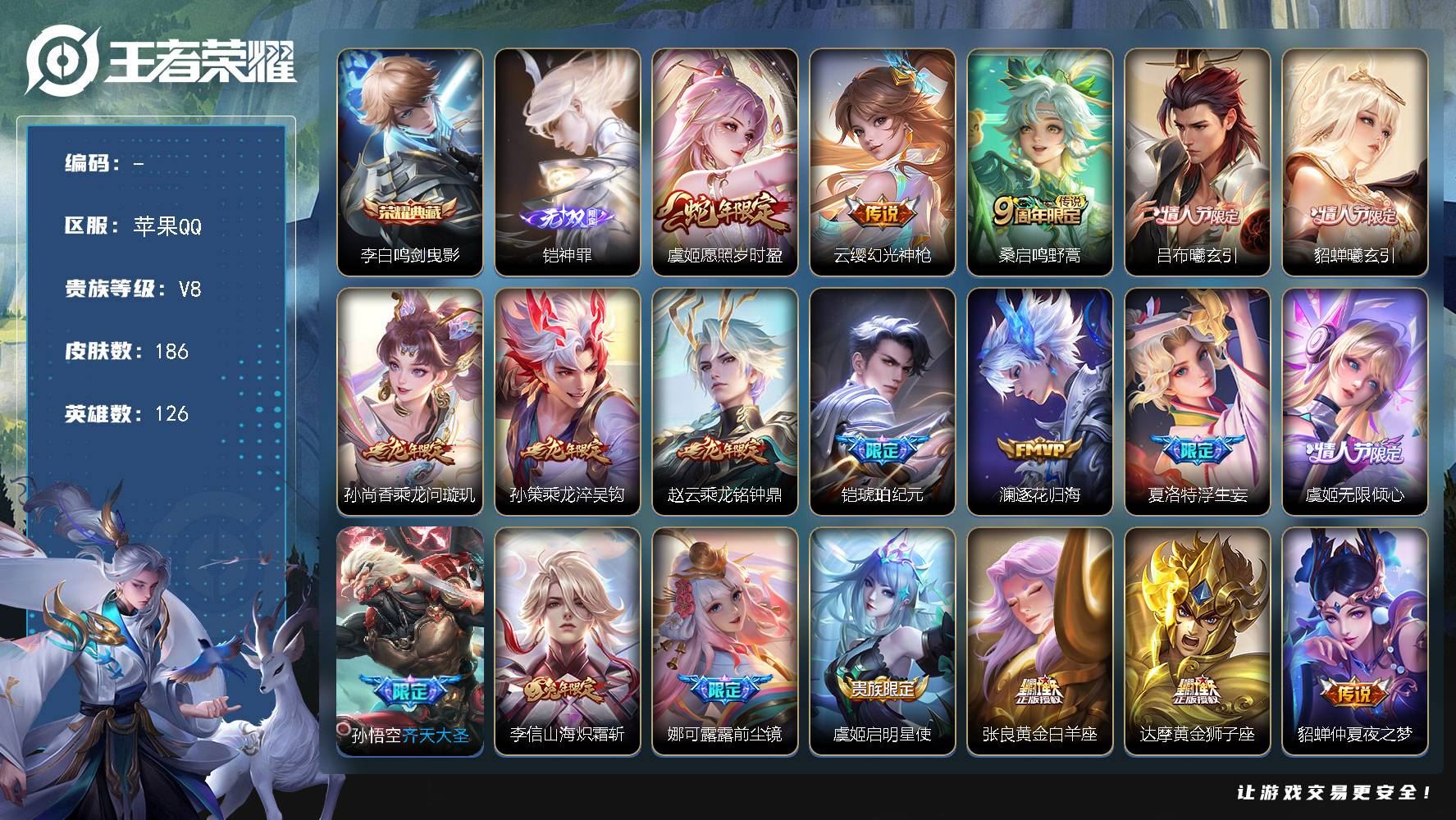 【账号佳】 【可二次实名】手Q苹果 126英雄 196皮肤 贵族等级8 已兑换荣耀水晶数2 全息碎影 九霄神辉 乘龙·问璇玑 逐花归海 寅虎·赤拳 祈雪灵祝 启明星使 时之奇旅 末日机甲 音你心动 超时空战士 游龙清影 无双飞将 神树通天 女仆咖啡 圣诞狂欢 冰雪圆舞曲 特工魅影 末日机甲 暗隐猎兽者 节奏热浪 未来纪元 鬼剑武藏 电玩小子 曙光守护者 暗夜贵公子 幽灵船长 暗夜猫娘 摇滚巨星 黄金分割率 逐浪之夏 水果甜心 箭羽风息 缤纷独角兽 冰冠公主 紫霞仙子 星夜王子 电玩·爆裂旋风 末日机甲 江河有灵 地狱燃心 百解令 灵卜魔法 燃音魔法 荣光圣徽 雪夜绮愿 琥珀纪元 万物之道 百相守梦 魔术师 高山流水 阴阳师 玲珑珍味 驭风魔法 辉光之辰 李小龙 纤云弄巧 蔚蓝守将 海滩派对 乓乓大师 繁星吟游 匿光破解者 皇家上将 烈魂 水晶猎龙者 劲辣红锅 拒霜思 踏浪烽翎 守护之力 敏锐之力 特工战影 教廷特使 鹤鸣心笺 星际陆战队 铁骨偃魂 线条小狗 坚韧之力 西部游侠 万事如意 汉昭烈帝 妄想特派 命运角斗场 海滩丽影 花好人间 五福同心 暖冬絮语 幻夜行动 径山谋武 时空谍影 白色死神 决胜大满贯 鸿运当头 完美运算 功夫炙烤 爱心护理 金色潮汐 漠中幻影 危途狂花 龙舞盛年 天使之翼 忍·炎影 熔金海岸 白执事 潮玩探月行 红桃皇后 化身博士 街头霸王 拳王 乱世虎臣 罗小黑战记 哥特玫瑰 雪境奇遇 万象初新 星梦巡礼 玩偶对对碰 西部大镖客 功夫老勺 虹云星官 野性能量 未来纪元 幻乐之宴 秘密基地 掌控之力 缤纷绘卷 兔女郎 苍林狼骑 龙腾万里 天穹祈灯 海盐诗旅 虚灵犬护 流音漫舞 擒涛扼浪 古海寻踪 探海日志 荣光之誓 九幽镇关 天穹之誓 剑破天穹 逆浪荇歌 原初追逐者 谧流熔炉