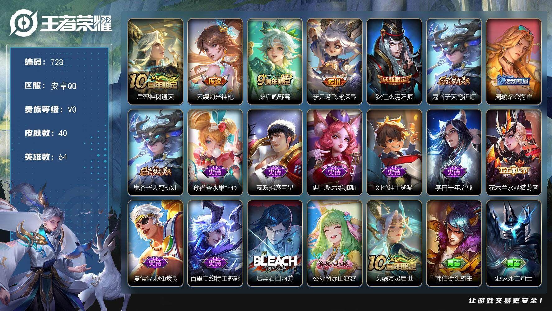 【账号佳】 【可二次实名】R50267 可二次安卓Q【营地:1605301964】-V0-永恒钻石II段位-64英雄-40皮肤-4传说-11史诗【传说皮肤】:后羿神树通天,云缨幻光神枪,桑启鸣野蒿,李元芳飞鸢探春【限定皮肤】:狄仁杰阴阳师,鬼谷子天穹祈灯,周瑜熔金海岸【赛季限定】:鬼谷子天穹祈灯【史诗皮肤】:孙尚香水果甜心,嬴政摇滚巨星,妲己魅力维加斯,刘禅绅士熊喵,李白千年之狐,花木兰水晶猎龙者,夏侯惇乘风破浪,百里守约特工魅影,后羿石田雨龙,公孙离涂山容容,女娲万灵启世,各种道具详情看截图、低价出售找回包 赔、截图展示段位不代 表实际段位,如赛季更新等不可抗拒因素发生变化、时限道具不保证所剩时间、标题未写送点劵默认不送【卖号买号首选亿梦】