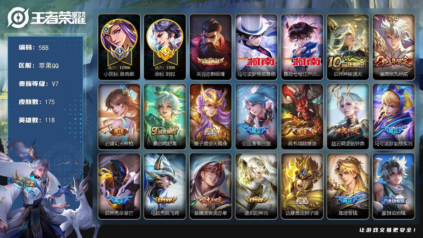 【账号佳】 【可二次实名】r49629 可二次 苹果Q-V7-最强王者段位-118英雄-175皮肤-1典藏皮肤-2珍品传说-14传说-62史诗【小国标】:小国标雅典娜【金标】:金标刘邦【英雄全皮】:刘邦全皮,镜全皮,赵怀真全皮,影全皮【荣耀典藏】:关羽赤影疾锋【珍品传说】:马可波罗怪盗基德,鲁班七号江户川柯南【传说皮肤】:后羿神树通天,澜愿照九州拓,云缨幻光神枪,桑启鸣野蒿,墨子黄金天蝎座,亚连落雪白狼,典韦战鼓燎原,赵云乘龙铭钟鼎,马可波罗妄想实况,后羿无尽星芒,马超无双飞将,裴擒虎寅虎赤拳,镜炽阳神光,达摩黄金狮子座 【史诗皮肤】:赵云皇家上将,甄姬冰雪圆舞曲,狄仁杰魔术师,廉颇地狱岩魂,宫本武藏鬼剑武藏,孙尚香水果甜心,嬴政摇滚巨星,墨子金属风暴,吕布圣诞狂欢,曹操幽灵船长,吕布末日机甲,赵云引擎之心,花木兰水晶猎龙者,刘邦德古拉伯爵,夏侯惇乘风破浪,兰陵王暗隐猎兽者,诸葛亮黄金分割率,甄姬游园惊梦,亚瑟心灵战警,雅典娜冰冠公主,百里守约特工魅影,铠曙光守护者,刘禅天才门将,李元芳逐浪之夏,白起星夜王子,阿轲节奏热浪,狄仁杰鹰眼统帅,李元芳银河之约,云中君纤云弄巧,沈梦溪月团寄思,孙悟空孙行者,司马懿暗渊魔法,嫦娥拒霜思,镜匿光追影者,雅典娜黎明之约,夏洛特永昼,弈星滕王阁序,暃星界游侠,镜玫瑰异探,戈娅驭风魔法,镜真我赫兹,赵怀真鹤归松栖,司空震地狱燃心,阿古朵江河有灵,蒙犽百解令,妲己灵卜魔法,高渐离燃音魔法,姬小满妄想食味,鲁班七号蔬乡物语,镜青焰无极,关羽决胜骁骑,蔡文姬夏日便利店,蒙犽顽岩魄,暃埋骨钱,廉颇撼地雄心,亚连破空之剑,李白谪仙醉月,百里守约百相守梦,牛魔星界战将,孙膑茶境仙,赵怀真器灵浮梦炉,阿轲化蝶舞,后羿石田雨龙 【内测皮肤】:狂铁特工战影【营地ID】:1701901689 各种道具详情看截图、低价出售找回包 赔、截图展示段位不代 表实际段位,如赛季更新等不可抗拒因素发生变化、时限道具不保证所剩时间、标题未写送点劵默认不送【卖号买号首选亿梦】