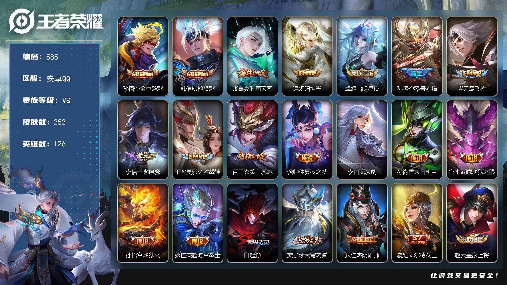 【账号佳】 【可二次实名】r49619 可二次 安卓Q-V8-最强王者段位-126英雄-252皮肤-2典藏皮肤-14传说-55史诗【荣耀典藏】:孙悟空全息碎影,韩信弑枪猎影【传说皮肤】:诸葛亮时雨天司,镜炽阳神光,虞姬启明星使,孙悟空零号赤焰,曜云鹰飞将,李信一念神魔,干将莫邪久胜战神,百里玄策白虎志,貂蝉仲夏夜之梦,李白凤求凰,孙尚香末日机甲,宫本武藏地狱之眼,孙悟空地狱火,狄仁杰超时空战士 【史诗皮肤】:露娜紫霞仙子,赵云皇家上将,甄姬冰雪圆舞曲,王昭君偶像歌手,狄仁杰魔术师,廉颇地狱岩魂,宫本武藏鬼剑武藏,孙尚香水果甜心,嬴政摇滚巨星,墨子金属风暴,李白千年之狐,张飞乱世虎臣,项羽霸王别姬,虞姬霸王别姬,刘邦德古拉伯爵,韩信逐梦之影,兰陵王暗隐猎兽者,甄姬游园惊梦,雅典娜冰冠公主,后羿辉光之辰,百里守约特工魅影,哪吒逐梦之翼,阿轲节奏热浪,杨玉环遇见飞天,东皇太一逐梦之光,嬴政白昼王子,孙策猫狗日记,铠青龙志,孙悟空大圣娶亲,伽罗箭羽风息,狄仁杰鹰眼统帅,公孙离无限星赏官,上官婉儿梁祝,蔡文姬繁星吟游,李元芳银河之约,韩信飞衡,阿轲迷踪丽影,橘右京修罗,上官婉儿天狼绘梦者,马可波罗暗影游猎,蒙犽狂想玩偶喵,百里玄策原初追逐者,裴擒虎李小龙,云中君纤云弄巧,孙膑天狼运算者,元歌云间偶戏,芈月白晶晶,牛魔奔雷神使,吕布御风骁将,花木兰默契交锋,雅典娜黎明之约,鬼谷子五谷丰年,弈星万物之道,狂铁龙之律动,女娲万灵启世 【内测皮肤】:高渐离玩趣恶龙,狂铁特工战影【营地ID】:336762392 各种道具详情看截图、低价出售找回包 赔、截图展示段位不代 表实际段位,如赛季更新等不可抗拒因素发生变化、时限道具不保证所剩时间、标题未写送点劵默认不送【卖号买号首选亿梦】