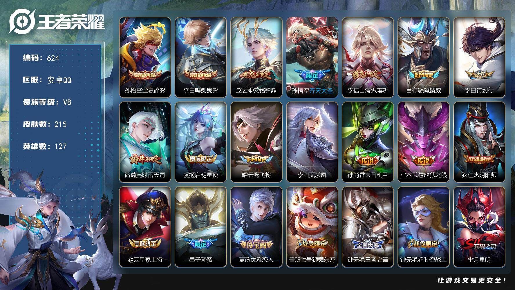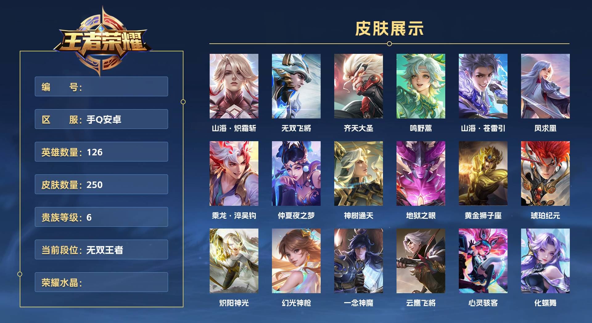 【账号佳】 【可二次实名】手Q安卓 126英雄 250皮肤 贵族等级6 山海·炽霜斩 无双飞将 齐天大圣 鸣野蒿 山海·苍雷引 凤求凰 乘龙·淬吴钩 仲夏夜之梦 神树通天 地狱之眼 黄金狮子座 琥珀纪元 炽阳神光 幻光神枪 一念神魔 云鹰飞将 心灵骇客 化蝶舞 心灵战警 水果甜心 箭羽风息 永昼 特工魅影 猫狗日记 缤纷独角兽 龙之律动 玩趣恶龙 琥珀纪元 千年之狐 紫霞仙子 星夜王子 妄想食味 电玩·爆裂旋风 地狱燃心 燃音魔法 百解令 灵卜魔法 魅力维加斯 光弋星穹 天秀·启明 冰雪圆舞曲 末日机甲 曙光守护者 遇见神鹿 暗隐猎兽者 赏金猎手 白龙吟 幽灵船长 乘风破浪 龙骑士 修罗 节奏热浪 未来纪元 无心 月团寄思 时之恋人 女仆咖啡 鬼剑武藏 涂山容容 万灵启世 热力回旋 埋骨钱 夏日便利店 金属风暴 地狱岩魂 偶像歌手 黄金分割率 霸王丸 阴阳师 魔术师 暖冬·兔眠 蔚蓝守将 青春决赛季 电玩高手 华尔街大亨 拒霜思 水晶猎龙者 午后时光 乓乓大师 海滩派对 梁祝 纤云弄巧 五谷丰年 李小龙 劲辣红锅 皇家上将 百相守梦 猪悟能 至尊宝 山海·玄木吟 沉稳之力 星界游侠 死亡骑士 暖冬絮语 白色死神 危途狂花 忍·炎影 契约魔法 潮玩探月行 化身博士 牛运亨通 克喵 踏浪烽翎 海滩丽影 天使之翼 鹤鸣心笺 白执事 往忆晖光 红桃皇后 径山谋武 瓷语鉴心 时空谍影 破局者 妄想特派 零食大作战 无双福将 功夫炙烤 金色潮汐 阿尔法小队 漠中幻影 潮玩造梦师 龙舞盛年 教廷特使 特工战影 兔女郎 救世之瞳 缤纷绘卷 掌控之力 纽约教父 熔金海岸 夏日便利店 秘密基地 虹云星官 幻想奇妙夜 进击墨子号 功夫老勺 次元突破 敬我三分 炽热元素使 玩偶对对碰 黄金武士 万象初新 哥特玫瑰 爆裂喵拳 少女阿狸 乱世虎臣 乐园追猎者 雪境奇遇 拳王 星梦巡礼 街头霸王 归虚梦演 幻泉雾影 太极少年 野性能量 幻乐之宴 苍林狼骑 灵卦秘语 龙腾万里 万事如意 鲨炮海盗猫 虎啸剑宗 汉昭烈帝 胡桃狂想曲 花好人间 五福同心 流音漫舞 天穹祈灯 剑破天穹 沙漠行僧 聚星闪耀 古海寻踪 逆浪荇歌 御狮 噬灭天穹 朔风刀 探海日志 无畏之灵·狰 混沌棋 万华元夜 蜃楼王 疑决卦 原初追逐者 炼金王 驱傩正仪 谧流熔炉 金庭之子 饕餮 醍醐杖 御銮 御霄 天穹之誓 妖精王 重明 云中旅人 凯尔特女王 原初探秘者 穷奇 荣光之誓 千军破阵 海盐诗旅 烛龙 擒涛扼浪 大漠名商 演武夺筹