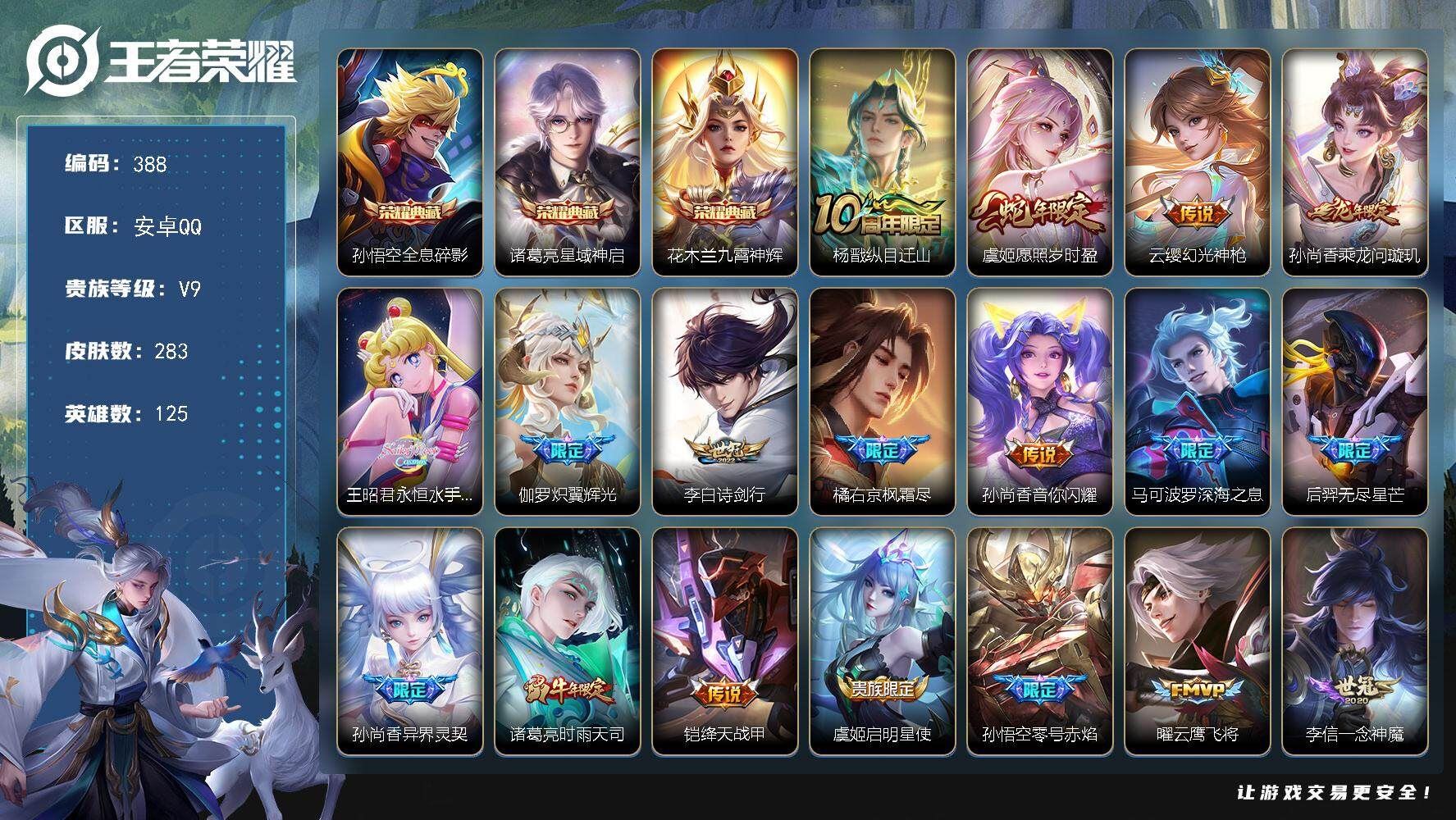 【账号佳】 【可二次实名】R48865 可二次安卓Q【营地:79152592】-V9-至尊星耀V段位-125英雄-283皮肤-3典藏皮肤-27传说-86史诗【英雄全皮】:猪八戒全皮,蒙恬全皮,少司缘全皮【荣耀典藏】:孙悟空全息碎影,诸葛亮星域神启,花木兰九霄神辉【传说皮肤】:杨戬纵目迁山,虞姬愿照岁时盈,云缨幻光神枪,孙尚香乘龙问璇玑,王昭君永恒水手月亮,伽罗炽翼辉光,李白诗剑行,橘右京枫霜尽,孙尚香音你闪耀,马可波罗深海之息,后羿无尽星芒,孙尚香异界灵契,诸葛亮时雨天司,铠绛天战甲,虞姬启明星使,孙悟空零号赤焰,曜云鹰飞将,李信一念神魔,刘备时之恋人,伽罗太华,虞姬云霓雀翎,达摩黄金狮子座,百里玄策白虎志,后羿黄金射手座,孙尚香末日机甲,孙悟空地狱火,狄仁杰超时空战士【限定皮肤】:狄仁杰阴阳师,赵云皇家上将,嬴政白昼王子,孙尚香蔷薇恋人,孙尚香异界灵契,鲁班七号狮舞东方,庄周高山流水,阿轲迷踪丽影,马可波罗暗影游猎,马可波罗深海之息,马可波罗山海玄木吟,狄仁杰魔术师,狄仁杰万华元夜,项羽海滩派对,老夫子醍醐杖,关羽冰锋战神,韩信飞衡,王昭君午后时光,兰陵王金庭之子,花木兰瑞麟志,橘右京枫霜尽,孙悟空至尊宝,孙悟空大圣娶亲,孙悟空零号赤焰,牛魔御旌,后羿无尽星芒,李元芳银河之约,李元芳云中旅人,虞姬启明星使,钟馗神迹守卫,钟馗驱傩正仪,杨玉环遇见飞天,女娲朔望之晖,鬼谷子原初探秘者,鬼谷子五谷丰年,诸葛亮时雨天司,黄忠烈魂,黄忠火炮绅士,苏烈千军破阵,百里玄策白虎志,百里玄策原初追逐者,百里守约朱雀志,弈星混沌棋,沈梦溪星空之诺,沈梦溪大漠名商,明世隐疑决卦,裴擒虎李小龙,裴擒虎擒涛扼浪,狂铁御狮,狂铁电玩高手,米莱狄御霄,伽罗太华,伽罗天狼溯光者,伽罗炽翼辉光,盾山御銮,猪八戒西部大镖客,猪八戒猪悟能,鲁班大师探海日志,镜匿光追影者,桑启海盐诗旅,艾琳流音漫舞,司空震地狱燃心,阿古朵江河有灵,张良古海寻踪,王昭君永恒水手月亮,各种道具详情看截图、低价出售找回包 赔、截图展示段位不代 表实际段位,如赛季更新等不可抗拒因素发生变化、时限道具不保证所剩时间、标题未写送点劵默认不送【卖号买号首选亿梦】
