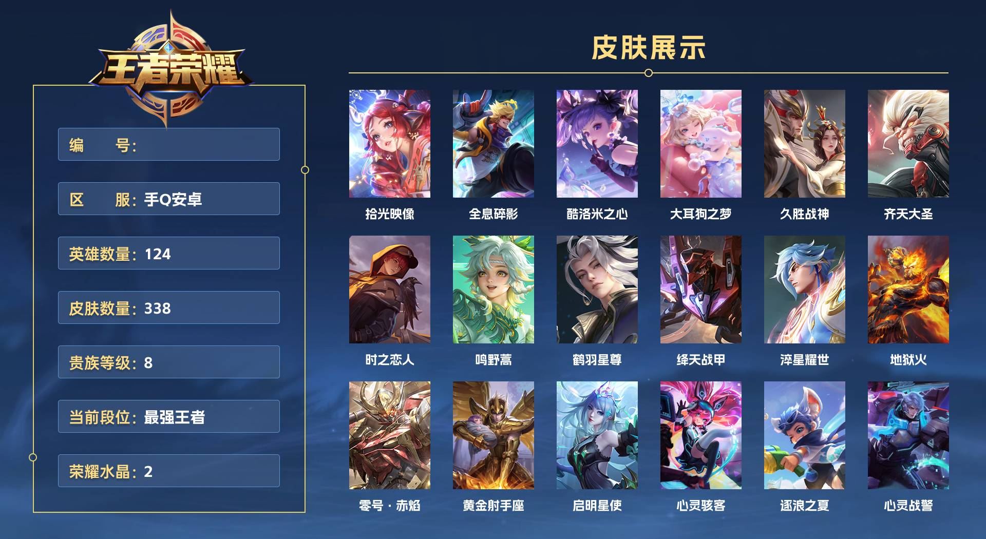 【账号佳】 【可二次实名】手Q安卓 124英雄 338皮肤 贵族等级8 已兑换荣耀水晶数2 拾光映像 全息碎影 酷洛米之心 大耳狗之梦 久胜战神 齐天大圣 时之恋人 鸣野蒿 鹤羽星尊 绛天战甲 淬星耀世 地狱火 零号·赤焰 黄金射手座 启明星使 心灵骇客 逐浪之夏 心灵战警 水果甜心 箭羽风息 青焰无极 永昼 蔬乡物语 无限星赏官 特工魅影 猫狗日记 唤灵魅影 天才门将 缤纷独角兽 冰冠公主 龙之律动 乐园奇幻夜 千年之狐 紫霞仙子 星夜王子 电玩·爆裂旋风 江河有灵 荣光圣徽 地狱燃心 燃音魔法 百解令 灵卜魔法 天秀·启明 冰雪圆舞曲 圣诞狂欢 末日机甲 茶境仙 曙光守护者 遇见神鹿 暗隐猎兽者 赏金猎手 苍穹之光 绅士熊喵 布丁狗之誓 暗渊魔法 青蛇 幽灵船长 乘风破浪 龙骑士 节奏热浪 暗夜猫娘 蔷薇恋人 未来纪元 无心 星界特工 月团寄思 时之恋人 谪仙醉月 功夫厨神 女仆咖啡 鬼剑武藏 猫狗日记 魅语 鸭鸭历险记 百相守梦 战舞者 破空之剑 撼地雄心 舞动绿茵 电玩小子 夏日便利店 金属风暴 德古拉伯爵 地狱岩魂 偶像歌手 决胜骁骑 摇滚巨星 圣诞恋歌 黄金分割率 怒海争锋 霸王丸 飞衡 阴阳师 魔术师 云间偶戏 蔚蓝守将 单词大作战 胡桃异想国 暗影游猎 孙行者 银河之约 拒霜思 水晶猎龙者 游园惊梦 冰霜恋舞曲 乓乓大师 海滩派对 梁祝 赤莲之焰 迷踪丽影 潮玩骑士王 纤云弄巧 美猴王 五谷丰年 李小龙 劲辣红锅 皇家上将 繁星吟游 岱宗 至尊宝 狮舞东方 驯魔猎人 潮玩骑兵 神迹守卫 西部大镖客 航海奇遇记 夺宝奇兵 星际陆战队 死亡摇滚 大圣娶亲 星空之诺 狂想玩偶喵 玲珑珍味 驭风魔法 死亡骑士 暖冬絮语 景韶洛都 白色死神 浪漫序章 布丁狗之约 忍·炎影 契约魔法 潮玩探月行 化身博士 牛运亨通 幽兰居士 黑猫爱糖果 大发明家 海滩丽影 天使之翼 白执事 黑桃队长 红桃皇后 瓷语鉴心 幻夜行动 时空谍影 决胜大满贯 破局者 热血海滩 妄想特派 零食大作战 无双福将 鸿运当头 坚韧之力 功夫炙烤 金色潮汐 潮玩牛仔 阿尔法小队 漠中幻影 东方不败 无尽征程 潮玩造梦师 经纬探寻者 无尽旅途 星际陆战队 春野之旅 暗都幽影 龙舞盛年 教廷特使 特工战影 敏锐之力 兔女郎 救世之瞳 缤纷绘卷 掌控之力 苍威无极 蔬乡物语 异域游侠 绒语心约 长夏之忆 纽约教父 熔金海岸 破阵·退雄兵 夏日便利店 秘密基地 未来纪元 虹云星官 次元傲视 幻想奇妙夜 神迹守卫 铁甲之心 功夫老勺 次元突破 敬我三分 西部大镖客 炽热元素使 动物派对 玩偶对对碰 黄金武士 怪诞之夜 百相守梦 万象初新 圆桌骑士 逐霄战戟 雾都夜雨 少女阿狸 乱世虎臣 奇妙博物学 访茗客 乐园追猎者 拳王 星梦巡礼 魅影绮裳 重装意志 街头霸王 幻泉雾影 胡桃夹子 野性能量 幻乐之宴 苍林狼骑 龙腾万里 铁骨偃魂 万事如意 鲨炮海盗猫 灵野札记 春野闲踪 汉昭烈帝 玫蓝誓约 胡桃狂想曲 鸭鸭历险记 秘证寻踪 唤灵魔甲 花好人间 流音漫舞 天穹祈灯 剑破天穹 王牌新星 聚星闪耀 古海寻踪 噬灭天穹 朔风刀 探海日志 混沌棋 万华元夜 疑决卦 驱傩正仪 谧流熔炉 醍醐杖 御銮 御霄 天穹之誓 云中旅人 原初探秘者 擒涛扼浪 演武夺筹 虚灵犬护