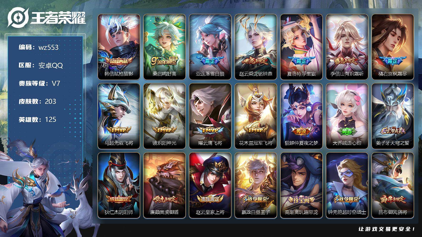 【账号佳】 【可二次实名】【wz553】【商品标题】:安卓Q-V7-至尊星耀III段位-125英雄-203皮肤-1典藏-0珍品无双-0无双-0珍品传说-11传说-58史诗 【荣耀典藏】:韩信弑枪猎影 【传说皮肤】:桑启鸣野蒿,亚连落雪白狼,赵云乘龙铭钟鼎,夏洛特浮生妄,李信山海炽霜斩,橘右京枫霜尽,马超无双飞将,镜炽阳神光,曜云鹰飞将,花木兰冠军飞将,貂蝉仲夏夜之梦 【限定皮肤】:大乔绒语心约,姜子牙天穹之誓,狄仁杰阴阳师,廉颇寅虎御盾,赵云皇家上将,嬴政白昼王子,高渐离玩趣恶龙,钟无艳超时空战士,吕布御风骁将,元歌无心,甄姬落雪兰心,马可波罗山海玄木吟,狄仁杰魔术师,狄仁杰万华元夜,达摩沙漠行僧,项羽海滩派对,程咬金演武夺筹,王昭君午后时光,兰陵王金庭之子,橘右京枫霜尽,李元芳匿光侦查者,李元芳云中旅人,钟馗驱傩正仪,杨玉环寅虎心曲,鬼谷子原初探秘者,鬼谷子五谷丰年,苏烈千军破阵,百里守约朱雀志,弈星混沌棋,沈梦溪大漠名商,明世隐疑决卦,裴擒虎李小龙,裴擒虎擒涛扼浪,狂铁电玩高手,云中君纤云弄巧,李信山海炽霜斩,嫦娥拒霜思,嫦娥暖冬兔眠,西施玲珑珍味,鲁班大师探海日志,桑启海盐诗旅,夏洛特浮生妄,暃星界游侠,戈娅驭风魔法,艾琳女武神,艾琳流音漫舞,司空震地狱燃心,阿古朵江河有灵,张良古海寻踪,蒙犽百解令,蒙恬荣光圣徽,高渐离燃音魔法,妲己灵卜魔法,鬼谷子天穹祈灯,伽罗琥珀纪元,赵云乘龙铭钟鼎,亚连落雪白狼,沈梦溪龙舞盛年,鲁班七号蔬乡物语,李元芳蔬乡物语,刘邦剑破天穹 【年限皮肤】:百里守约朱雀志,杨玉环寅虎心曲,廉颇寅虎御盾,吕布御风骁将,马可波罗山海玄木吟,李信山海炽霜斩,赵云乘龙铭钟鼎 【赛季限定】:狄仁杰万华元夜,达摩沙漠行僧,程咬金演武夺筹,兰陵王金庭之子,张良古海寻踪,李元芳云中旅人,钟馗驱傩正仪,鬼谷子原初探秘者,苏烈千军破阵,弈星混沌棋,沈梦溪大漠名商,明世隐疑决卦,裴擒虎擒涛扼浪,鲁班大师探海日志,桑启海盐诗旅,鬼谷子天穹祈灯,蒙恬荣光圣徽,刘邦剑破天穹,姜子牙天穹之誓 【战令限定】:嬴政白昼王子,钟无艳超时空战士,甄姬落雪兰心,王昭君午后时光,艾琳流音漫舞,狂铁电玩高手,嫦娥暖冬兔眠,西施玲珑珍味,司空震地狱燃心,暃星界游侠,戈娅驭风魔法,高渐离燃音魔法,妲己灵卜魔法,鲁班七号蔬乡物语,李元芳蔬乡物语 【史诗皮肤】:鲁班七号电玩小子,项羽苍穹之光,露娜紫霞仙子,赵云皇家上将,赵云未来纪元,甄姬冰雪圆舞曲,王昭君偶像歌手,狄仁杰魔术师,宫本武藏鬼剑武藏,孙尚香水果甜心,妲己魅力维加斯,妲己女仆咖啡,墨子金属风暴,吕布圣诞狂欢,花木兰水晶猎龙者,小乔缤纷独角兽,兰陵王暗隐猎兽者,诸葛亮黄金分割率,亚瑟心灵战警,安琪拉心灵骇客,百里守约特工魅影,铠曙光守护者,李元芳逐浪之夏,程咬金功夫厨神,白起星夜王子,阿轲节奏热浪,嬴政白昼王子,孙策猫狗日记,百里守约朱雀志,狄仁杰鹰眼统帅,娜可露露晚萤,裴擒虎李小龙,云中君纤云弄巧,吕布御风骁将,百里玄策热力回旋,嫦娥拒霜思,杨玉环寅虎心曲,廉颇寅虎御盾,狂铁电玩高手,钟无艳超时空战士,鬼谷子五谷丰年,元歌无心,暃星界游侠,马可波罗山海玄木吟,刘禅电玩爆裂旋风,戈娅驭风魔法,李元芳匿光侦查者,司空震地狱燃心,阿古朵江河有灵,蒙犽百解令,妲己灵卜魔法,高渐离燃音魔法,蒙恬荣光圣徽,伽罗琥珀纪元,鲁班七号蔬乡物语,牛魔星界战将,狂铁龙之律动,后羿石田雨龙,公孙离涂山容容 【其他皮肤】:项羽海滩派对,韩信教廷特使,韩信街头霸王,露娜哥特玫瑰,达摩大发明家,赵云忍炎影,芈月红桃皇后,艾琳女武神,白起白色死神,牛魔西部大镖客,扁鹊化身博士,宫本武藏未来纪元,孙膑天使之翼,妲己少女阿狸,典韦黄金武士,亚瑟死亡骑士,达摩拳王,花木兰兔女郎,张飞五福同心,甄姬花好人间,刘备万事如意,宫本武藏万象初新,狄仁杰阴阳师,刘备纽约教父,关羽龙腾万里,钟无艳海滩丽影,老夫子功夫老勺,孙尚香沉稳之力,诸葛亮掌控之力,李白敏锐之力,鬼谷子幻乐之宴,苏烈坚韧之力,大乔守护之力,明世隐虹云星官,小乔丁香结,吕布野性能量,孙膑归虚梦演,高渐离玩趣恶龙,沈梦溪鲨炮海盗猫,姜子牙炽热元素使,弈星混沌棋,哪吒次元突破,明世隐疑决卦,盾山圆桌骑士,狂铁特工战影,鬼谷子原初探秘者,狄仁杰万华元夜,刘禅秘密基地,露娜瓷语鉴心,程咬金演武夺筹,张良缤纷绘卷,钟馗驱傩正仪,鲁班大师乓乓大师,苏烈千军破阵,达摩沙漠行僧,程咬金无双福将,兰陵王金庭之子,刘禅唤灵魔甲,米莱狄契约魔法,王昭君午后时光,沈梦溪大漠名商,蒙犽胡桃狂想曲,蒙恬蔚蓝守将,甄姬落雪兰心,李元芳云中旅人,戈娅危途狂花,刘备潮玩造梦师,桑启海盐诗旅,嫦娥暖冬兔眠,海月幻泉雾影,猪八戒潮玩探月行,牛魔牛运亨通,白起乐园追猎者,赵怀真太极少年,裴擒虎擒涛扼浪,太乙真人劲辣红锅,莱西奥西部