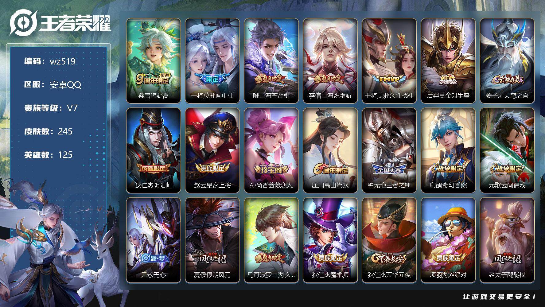【账号佳】 【可二次实名】【wz519】【商品标题】:安卓Q-V7-永恒钻石I段位-125英雄-245皮肤-0典藏-0珍品无双-0无双-0珍品传说-6传说-68史诗 【传说皮肤】:桑启鸣野蒿,干将莫邪画中仙,曜山海苍雷引,李信山海炽霜斩,干将莫邪久胜战神,后羿黄金射手座 【限定皮肤】:姜子牙天穹之誓,狄仁杰阴阳师,赵云皇家上将,孙尚香蔷薇恋人,庄周高山流水,钟无艳王者之锤,扁鹊奇幻香踪,元歌云间偶戏,元歌无心,夏侯惇朔风刀,马可波罗山海玄木吟,狄仁杰魔术师,狄仁杰万华元夜,项羽海滩派对,老夫子醍醐杖,程咬金演武夺筹,花木兰默契交锋,亚瑟潮玩骑士王,牛魔御旌,刘备百相守梦,李元芳匿光侦查者,钟馗驱傩正仪,杨玉环遇见飞天,杨戬潮玩骑兵,干将莫邪画中仙,雅典娜黎明之约,鬼谷子原初探秘者,鬼谷子五谷丰年,弈星混沌棋,沈梦溪大漠名商,明世隐疑决卦,裴擒虎李小龙,裴擒虎擒涛扼浪,狂铁御狮,狂铁电玩高手,米莱狄御霄,云中君纤云弄巧,李信山海炽霜斩,盾山御銮,上官婉儿梁祝,嫦娥暖冬兔眠,曜山海苍雷引,西施玲珑珍味,鲁班大师探海日志,桑启海盐诗旅,暃星界游侠,戈娅驭风魔法,艾琳流音漫舞,司空震地狱燃心,阿古朵江河有灵,张良古海寻踪,蒙犽百解令,蒙恬荣光圣徽,高渐离燃音魔法,妲己灵卜魔法,鬼谷子天穹祈灯,姬小满妄想食味,沈梦溪龙舞盛年,刘邦剑破天穹,程咬金群星魔术团,周瑜熔金海岸 【年限皮肤】:马可波罗山海玄木吟,李信山海炽霜斩,曜山海苍雷引 【赛季限定】:夏侯惇朔风刀,狄仁杰万华元夜,老夫子醍醐杖,程咬金演武夺筹,张良古海寻踪,牛魔御旌,钟馗驱傩正仪,雅典娜黎明之约,鬼谷子原初探秘者,弈星混沌棋,沈梦溪大漠名商,明世隐疑决卦,裴擒虎擒涛扼浪,狂铁御狮,米莱狄御霄,盾山御銮,鲁班大师探海日志,桑启海盐诗旅,鬼谷子天穹祈灯,蒙恬荣光圣徽,刘邦剑破天穹,姜子牙天穹之誓 【战令限定】:扁鹊奇幻香踪,元歌云间偶戏,艾琳流音漫舞,亚瑟潮玩骑士王,杨戬潮玩骑兵,狂铁电玩高手,嫦娥暖冬兔眠,西施玲珑珍味,司空震地狱燃心,暃星界游侠,戈娅驭风魔法,高渐离燃音魔法,妲己灵卜魔法 【史诗皮肤】:露娜紫霞仙子,阿轲暗夜猫娘,钟无艳王者之锤,赵云皇家上将,貂蝉圣诞恋歌,甄姬冰雪圆舞曲,狄仁杰魔术师,廉颇地狱岩魂,宫本武藏鬼剑武藏,孙尚香蔷薇恋人,孙尚香水果甜心,妲己女仆咖啡,墨子金属风暴,吕布圣诞狂欢,刘禅绅士熊喵,曹操幽灵船长,李白千年之狐,吕布末日机甲,张飞乱世虎臣,韩信白龙吟,花木兰水晶猎龙者,夏侯惇乘风破浪,小乔缤纷独角兽,兰陵王暗隐猎兽者,雅典娜冰冠公主,安琪拉心灵骇客,百里守约特工魅影,蔡文姬舞动绿茵,刘禅天才门将,李元芳逐浪之夏,程咬金功夫厨神,白起星夜王子,阿轲节奏热浪,杨玉环遇见飞天,孙策猫狗日记,大乔猫狗日记,伽罗箭羽风息,狄仁杰鹰眼统帅,上官婉儿梁祝,娜可露露晚萤,不知火舞魅语,橘右京修罗,裴擒虎李小龙,云中君纤云弄巧,元歌云间偶戏,花木兰默契交锋,庄周高山流水,雅典娜黎明之约,狂铁电玩高手,鬼谷子五谷丰年,元歌无心,暃星界游侠,马可波罗山海玄木吟,镜玫瑰异探,扁鹊奇幻香踪,刘备百相守梦,戈娅驭风魔法,李元芳匿光侦查者,司空震地狱燃心,阿古朵江河有灵,蒙犽百解令,妲己灵卜魔法,高渐离燃音魔法,蒙恬荣光圣徽,姬小满妄想食味,牛魔星界战将,弈星万物之道,狂铁龙之律动,公孙离涂山容容 【其他皮肤】:项羽海滩派对,韩信教廷特使,韩信街头霸王,露娜哥特玫瑰,阿轲爱心护理,达摩大发明家,赵云白执事,赵云忍炎影,芈月红桃皇后,白起白色死神,武则天东方不败,扁鹊化身博士,扁鹊救世之瞳,宫本武藏未来纪元,姜子牙时尚教父,妲己少女阿狸,典韦黄金武士,亚瑟死亡骑士,达摩拳王,花木兰兔女郎,张飞五福同心,甄姬花好人间,刘备万事如意,宫本武藏万象初新,狄仁杰阴阳师,刘备纽约教父,关羽龙腾万里,钟无艳海滩丽影,宫本武藏霸王丸,老夫子功夫老勺,李白敏锐之力,鬼谷子幻乐之宴,狂铁御狮,苏烈坚韧之力,大乔守护之力,项羽科学大爆炸,米莱狄御霄,明世隐虹云星官,庄周奇妙博物学,牛魔御旌,小乔丁香结,吕布野性能量,盾山御銮,孙膑归虚梦演,沈梦溪鲨炮海盗猫,姜子牙炽热元素使,夏侯惇朔风刀,弈星混沌棋,哪吒次元突破,明世隐疑决卦,盾山圆桌骑士,老夫子醍醐杖,狂铁特工战影,鬼谷子原初探秘者,狄仁杰万华元夜,亚瑟潮玩骑士王,刘禅秘密基地,露娜瓷语鉴心,程咬金演武夺筹,张良缤纷绘卷,钟馗驱傩正仪,鲁班大师乓乓大师,程咬金无双福将,沈梦溪大漠名商,蒙恬蔚蓝守将,桑启海盐诗旅,嫦娥暖冬兔眠,猪八戒潮玩探月行,赵怀真太极少年,裴擒虎擒涛扼浪,杨戬潮玩骑兵,太乙真人劲辣红锅,莱西奥西部游侠,鲁班大师探海日志,西施玲珑珍味,姬小满零食大作战,李元芳妄想特派,哪吒热血海滩,艾琳流音漫舞,张良古海寻踪,钟无艳聚星闪耀,海月王牌新星,