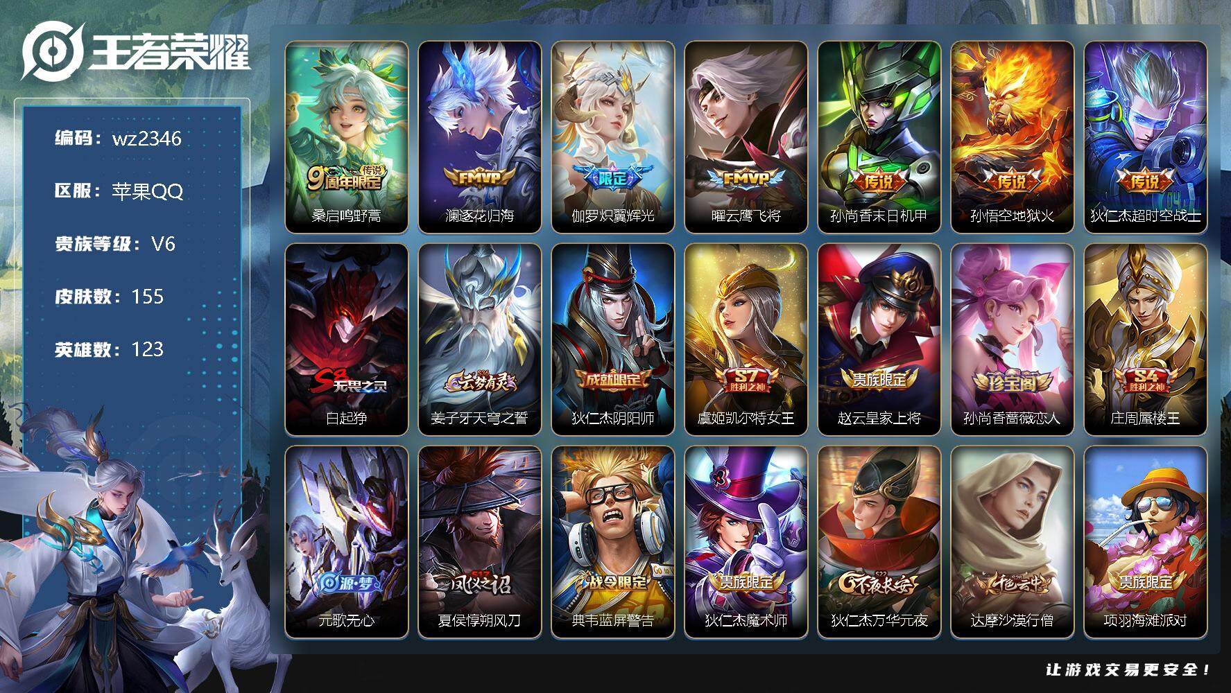 【账号佳】 【可二次实名】【wz2346】苹果Q-V6-至尊星耀V段位-123英雄-155皮肤-0典藏-0珍品无双-0无双-0珍品传说-7传说-42史诗 【传说皮肤】:桑启鸣野蒿,澜逐花归海,伽罗炽翼辉光,曜云鹰飞将,孙尚香末日机甲,孙悟空地狱火,狄仁杰超时空战士 【限定皮肤】:白起狰,姜子牙天穹之誓,狄仁杰阴阳师,虞姬凯尔特女王,赵云皇家上将,孙尚香蔷薇恋人,庄周蜃楼王,元歌无心,夏侯惇朔风刀,典韦蓝屏警告,狄仁杰魔术师,狄仁杰万华元夜,达摩沙漠行僧,项羽海滩派对,程咬金演武夺筹,兰陵王金庭之子,亚瑟狮心王,孙悟空孙行者,牛魔御旌,后羿圣弓游侠,李元芳云中旅人,钟馗驱傩正仪,女娲朔望之晖,干将莫邪真爱魔法,雅典娜黎明之约,太乙真人饕餮,鬼谷子原初探秘者,苏烈千军破阵,弈星混沌棋,明世隐疑决卦,裴擒虎擒涛扼浪,狂铁御狮,米莱狄御霄,云中君纤云弄巧,云中君时之祈愿,伽罗炽翼辉光,盾山御銮,嫦娥拒霜思,镜匿光追影者,桑启海盐诗旅,张良古海寻踪,蒙犽百解令,鬼谷子天穹祈灯,刘邦剑破天穹,程咬金群星魔术团,镜青焰无极,项羽苍威无极,芈月浮光幕影,周瑜熔金海岸 【年限皮肤】:伽罗炽翼辉光 【赛季限定】:庄周蜃楼王,白起狰,夏侯惇朔风刀,狄仁杰万华元夜,达摩沙漠行僧,程咬金演武夺筹,兰陵王金庭之子,张良古海寻踪,亚瑟狮心王,牛魔御旌,李元芳云中旅人,虞姬凯尔特女王,钟馗驱傩正仪,雅典娜黎明之约,太乙真人饕餮,鬼谷子原初探秘者,苏烈千军破阵,弈星混沌棋,明世隐疑决卦,裴擒虎擒涛扼浪,狂铁御狮,米莱狄御霄,盾山御銮,桑启海盐诗旅,鬼谷子天穹祈灯,刘邦剑破天穹,姜子牙天穹之誓 【战令限定】:典韦蓝屏警告,后羿圣弓游侠,女娲朔望之晖,干将莫邪真爱魔法,镜青焰无极,项羽苍威无极 【史诗皮肤】:鲁班七号电玩小子,露娜紫霞仙子,赵云皇家上将,赵云未来纪元,狄仁杰魔术师,宫本武藏鬼剑武藏,孙尚香蔷薇恋人,孙尚香水果甜心,嬴政暗夜贵公子,嬴政摇滚巨星,妲己魅力维加斯,墨子金属风暴,张飞乱世虎臣,韩信白龙吟,花木兰水晶猎龙者,兰陵王暗隐猎兽者,诸葛亮黄金分割率,亚瑟心灵战警,刘禅天才门将,典韦蓝屏警告,伽罗箭羽风息,狄仁杰鹰眼统帅,公孙离无限星赏官,小乔青蛇,云中君纤云弄巧,干将莫邪真爱魔法,孙悟空孙行者,嫦娥拒霜思,镜匿光追影者,雅典娜黎明之约,云中君时之祈愿,夏洛特永昼,艾琳奇遇舞章,元歌无心,蒙犽百解令,镜青焰无极,黄忠怒海争锋,芈月浮光幕影,马可波罗星界特工,刘禅鸭鸭历险记,狂铁龙之律动,后羿石田雨龙 【其他皮肤】:项羽海滩派对,韩信教廷特使,韩信街头霸王,露娜哥特玫瑰,赵云忍炎影,芈月红桃皇后,程咬金爱与正义,白起白色死神,武则天东方不败,扁鹊化身博士,安琪拉玩偶对对碰,孙膑天使之翼,妲己少女阿狸,典韦黄金武士,亚瑟死亡骑士,达摩拳王,张飞五福同心,甄姬花好人间,宫本武藏万象初新,亚瑟狮心王,狄仁杰阴阳师,庄周蜃楼王,刘备纽约教父,刘备汉昭烈帝,关羽龙腾万里,虞姬凯尔特女王,白起狰,钟无艳海滩丽影,太乙真人饕餮,宫本武藏霸王丸,王昭君幻想奇妙夜,老夫子功夫老勺,孙尚香沉稳之力,李白敏锐之力,狂铁御狮,米莱狄御霄,牛魔御旌,女娲朔望之晖,小乔丁香结,吕布野性能量,盾山御銮,沈梦溪鲨炮海盗猫,夏侯惇朔风刀,弈星混沌棋,哪吒次元突破,明世隐疑决卦,狂铁特工战影,鬼谷子原初探秘者,狄仁杰万华元夜,刘禅秘密基地,程咬金演武夺筹,张良缤纷绘卷,钟馗驱傩正仪,鲁班大师乓乓大师,苏烈千军破阵,后羿圣弓游侠,马可波罗潮玩牛仔,达摩沙漠行僧,程咬金无双福将,兰陵王金庭之子,蒙恬蔚蓝守将,李元芳云中旅人,桑启海盐诗旅,猪八戒潮玩探月行,裴擒虎擒涛扼浪,张良古海寻踪,后羿完美运算,鬼谷子天穹祈灯,廉颇功夫炙烤,刘邦剑破天穹,程咬金群星魔术团,项羽苍威无极,大司命暗都幽影,貂蝉长夏之忆,姜子牙天穹之誓,周瑜熔金海岸,东皇太一噬灭天穹,姜子牙星梦巡礼,钟馗虚灵犬护,沈梦溪鸭鸭历险记,白起死霸装,鲁班七号木偶奇遇记,高渐离金属狂潮,老夫子潮流仙人,曹操超能战警,孙悟空西部大镖客,后羿精灵王,李白范海辛,李元芳特种部队,虞姬加勒比小姐,蔡文姬蔷薇王座,马可波罗激情绿茵,杨戬埃及法老,诸葛亮星航指挥官,黄忠芝加哥教父,干将莫邪第七人偶,百里守约绝影神枪,明世隐占星师,杨玉环霓裳曲,伽罗花见巫女,李信灼热之刃,嫦娥露花倒影,云中君荷鲁斯之眼,曜归虚梦演,马超幸存者,云缨赤焰之缨 【内测皮肤】:孙尚香蔷薇恋人,狂铁特工战影 【营地ID】:4508050