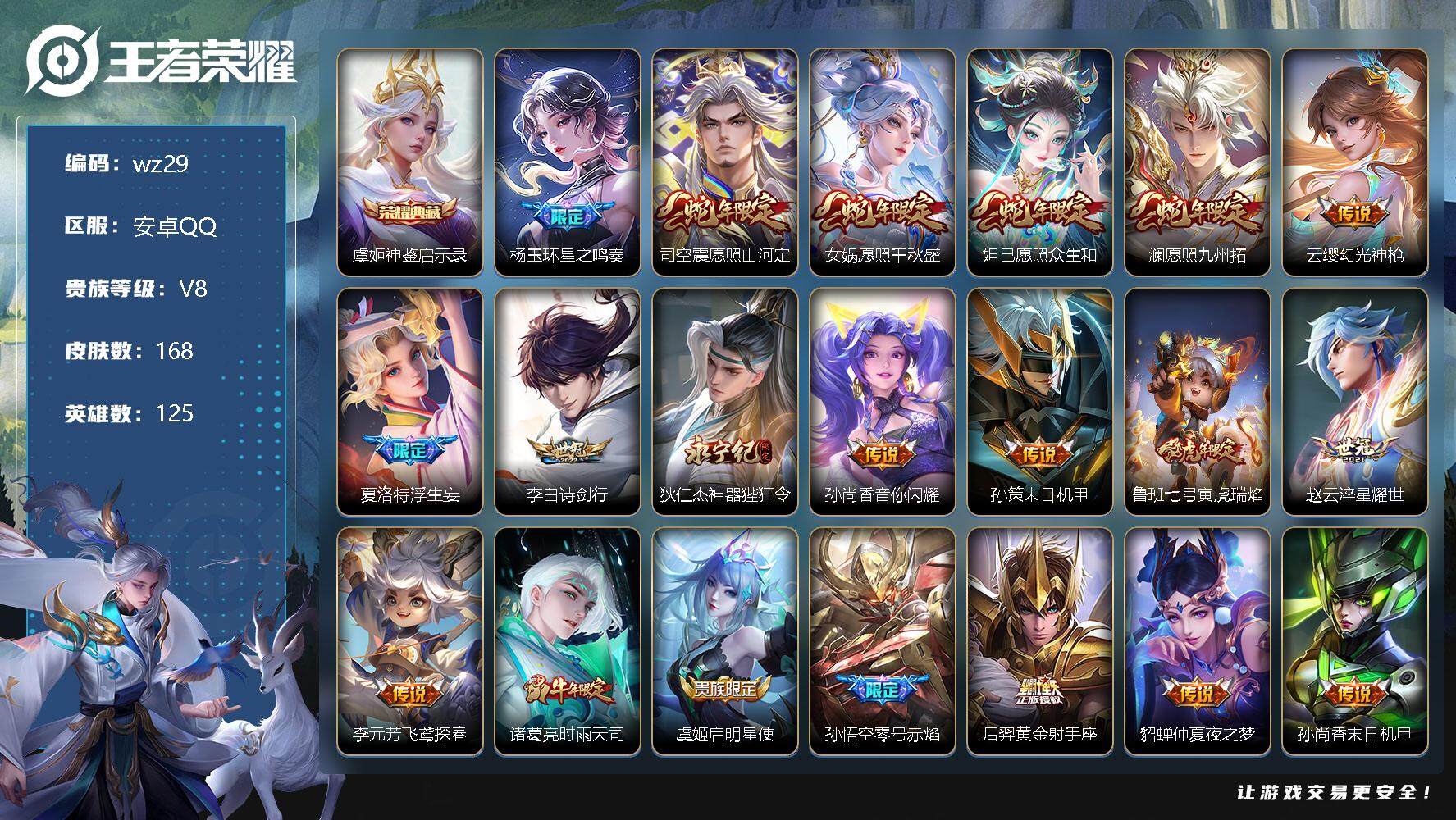 【账号佳】 【可二次实名】【wz29】【商品标题】:安卓Q-V8-至尊星耀IV段位-125英雄-168皮肤-1典藏-0珍品无双-0无双-0珍品传说-21传说-37史诗 【荣耀典藏】:虞姬神鉴启示录 【传说皮肤】:杨玉环星之鸣奏,司空震愿照山河定,女娲愿照千秋盛,妲己愿照众生和,澜愿照九州拓,云缨幻光神枪,夏洛特浮生妄,李白诗剑行,狄仁杰神器狴犴令,孙尚香音你闪耀,孙策末日机甲,鲁班七号寅虎瑞焰,赵云淬星耀世,李元芳飞鸢探春,诸葛亮时雨天司,虞姬启明星使,孙悟空零号赤焰,后羿黄金射手座,貂蝉仲夏夜之梦,孙尚香末日机甲,孙悟空地狱火 【限定皮肤】:白起狰,蔡文姬夏日便利店,虞姬夏日便利店,姜子牙天穹之誓,狄仁杰阴阳师,虞姬凯尔特女王,赵云皇家上将,赵云百木心枪,嬴政白昼王子,鲁班七号狮舞东方,鲁班七号寅虎瑞焰,孙膑妖精王,扁鹊炼金王,芈月重明,吕布猎兽之王,元歌无心,夏侯惇朔风刀,曹操烛龙,典韦穷奇,马可波罗山海玄木吟,狄仁杰魔术师,狄仁杰万华元夜,狄仁杰神器狴犴令,达摩沙漠行僧,项羽海滩派对,老夫子圣诞老人,老夫子醍醐杖,程咬金演武夺筹,韩信傲雪梅枪,兰陵王金庭之子,亚瑟狮心王,孙悟空大圣娶亲,孙悟空零号赤焰,牛魔御旌,李元芳云中旅人,虞姬启明星使,钟馗神迹守卫,钟馗驱傩正仪,杨玉环遇见飞天,蔡文姬繁星吟游,太乙真人饕餮,鬼谷子原初探秘者,诸葛亮时雨天司,黄忠烈魂,百里守约朱雀志,弈星混沌棋,沈梦溪大漠名商,明世隐疑决卦,狂铁御狮,米莱狄御霄,盾山御銮,上官婉儿梁祝,夏洛特浮生妄 【年限皮肤】:百里守约朱雀志,鲁班七号寅虎瑞焰,诸葛亮时雨天司,黄忠烈魂,马可波罗山海玄木吟 【赛季限定】:孙膑妖精王,扁鹊炼金王,白起狰,芈月重明,夏侯惇朔风刀,曹操烛龙,典韦穷奇,狄仁杰万华元夜,达摩沙漠行僧,老夫子醍醐杖,程咬金演武夺筹,兰陵王金庭之子,亚瑟狮心王,牛魔御旌,李元芳云中旅人,虞姬凯尔特女王,钟馗驱傩正仪,太乙真人饕餮,鬼谷子原初探秘者,弈星混沌棋,沈梦溪大漠名商,明世隐疑决卦,狂铁御狮,米莱狄御霄,盾山御銮,姜子牙天穹之誓 【战令限定】:蔡文姬夏日便利店,虞姬夏日便利店,嬴政白昼王子,鲁班七号狮舞东方,吕布猎兽之王,钟馗神迹守卫 【史诗皮肤】:鲁班七号电玩小子,赵云皇家上将,赵云未来纪元,貂蝉圣诞恋歌,老夫子圣诞老人,王昭君偶像歌手,狄仁杰魔术师,宫本武藏鬼剑武藏,妲己魅力维加斯,妲己女仆咖啡,李白千年之狐,刘邦德古拉伯爵,小乔缤纷独角兽,兰陵王暗隐猎兽者,诸葛亮黄金分割率,铠曙光守护者,阿轲节奏热浪,杨玉环遇见飞天,嬴政白昼王子,百里守约朱雀志,孙悟空大圣娶亲,鲁班七号狮舞东方,狄仁杰鹰眼统帅,上官婉儿梁祝,蔡文姬繁星吟游,黄忠烈魂,安琪拉时之奇旅,韩信傲雪梅枪,夏洛特永昼,赵云百木心枪,元歌无心,马可波罗山海玄木吟,蔡文姬夏日便利店,马可波罗星界特工,赵怀真器灵浮梦炉,阿轲化蝶舞,公孙离涂山容容 【其他皮肤】:项羽海滩派对,韩信教廷特使,露娜哥特玫瑰,阿轲爱心护理,程咬金星际陆战队,牛魔西部大镖客,武则天东方不败,扁鹊化身博士,妲己少女阿狸,亚瑟死亡骑士,达摩拳王,花木兰兔女郎,张飞五福同心,甄姬花好人间,宫本武藏万象初新,亚瑟狮心王,后羿阿尔法小队,狄仁杰阴阳师,刘备纽约教父,孙膑妖精王,刘备汉昭烈帝,扁鹊炼金王,关羽龙腾万里,虞姬凯尔特女王,白起狰,钟无艳海滩丽影,太乙真人饕餮,曹操烛龙,王昭君幻想奇妙夜,芈月重明,老夫子功夫老勺,牛魔制霸全明星,孙尚香沉稳之力,典韦穷奇,诸葛亮掌控之力,李白敏锐之力,狂铁御狮,苏烈坚韧之力,米莱狄御霄,吕布猎兽之王,明世隐虹云星官,张良幽兰居士,庄周奇妙博物学,牛魔御旌,小乔丁香结,吕布野性能量,钟馗神迹守卫,盾山御銮,沈梦溪鲨炮海盗猫,夏侯惇朔风刀,弈星混沌棋,哪吒次元突破,鲁班七号黑桃队长,明世隐疑决卦,老夫子醍醐杖,廉颇无尽征程,鬼谷子原初探秘者,狄仁杰万华元夜,刘禅秘密基地,程咬金演武夺筹,钟馗驱傩正仪,鲁班大师乓乓大师,达摩沙漠行僧,兰陵王金庭之子,沈梦溪大漠名商,李元芳云中旅人,猪八戒潮玩探月行,姬小满零食大作战,廉颇功夫炙烤,姜子牙天穹之誓,虞姬夏日便利店,太乙真人谧流熔炉,西施雪境奇遇,姜子牙星梦巡礼,达摩爆裂喵拳,明世隐景韶洛都,戈娅玫蓝誓约,刘备浪漫序章,钟馗虚灵犬护,苏烈春野闲踪,甄姬逆浪荇歌,庄周锦麟游梦,莱西奥踏浪烽翎,鲁班七号福禄兄弟,高渐离金属狂潮,花木兰剑舞者,狄仁杰锦衣卫,小乔万圣前夜,孙悟空西部大镖客,周瑜海军大将,兰陵王隐刃,李白范海辛,雅典娜战争女神,太乙真人圆桌骑士,诸葛亮星航指挥官,黄忠芝加哥教父,干将莫邪第七人偶,铠龙域领主,百里守约绝影神枪,米莱狄精准探案法,元歌午夜歌剧院,伽罗花见巫女,沈梦溪棒球奇才,云中君荷鲁斯之眼,马超幸存者,蒙犽归虚梦演,镜冰刃幻境,澜