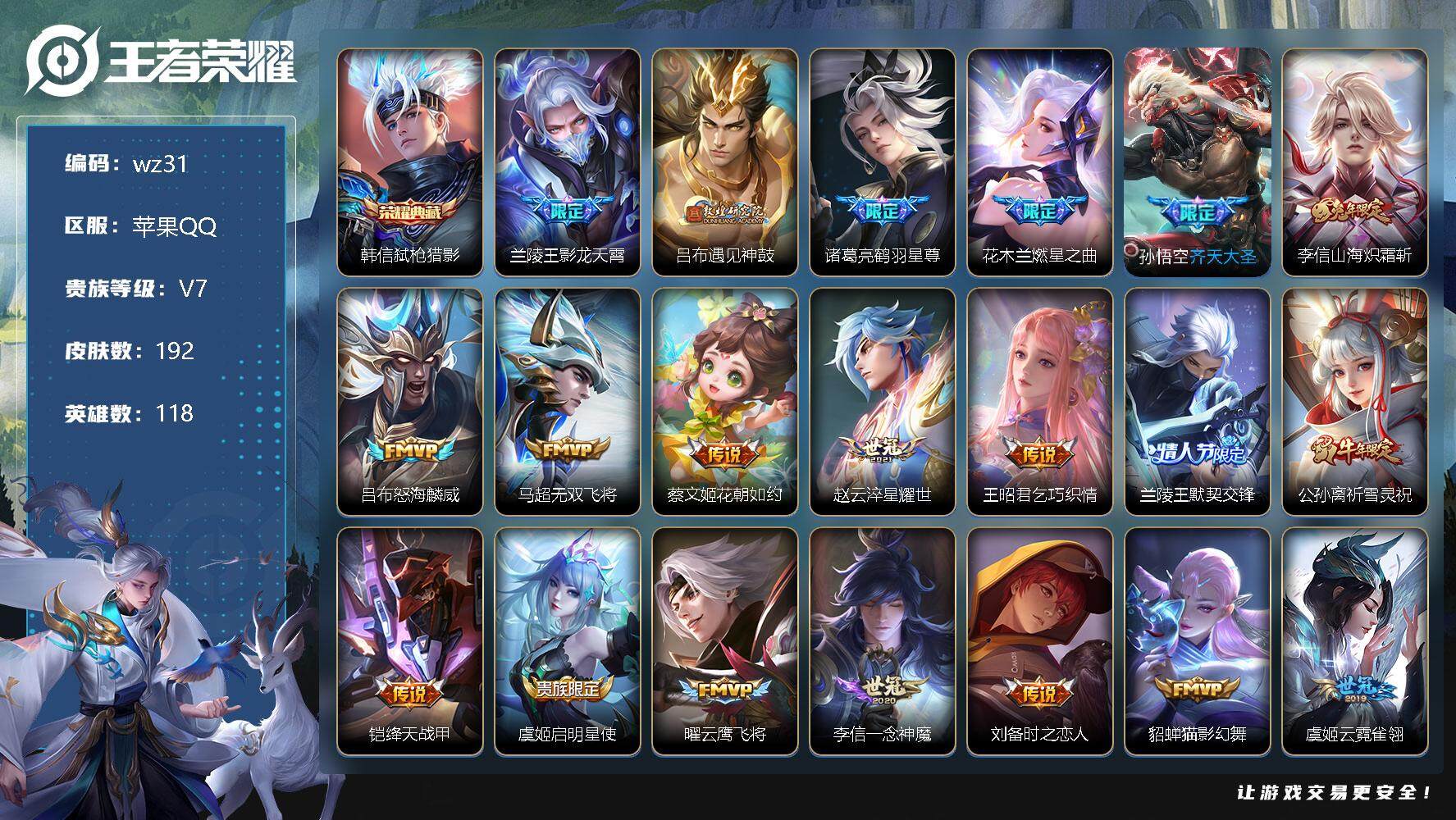 【账号佳】 【可二次实名】【wz31】【商品标题】:苹果Q-V7-永恒钻石V段位-118英雄-192皮肤-1典藏-0珍品无双-0无双-0珍品传说-24传说-54史诗 【荣耀典藏】:韩信弑枪猎影 【传说皮肤】:兰陵王影龙天霄,吕布遇见神鼓,诸葛亮鹤羽星尊,花木兰燃星之曲,孙悟空齐天大圣,李信山海炽霜斩,吕布怒海麟威,马超无双飞将,蔡文姬花朝如约,赵云淬星耀世,王昭君乞巧织情,兰陵王默契交锋,公孙离祈雪灵祝,铠绛天战甲,虞姬启明星使,曜云鹰飞将,李信一念神魔,刘备时之恋人,貂蝉猫影幻舞,虞姬云霓雀翎,梦奇胖达荣荣,貂蝉仲夏夜之梦,宫本武藏地狱之眼,孙悟空地狱火 【限定皮肤】:蔡文姬夏日便利店,虞姬夏日便利店,姜子牙天穹之誓,杨戬破阵退雄兵,狄仁杰阴阳师,赵云皇家上将,钟无艳超时空战士,扁鹊奇幻香踪,吕布遇见神鼓,元歌无心,甄姬落雪兰心,马可波罗山海玄木吟,狄仁杰魔术师,达摩沙漠行僧,项羽海滩派对,韩信傲雪梅枪,兰陵王默契交锋,兰陵王影龙天霄,兰陵王金庭之子,花木兰默契交锋,花木兰燃星之曲,孙悟空至尊宝,孙悟空齐天大圣,李元芳匿光侦查者,李元芳云中旅人,虞姬启明星使,钟馗神迹守卫,杨戬潮玩骑兵,鬼谷子五谷丰年,诸葛亮鹤羽星尊,公孙离祈雪灵祝,公孙离玉兔公主,沈梦溪匿光破解者,裴擒虎李小龙,裴擒虎擒涛扼浪,李信山海炽霜斩,嫦娥暖冬兔眠,鲁班大师探海日志,桑启海盐诗旅,暃星界游侠,艾琳流音漫舞,司空震地狱燃心,阿古朵江河有灵,张良古海寻踪,刘邦剑破天穹,镜青焰无极,项羽苍威无极,刘备异域游侠,芈月浮光幕影,周瑜熔金海岸 【年限皮肤】:公孙离祈雪灵祝,马可波罗山海玄木吟,李信山海炽霜斩 【赛季限定】:达摩沙漠行僧,兰陵王金庭之子,张良古海寻踪,李元芳云中旅人,裴擒虎擒涛扼浪,鲁班大师探海日志,桑启海盐诗旅,刘邦剑破天穹,姜子牙天穹之誓 【战令限定】:蔡文姬夏日便利店,虞姬夏日便利店,钟无艳超时空战士,扁鹊奇幻香踪,甄姬落雪兰心,艾琳流音漫舞,钟馗神迹守卫,杨戬潮玩骑兵,嫦娥暖冬兔眠,司空震地狱燃心,暃星界游侠,镜青焰无极,项羽苍威无极 【史诗皮肤】:鲁班七号电玩小子,项羽苍穹之光,露娜紫霞仙子,赵云皇家上将,赵云未来纪元,貂蝉圣诞恋歌,甄姬冰雪圆舞曲,王昭君偶像歌手,狄仁杰魔术师,宫本武藏鬼剑武藏,孙尚香水果甜心,嬴政暗夜贵公子,妲己魅力维加斯,妲己女仆咖啡,曹操幽灵船长,张飞乱世虎臣,韩信白龙吟,孙悟空至尊宝,诸葛亮黄金分割率,雅典娜冰冠公主,铠曙光守护者,刘禅天才门将,李元芳逐浪之夏,程咬金功夫厨神,阿轲节奏热浪,孙策猫狗日记,狄仁杰鹰眼统帅,娜可露露晚萤,瑶遇见神鹿,孙尚香时之恋人,裴擒虎李小龙,花木兰默契交锋,百里玄策热力回旋,安琪拉时之奇旅,司马懿暗渊魔法,韩信傲雪梅枪,夏洛特永昼,公孙离玉兔公主,澜赏金猎手,钟无艳超时空战士,鬼谷子五谷丰年,元歌无心,暃星界游侠,马可波罗山海玄木吟,扁鹊奇幻香踪,沈梦溪匿光破解者,百里守约真我赫兹,李元芳匿光侦查者,司空震地狱燃心,阿古朵江河有灵,镜青焰无极,芈月浮光幕影,蔡文姬夏日便利店,后羿石田雨龙 【其他皮肤】:项羽海滩派对,韩信教廷特使,韩信街头霸王,露娜哥特玫瑰,阿轲爱心护理,赵云忍炎影,芈月红桃皇后,程咬金星际陆战队,白起白色死神,扁鹊化身博士,扁鹊救世之瞳,宫本武藏未来纪元,安琪拉玩偶对对碰,孙膑天使之翼,姜子牙时尚教父,妲己少女阿狸,典韦黄金武士,亚瑟死亡骑士,达摩拳王,花木兰兔女郎,甄姬花好人间,后羿阿尔法小队,狄仁杰阴阳师,刘备汉昭烈帝,关羽龙腾万里,狂铁命运角斗场,老夫子功夫老勺,李白敏锐之力,明世隐虹云星官,小乔丁香结,钟馗神迹守卫,刘禅秘密基地,鲁班大师乓乓大师,达摩沙漠行僧,兰陵王金庭之子,甄姬落雪兰心,李元芳云中旅人,桑启海盐诗旅,嫦娥暖冬兔眠,海月幻泉雾影,猪八戒潮玩探月行,牛魔牛运亨通,白起乐园追猎者,赵怀真太极少年,裴擒虎擒涛扼浪,杨戬潮玩骑兵,太乙真人劲辣红锅,莱西奥西部游侠,鲁班大师探海日志,姬小满零食大作战,李元芳妄想特派,艾琳流音漫舞,张良古海寻踪,钟无艳聚星闪耀,海月王牌新星,亚连破局者,兰陵王幻夜行动,刘邦剑破天穹,项羽苍威无极,大司命暗都幽影,刘备异域游侠,杨戬破阵退雄兵,姜子牙天穹之誓,周瑜熔金海岸,虞姬夏日便利店,东皇太一噬灭天穹,白起死霸装,钟无艳生化警戒,貂蝉异域舞娘,老夫子潮流仙人,曹操超能战警,孙膑未来旅行,孙悟空西部大镖客,周瑜海军大将,后羿精灵王,刘禅英喵野望,兰陵王隐刃,李白范海辛,钟馗地府判官,李元芳特种部队,刘邦圣殿之光,虞姬加勒比小姐,关羽天启骑士,蔡文姬蔷薇王座,雅典娜战争女神,马可波罗激情绿茵,苍维京掠夺者,杨戬埃及法老,哪吒三太子,大乔伊势巫女,干将莫邪第七人偶,铠龙域领主,百里守约绝影神枪,苏烈爱与和平,梦奇美梦成真,明世隐占星师,公