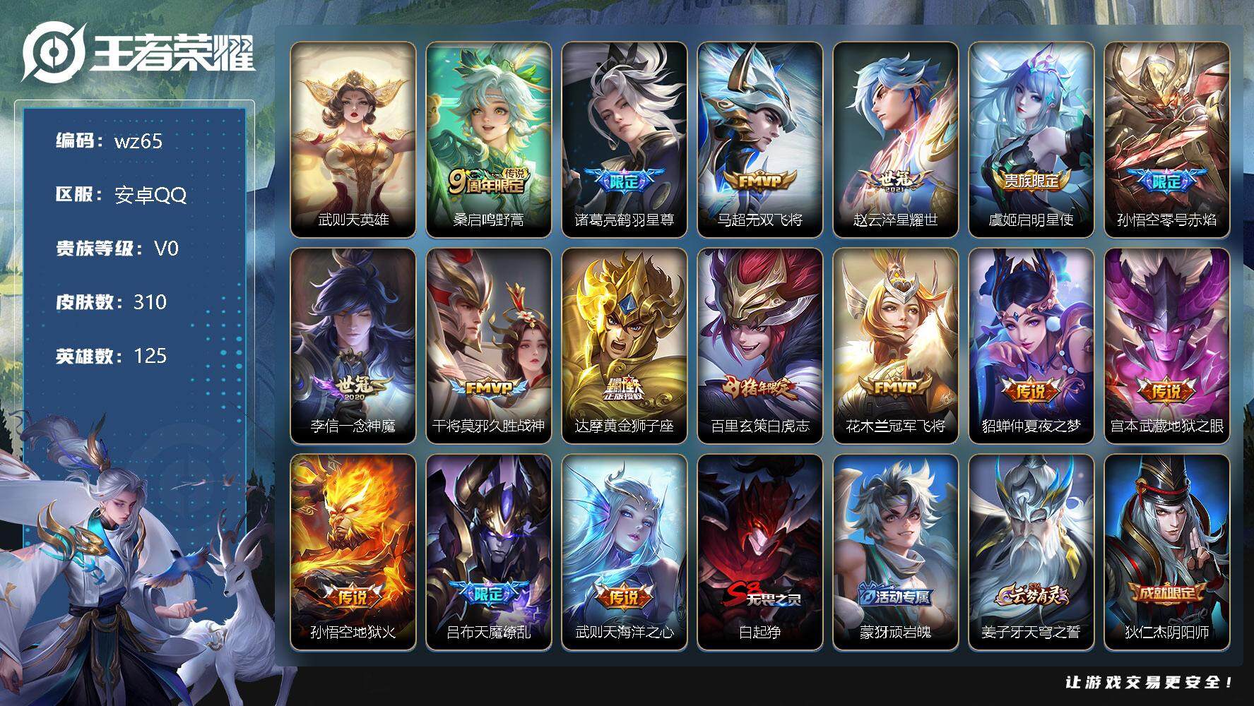 【账号佳】 【可二次实名】【wz65】【商品标题】:安卓Q-V0-尊贵铂金II段位-125英雄-310皮肤-0典藏-0珍品无双-0无双-0珍品传说-16传说-84史诗 【荣耀典藏】:武则天英雄 【传说皮肤】:桑启鸣野蒿,诸葛亮鹤羽星尊,马超无双飞将,赵云淬星耀世,虞姬启明星使,孙悟空零号赤焰,李信一念神魔,干将莫邪久胜战神,达摩黄金狮子座,百里玄策白虎志,花木兰冠军飞将,貂蝉仲夏夜之梦,宫本武藏地狱之眼,孙悟空地狱火,吕布天魔缭乱,武则天海洋之心 【限定皮肤】:白起狰,蒙犽顽岩魄,姜子牙天穹之誓,狄仁杰阴阳师,虞姬凯尔特女王,赵云皇家上将,墨子神迹守卫,嬴政优雅恋人,嬴政白昼王子,孙尚香蔷薇恋人,鲁班七号狮舞东方,庄周蜃楼王,高渐离死亡摇滚,阿轲迷踪丽影,钟无艳王者之锤,孙膑妖精王,扁鹊炼金王,芈月重明,芈月白晶晶,吕布天魔缭乱,吕布猎兽之王,周瑜赤莲之焰,元歌云间偶戏,元歌无心,夏侯惇朔风刀,甄姬游园惊梦,曹操烛龙,典韦穷奇,典韦蓝屏警告,马可波罗逐梦之星,马可波罗暗影游猎,狄仁杰魔术师,狄仁杰万华元夜,达摩星际陆战队,达摩沙漠行僧,项羽海滩派对,老夫子醍醐杖,老夫子航海奇遇记,关羽冰锋战神,程咬金演武夺筹,刘邦夺宝奇兵,韩信飞衡,兰陵王驯魔猎人,兰陵王金庭之子,亚瑟狮心王,亚瑟潮玩骑士王,孙悟空美猴王,孙悟空至尊宝,孙悟空大圣娶亲,孙悟空零号赤焰,牛魔御旌,后羿圣弓游侠,李元芳银河之约,李元芳云中旅人,虞姬启明星使,钟馗神迹守卫,钟馗驱傩正仪,杨玉环遇见飞天,女娲朔望之晖,干将莫邪冰霜恋舞曲,干将莫邪真爱魔法,雅典娜单词大作战,雅典娜黎明之约,蔡文姬繁星吟游,太乙真人饕餮,太乙真人华丽摇滚,鬼谷子原初探秘者,诸葛亮鹤羽星尊,苏烈千军破阵,百里玄策白虎志,百里玄策原初追逐者,弈星混沌棋,公孙离蜜橘之夏,沈梦溪星空之诺,明世隐疑决卦,裴擒虎李小龙,裴擒虎擒涛扼浪,狂铁御狮,米莱狄御霄,米莱狄胡桃异想国,云中君纤云弄巧,伽罗天狼溯光者,盾山御銮,猪八戒西部大镖客,猪八戒猪悟能,上官婉儿梁祝,嫦娥拒霜思,蒙犽狂想玩偶喵,鲁班大师探海日志,桑启海盐诗旅,阿古朵江河有灵,张良古海寻踪,鬼谷子天穹祈灯,刘邦剑破天穹,周瑜熔金海岸 【年限皮肤】:百里玄策白虎志,孙悟空美猴王,韩信飞衡 【赛季限定】:庄周蜃楼王,孙膑妖精王,扁鹊炼金王,白起狰,芈月重明,夏侯惇朔风刀,曹操烛龙,典韦穷奇,狄仁杰万华元夜,达摩沙漠行僧,老夫子醍醐杖,程咬金演武夺筹,兰陵王金庭之子,张良古海寻踪,亚瑟狮心王,牛魔御旌,李元芳云中旅人,虞姬凯尔特女王,钟馗驱傩正仪,雅典娜黎明之约,太乙真人饕餮,鬼谷子原初探秘者,苏烈千军破阵,百里玄策原初追逐者,弈星混沌棋,明世隐疑决卦,裴擒虎擒涛扼浪,狂铁御狮,米莱狄御霄,盾山御銮,鲁班大师探海日志,桑启海盐诗旅,鬼谷子天穹祈灯,刘邦剑破天穹,姜子牙天穹之誓 【战令限定】:墨子神迹守卫,嬴政白昼王子,鲁班七号狮舞东方,阿轲迷踪丽影,吕布猎兽之王,周瑜赤莲之焰,元歌云间偶戏,典韦蓝屏警告,马可波罗暗影游猎,达摩星际陆战队,老夫子航海奇遇记,刘邦夺宝奇兵,兰陵王驯魔猎人,亚瑟潮玩骑士王,后羿圣弓游侠,李元芳银河之约,钟馗神迹守卫,女娲朔望之晖,干将莫邪真爱魔法,雅典娜单词大作战,沈梦溪星空之诺,米莱狄胡桃异想国,猪八戒西部大镖客,蒙犽狂想玩偶喵 【史诗皮肤】:鲁班七号电玩小子,露娜紫霞仙子,钟无艳王者之锤,赵云皇家上将,赵云未来纪元,貂蝉圣诞恋歌,甄姬冰雪圆舞曲,王昭君偶像歌手,狄仁杰魔术师,廉颇地狱岩魂,宫本武藏鬼剑武藏,孙尚香蔷薇恋人,孙尚香水果甜心,嬴政优雅恋人,嬴政暗夜贵公子,嬴政摇滚巨星,妲己魅力维加斯,妲己女仆咖啡,墨子金属风暴,吕布圣诞狂欢,刘禅绅士熊喵,曹操幽灵船长,李白千年之狐,吕布末日机甲,张飞乱世虎臣,韩信白龙吟,关羽冰锋战神,孙悟空至尊宝,花木兰水晶猎龙者,刘邦德古拉伯爵,夏侯惇乘风破浪,小乔缤纷独角兽,兰陵王暗隐猎兽者,诸葛亮黄金分割率,甄姬游园惊梦,马可波罗逐梦之星,亚瑟心灵战警,雅典娜冰冠公主,安琪拉心灵骇客,百里守约特工魅影,铠曙光守护者,蔡文姬舞动绿茵,刘禅天才门将,公孙离蜜橘之夏,李元芳逐浪之夏,程咬金功夫厨神,白起星夜王子,阿轲节奏热浪,杨玉环遇见飞天,嬴政白昼王子,孙策猫狗日记,大乔猫狗日记,干将莫邪冰霜恋舞曲,孙悟空大圣娶亲,典韦蓝屏警告,伽罗箭羽风息,鲁班七号狮舞东方,狄仁杰鹰眼统帅,兰陵王驯魔猎人,上官婉儿梁祝,蔡文姬繁星吟游,李元芳银河之约,韩信飞衡,大乔白蛇,阿轲迷踪丽影,橘右京修罗,马可波罗暗影游猎,蒙犽狂想玩偶喵,百里玄策原初追逐者,裴擒虎李小龙,云中君纤云弄巧,元歌云间偶戏,芈月白晶晶,米莱狄胡桃异想国,老夫子航海奇遇记,伽罗天狼溯光者,干将莫邪真爱魔法,沈梦溪月团寄思,猪八戒猪悟能,嫦娥拒霜思,雅