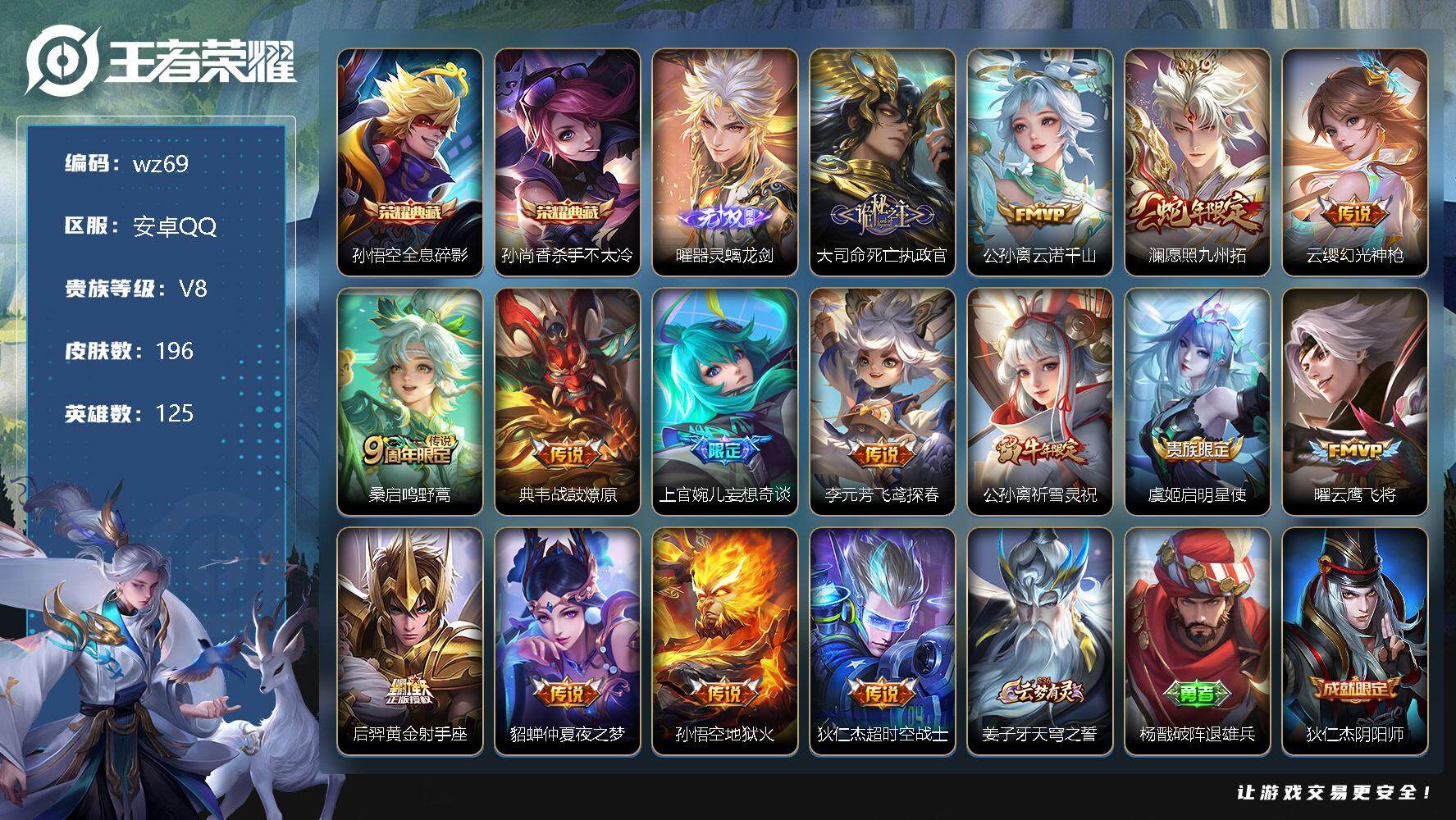 【账号佳】 【可二次实名】【wz69】【商品标题】:安卓Q-V8-最强王者段位-125英雄-196皮肤-2典藏-0珍品无双-1无双-0珍品传说-15传说-53史诗 【荣耀典藏】:孙悟空全息碎影,孙尚香杀手不太冷 【无双皮肤】:曜器灵螭龙剑 【传说皮肤】:大司命死亡执政官,公孙离云诺千山,澜愿照九州拓,云缨幻光神枪,桑启鸣野蒿,典韦战鼓燎原,上官婉儿妄想奇谈,李元芳飞鸢探春,公孙离祈雪灵祝,虞姬启明星使,曜云鹰飞将,后羿黄金射手座,貂蝉仲夏夜之梦,孙悟空地狱火,狄仁杰超时空战士 【限定皮肤】:姜子牙天穹之誓,杨戬破阵退雄兵,狄仁杰阴阳师,赵云皇家上将,赵云引擎之心,墨子神迹守卫,孙尚香蔷薇恋人,马可波罗山海玄木吟,狄仁杰魔术师,狄仁杰万华元夜,达摩沙漠行僧,项羽海滩派对,老夫子醍醐杖,老夫子航海奇遇记,程咬金演武夺筹,孙悟空至尊宝,李元芳云中旅人,虞姬启明星使,钟馗驱傩正仪,鬼谷子原初探秘者,百里玄策原初追逐者,弈星混沌棋,公孙离祈雪灵祝,沈梦溪大漠名商,明世隐疑决卦,上官婉儿妄想奇谈,西施玲珑珍味,鲁班大师探海日志,桑启海盐诗旅,张良古海寻踪,鬼谷子天穹祈灯,沈梦溪龙舞盛年,刘邦剑破天穹,程咬金群星魔术团,刘备异域游侠,周瑜熔金海岸 【年限皮肤】:公孙离祈雪灵祝,马可波罗山海玄木吟 【赛季限定】:狄仁杰万华元夜,达摩沙漠行僧,老夫子醍醐杖,程咬金演武夺筹,张良古海寻踪,李元芳云中旅人,钟馗驱傩正仪,鬼谷子原初探秘者,百里玄策原初追逐者,弈星混沌棋,沈梦溪大漠名商,明世隐疑决卦,鲁班大师探海日志,桑启海盐诗旅,鬼谷子天穹祈灯,刘邦剑破天穹,姜子牙天穹之誓 【战令限定】:墨子神迹守卫,老夫子航海奇遇记,西施玲珑珍味 【史诗皮肤】:鲁班七号电玩小子,赵云皇家上将,甄姬冰雪圆舞曲,王昭君偶像歌手,狄仁杰魔术师,廉颇地狱岩魂,宫本武藏鬼剑武藏,孙尚香蔷薇恋人,孙尚香水果甜心,嬴政摇滚巨星,妲己魅力维加斯,曹操幽灵船长,张飞乱世虎臣,孙悟空至尊宝,赵云引擎之心,花木兰水晶猎龙者,刘邦德古拉伯爵,夏侯惇乘风破浪,兰陵王暗隐猎兽者,诸葛亮黄金分割率,雅典娜冰冠公主,安琪拉心灵骇客,百里守约特工魅影,铠曙光守护者,蔡文姬舞动绿茵,李元芳逐浪之夏,程咬金功夫厨神,白起星夜王子,阿轲节奏热浪,伽罗箭羽风息,狄仁杰鹰眼统帅,娜可露露晚萤,不知火舞魅语,瑶遇见神鹿,百里玄策原初追逐者,老夫子航海奇遇记,钟馗乐园奇幻夜,艾琳奇遇舞章,马可波罗山海玄木吟,黄忠怒海争锋,牛魔星界战将,孙膑茶境仙,赵怀真器灵浮梦炉,狄仁杰绮世丹青,阿轲化蝶舞,刘禅鸭鸭历险记,狂铁龙之律动,老夫子藏狐褐绒,后羿石田雨龙,周瑜百相守梦,黄忠百相守梦,西施织梦人,公孙离涂山容容 【其他皮肤】:项羽海滩派对,韩信教廷特使,韩信街头霸王,露娜哥特玫瑰,达摩大发明家,赵云忍炎影,芈月红桃皇后,白起白色死神,牛魔西部大镖客,武则天东方不败,扁鹊救世之瞳,宫本武藏未来纪元,姜子牙时尚教父,妲己少女阿狸,典韦黄金武士,亚瑟死亡骑士,达摩拳王,花木兰兔女郎,刘备万事如意,宫本武藏万象初新,后羿阿尔法小队,狄仁杰阴阳师,刘备纽约教父,关羽龙腾万里,钟无艳海滩丽影,王昭君幻想奇妙夜,狂铁命运角斗场,孙尚香沉稳之力,诸葛亮掌控之力,李白敏锐之力,大乔守护之力,小乔丁香结,弈星混沌棋,哪吒次元突破,明世隐疑决卦,老夫子醍醐杖,狂铁特工战影,鬼谷子原初探秘者,狄仁杰万华元夜,程咬金演武夺筹,盘古重装意志,钟馗驱傩正仪,墨子神迹守卫,鲁班大师乓乓大师,达摩沙漠行僧,程咬金无双福将,沈梦溪大漠名商,李元芳云中旅人,桑启海盐诗旅,海月幻泉雾影,猪八戒潮玩探月行,莱西奥西部游侠,鲁班大师探海日志,西施玲珑珍味,张良古海寻踪,鬼谷子天穹祈灯,廉颇功夫炙烤,沈梦溪龙舞盛年,钟无艳春野之旅,刘邦剑破天穹,盘古经纬探寻者,程咬金群星魔术团,刘备异域游侠,杨戬破阵退雄兵,姜子牙天穹之誓,周瑜熔金海岸,盘古敬我三分,东皇太一噬灭天穹,干将莫邪雾都夜雨,吕布逐霄战戟,苍苍林狼骑,太乙真人谧流熔炉,典韦铁骨偃魂,马超访茗客,影魅影绮裳,西施雪境奇遇,姜子牙星梦巡礼,东皇太一金福满堂,达摩爆裂喵拳,少司缘灵卦秘语,明世隐景韶洛都,钟馗虚灵犬护,沈梦溪鸭鸭历险记,小乔秘证寻踪,张良灵野札记,甄姬逆浪荇歌,孙策百相守梦,庄周锦麟游梦,空空儿戏梦巡演,莱西奥踏浪烽翎,鬼谷子克喵,鲁班七号福禄兄弟,露娜绯红之刃,王昭君精灵公主,狄仁杰锦衣卫,孙悟空西部大镖客,后羿精灵王,关羽天启骑士,夏侯惇战争骑士,马可波罗激情绿茵,杨戬埃及法老,哪吒三太子,干将莫邪第七人偶,铠龙域领主,百里守约绝影神枪,百里玄策威尼斯狂欢,裴擒虎街头旋风,孙策海之征途,伽罗花见巫女,李信灼热之刃,上官婉儿修竹墨客,嫦娥露花倒影,盘古创世神祝,云中君荷鲁斯之眼,曜归虚梦演,马超幸存者,西施归