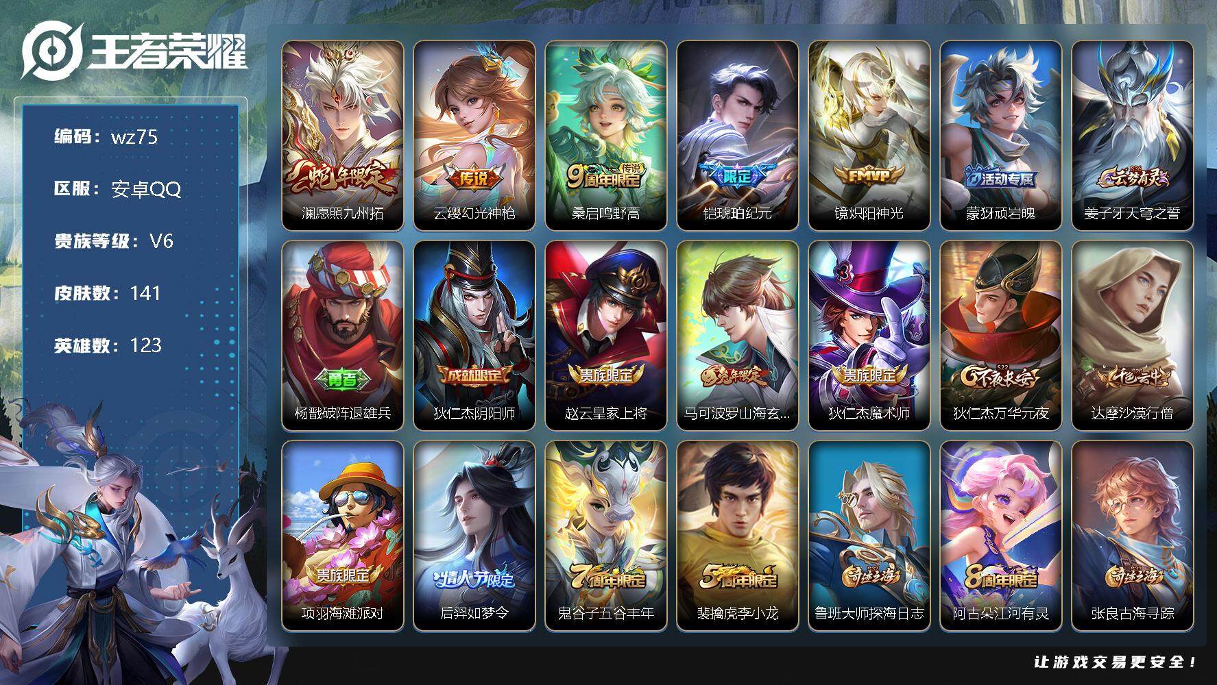【账号佳】 【可二次实名】【wz75】【商品标题】:安卓Q-V6-至尊星耀IV段位-123英雄-141皮肤-0典藏-0珍品无双-0无双-0珍品传说-5传说-30史诗 【传说皮肤】:澜愿照九州拓,云缨幻光神枪,桑启鸣野蒿,铠琥珀纪元,镜炽阳神光 【限定皮肤】:蒙犽顽岩魄,姜子牙天穹之誓,杨戬破阵退雄兵,狄仁杰阴阳师,赵云皇家上将,马可波罗山海玄木吟,狄仁杰魔术师,狄仁杰万华元夜,达摩沙漠行僧,项羽海滩派对,后羿如梦令,鬼谷子五谷丰年,裴擒虎李小龙,鲁班大师探海日志,阿古朵江河有灵,张良古海寻踪,鬼谷子天穹祈灯,铠琥珀纪元,姬小满妄想食味,百里玄策超元猎域,沈梦溪龙舞盛年,鲁班七号蔬乡物语,李元芳蔬乡物语,刘邦剑破天穹,程咬金群星魔术团,刘备异域游侠,周瑜熔金海岸 【年限皮肤】:马可波罗山海玄木吟 【赛季限定】:狄仁杰万华元夜,达摩沙漠行僧,张良古海寻踪,鲁班大师探海日志,鬼谷子天穹祈灯,刘邦剑破天穹,姜子牙天穹之誓 【战令限定】:鲁班七号蔬乡物语,李元芳蔬乡物语 【史诗皮肤】:赵云皇家上将,赵云未来纪元,貂蝉圣诞恋歌,甄姬冰雪圆舞曲,狄仁杰魔术师,宫本武藏鬼剑武藏,孙尚香水果甜心,嬴政摇滚巨星,刘禅绅士熊喵,张飞乱世虎臣,花木兰水晶猎龙者,诸葛亮黄金分割率,蔡文姬舞动绿茵,刘禅天才门将,大乔猫狗日记,伽罗箭羽风息,狄仁杰鹰眼统帅,后羿如梦令,裴擒虎李小龙,澜赏金猎手,鬼谷子五谷丰年,马可波罗山海玄木吟,阿古朵江河有灵,姬小满妄想食味,百里玄策超元猎域,鲁班七号蔬乡物语,蒙犽顽岩魄,阿轲化蝶舞,狂铁龙之律动,黄忠百相守梦 【其他皮肤】:项羽海滩派对,韩信教廷特使,韩信街头霸王,赵云白执事,赵云忍炎影,程咬金星际陆战队,白起白色死神,武则天东方不败,宫本武藏未来纪元,孙膑天使之翼,妲己少女阿狸,典韦黄金武士,亚瑟死亡骑士,达摩拳王,花木兰兔女郎,宫本武藏万象初新,狄仁杰阴阳师,关羽龙腾万里,钟无艳海滩丽影,王昭君幻想奇妙夜,狂铁命运角斗场,孙尚香沉稳之力,李白敏锐之力,鬼谷子幻乐之宴,明世隐虹云星官,沈梦溪鲨炮海盗猫,哪吒次元突破,狂铁特工战影,廉颇无尽征程,狄仁杰万华元夜,鲁班大师乓乓大师,马可波罗潮玩牛仔,达摩沙漠行僧,蒙犽胡桃狂想曲,刘备潮玩造梦师,猪八戒潮玩探月行,莱西奥西部游侠,鲁班大师探海日志,李元芳妄想特派,张良古海寻踪,亚连破局者,鬼谷子天穹祈灯,朵莉亚金色潮汐,亚瑟鸿运当头,沈梦溪龙舞盛年,李元芳蔬乡物语,刘邦剑破天穹,盘古经纬探寻者,程咬金群星魔术团,刘备异域游侠,杨戬破阵退雄兵,貂蝉长夏之忆,姜子牙天穹之誓,周瑜熔金海岸,盘古敬我三分,东皇太一噬灭天穹,苍苍林狼骑,太乙真人谧流熔炉,典韦铁骨偃魂,西施雪境奇遇,姜子牙星梦巡礼,东皇太一金福满堂,达摩爆裂喵拳,少司缘灵卦秘语,明世隐景韶洛都,戈娅玫蓝誓约,刘备浪漫序章,钟馗虚灵犬护,苏烈春野闲踪,小乔秘证寻踪,张良灵野札记,雅典娜潮玩士官长,姬小满小满鸭,甄姬逆浪荇歌,云中君云械蓝图,庄周锦麟游梦,莱西奥踏浪烽翎,露娜绯红之刃,曹操超能战警,孙悟空西部大镖客,兰陵王隐刃,刘邦圣殿之光,马可波罗激情绿茵,苍维京掠夺者,哪吒三太子,诸葛亮星航指挥官,干将莫邪第七人偶,鬼谷子阿摩司公爵,铠龙域领主,百里守约绝影神枪,百里玄策威尼斯狂欢,梦奇美梦成真,裴擒虎街头旋风,元歌午夜歌剧院,孙策海之征途,司马懿魇语军师,李信灼热之刃,上官婉儿修竹墨客,云中君荷鲁斯之眼,曜归虚梦演,阿古朵熊喵少女,澜孤猎,司空震启蛰,云缨赤焰之缨,金蝉前尘,暃碧珀绯影 【内测皮肤】:狂铁特工战影 【营地ID】:1809029601