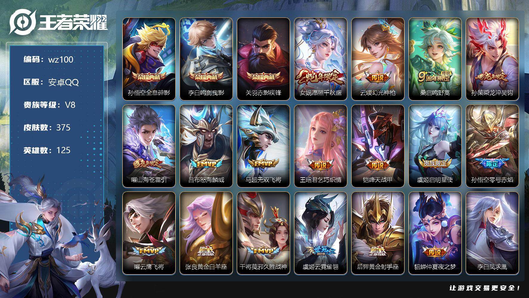 【账号佳】 【可二次实名】【wz100】【商品标题】:安卓Q-V8-最强王者段位-125英雄-375皮肤-3典藏-0珍品无双-0无双-0珍品传说-19传说-107史诗 【荣耀典藏】:孙悟空全息碎影,李白鸣剑曳影,关羽赤影疾锋 【传说皮肤】:女娲愿照千秋盛,云缨幻光神枪,桑启鸣野蒿,孙策乘龙淬吴钩,曜山海苍雷引,吕布怒海麟威,马超无双飞将,王昭君乞巧织情,铠绛天战甲,虞姬启明星使,孙悟空零号赤焰,曜云鹰飞将,张良黄金白羊座,干将莫邪久胜战神,虞姬云霓雀翎,后羿黄金射手座,貂蝉仲夏夜之梦,李白凤求凰,宫本武藏地狱之眼 【限定皮肤】:白起狰,大乔绒语心约,姜子牙天穹之誓,狄仁杰阴阳师,赵云皇家上将,墨子神迹守卫,嬴政优雅恋人,嬴政白昼王子,庄周玄嵩,庄周高山流水,高渐离死亡摇滚,阿轲迷踪丽影,钟无艳王者之锤,孙膑天狼运算者,白起夜都怪侠,芈月重明,芈月幻夜卜梦,吕布猎兽之王,元歌云间偶戏,元歌无心,夏侯惇朔风刀,甄姬女儿国国王,曹操烛龙,典韦穷奇,马可波罗暗影游猎,狄仁杰魔术师,狄仁杰万华元夜,达摩星际陆战队,达摩沙漠行僧,项羽海滩派对,老夫子醍醐杖,老夫子航海奇遇记,关羽冰锋战神,程咬金演武夺筹,韩信飞衡,兰陵王金庭之子,花木兰默契交锋,亚瑟潮玩骑士王,孙悟空至尊宝,孙悟空大圣娶亲,孙悟空零号赤焰,孙悟空孙行者,牛魔御旌,后羿圣弓游侠,李元芳银河之约,李元芳云中旅人,虞姬启明星使,钟馗驱傩正仪,杨玉环遇见飞天,杨玉环寅虎心曲,女娲朔望之晖,干将莫邪冰霜恋舞曲,干将莫邪胡桃夹子,干将莫邪真爱魔法,雅典娜单词大作战,雅典娜黎明之约,蔡文姬繁星吟游,太乙真人饕餮,太乙真人华丽摇滚,鬼谷子原初探秘者,鬼谷子五谷丰年,黄忠火炮绅士,苏烈千军破阵,百里玄策原初追逐者,百里守约朱雀志,弈星混沌棋,梦奇顽趣,沈梦溪星空之诺,沈梦溪大漠名商,明世隐疑决卦,明世隐吟游魔法,裴擒虎李小龙,裴擒虎擒涛扼浪,狂铁御狮,米莱狄御霄,米莱狄胡桃异想国,云中君纤云弄巧,伽罗天狼溯光者,盾山御銮,猪八戒西部大镖客,猪八戒猪悟能,上官婉儿梁祝,嫦娥拒霜思,曜山海苍雷引,蒙犽狂想玩偶喵,鲁班大师探海日志,镜匿光追影者,桑启海盐诗旅,艾琳流音漫舞,司空震地狱燃心,阿古朵江河有灵,张良古海寻踪,蒙犽百解令,蒙恬荣光圣徽,鬼谷子天穹祈灯,姬小满妄想食味,孙策乘龙淬吴钩,沈梦溪龙舞盛年,鲁班七号蔬乡物语,李元芳蔬乡物语,刘邦剑破天穹,程咬金群星魔术团,海诺心动手记 【年限皮肤】:百里守约朱雀志,杨玉环寅虎心曲,李白凤求凰,韩信飞衡,庄周玄嵩,马超神威,曜山海苍雷引,孙策乘龙淬吴钩 【赛季限定】:白起狰,芈月重明,夏侯惇朔风刀,曹操烛龙,典韦穷奇,狄仁杰万华元夜,达摩沙漠行僧,老夫子醍醐杖,程咬金演武夺筹,兰陵王金庭之子,张良古海寻踪,牛魔御旌,李元芳云中旅人,钟馗驱傩正仪,雅典娜黎明之约,太乙真人饕餮,鬼谷子原初探秘者,苏烈千军破阵,百里玄策原初追逐者,弈星混沌棋,梦奇顽趣,沈梦溪大漠名商,明世隐疑决卦,裴擒虎擒涛扼浪,狂铁御狮,米莱狄御霄,盾山御銮,鲁班大师探海日志,桑启海盐诗旅,鬼谷子天穹祈灯,蒙恬荣光圣徽,刘邦剑破天穹,姜子牙天穹之誓 【战令限定】:墨子神迹守卫,嬴政白昼王子,阿轲迷踪丽影,白起夜都怪侠,芈月幻夜卜梦,吕布猎兽之王,元歌云间偶戏,马可波罗暗影游猎,达摩星际陆战队,老夫子航海奇遇记,艾琳流音漫舞,亚瑟潮玩骑士王,后羿圣弓游侠,李元芳银河之约,女娲朔望之晖,干将莫邪真爱魔法,雅典娜单词大作战,黄忠火炮绅士,沈梦溪星空之诺,明世隐吟游魔法,米莱狄胡桃异想国,猪八戒西部大镖客,蒙犽狂想玩偶喵,司空震地狱燃心,鲁班七号蔬乡物语,李元芳蔬乡物语 【史诗皮肤】:鲁班七号电玩小子,项羽苍穹之光,露娜紫霞仙子,钟无艳王者之锤,赵云皇家上将,赵云未来纪元,貂蝉圣诞恋歌,甄姬冰雪圆舞曲,王昭君偶像歌手,狄仁杰魔术师,廉颇地狱岩魂,宫本武藏鬼剑武藏,孙尚香水果甜心,嬴政优雅恋人,嬴政暗夜贵公子,嬴政摇滚巨星,妲己魅力维加斯,妲己女仆咖啡,墨子龙骑士,墨子金属风暴,吕布圣诞狂欢,刘禅绅士熊喵,曹操幽灵船长,李白千年之狐,吕布末日机甲,张飞乱世虎臣,关羽冰锋战神,孙悟空至尊宝,花木兰水晶猎龙者,刘邦德古拉伯爵,夏侯惇乘风破浪,小乔缤纷独角兽,兰陵王暗隐猎兽者,诸葛亮黄金分割率,亚瑟心灵战警,安琪拉心灵骇客,百里守约特工魅影,铠曙光守护者,蔡文姬舞动绿茵,刘禅天才门将,李元芳逐浪之夏,程咬金功夫厨神,白起星夜王子,阿轲节奏热浪,杨玉环遇见飞天,嬴政白昼王子,孙策猫狗日记,大乔猫狗日记,百里守约朱雀志,干将莫邪冰霜恋舞曲,孙悟空大圣娶亲,伽罗箭羽风息,狄仁杰鹰眼统帅,公孙离无限星赏官,上官婉儿梁祝,蔡文姬繁星吟游,李元芳银河之约,韩信飞衡,庄周玄嵩,阿轲迷踪丽影,橘右京修罗,马超神威,孙尚香时之恋人,马可波