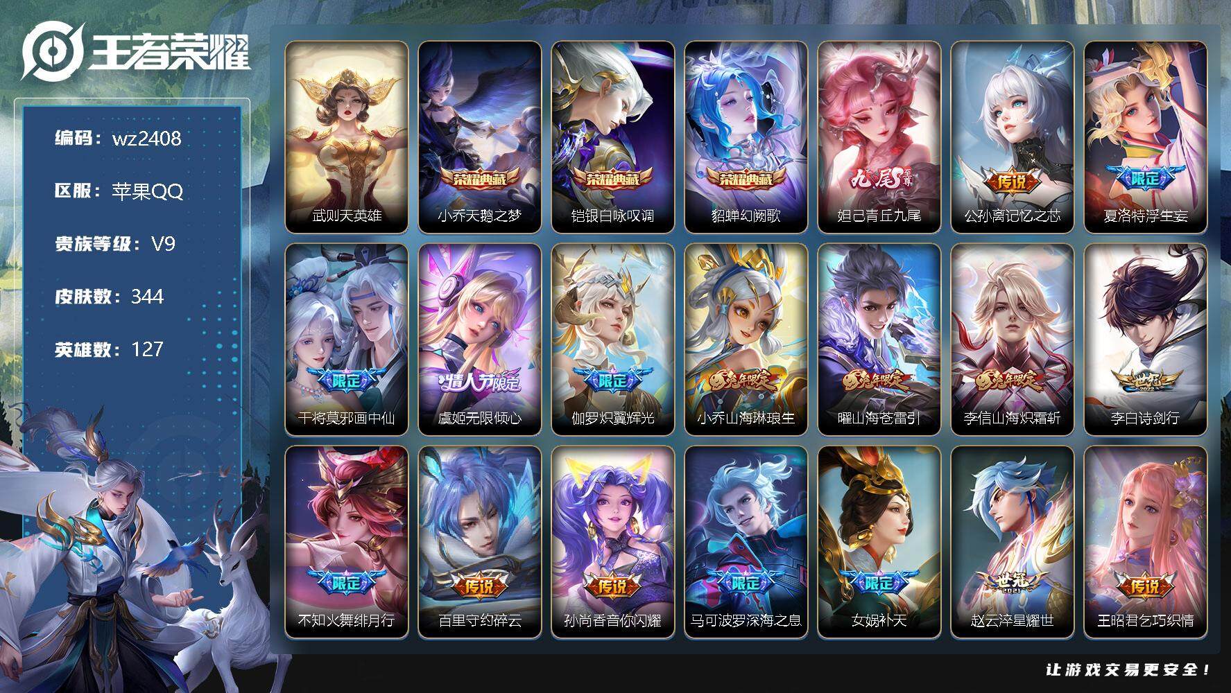 【账号佳】 【可二次实名】【wz2408】苹果Q-V9-永恒钻石III段位-127英雄-344皮肤-3典藏-0珍品无双-1无双-0珍品传说-31传说-98史诗 【英雄全皮】:狂铁全皮,夏洛特全皮,影全皮 【荣耀典藏】:武则天英雄,小乔天鹅之梦,铠银白咏叹调,貂蝉幻阙歌 【无双皮肤】:妲己青丘九尾 【传说皮肤】:公孙离记忆之芯,夏洛特浮生妄,干将莫邪画中仙,虞姬无限倾心,伽罗炽翼辉光,小乔山海琳琅生,曜山海苍雷引,李信山海炽霜斩,李白诗剑行,不知火舞绯月行,百里守约碎云,孙尚香音你闪耀,马可波罗深海之息,女娲补天,赵云淬星耀世,王昭君乞巧织情,西施游龙清影,曜李逍遥 ,周瑜音你心动,公孙离祈雪灵祝,诸葛亮时雨天司,铠绛天战甲,镜炽阳神光,虞姬启明星使,刘备时之恋人,貂蝉猫影幻舞,干将莫邪久胜战神,诸葛亮武陵仙君,李白凤求凰,宫本武藏地狱之眼,武则天海洋之心 【限定皮肤】:白起狰,狄仁杰阴阳师,小乔纯白花嫁,虞姬凯尔特女王,小乔山海琳琅生,赵云皇家上将,墨子神迹守卫,嬴政优雅恋人,嬴政白昼王子,庄周云端筑梦师,钟无艳超时空战士,孙膑妖精王,扁鹊炼金王,扁鹊奇幻香踪,吕布猎兽之王,元歌云间偶戏,元歌无心,甄姬游园惊梦,甄姬落雪兰心,典韦穷奇,马可波罗暗影游猎,马可波罗深海之息,马可波罗山海玄木吟,狄仁杰魔术师,狄仁杰万华元夜,达摩星际陆战队,达摩沙漠行僧,项羽海滩派对,老夫子醍醐杖,老夫子航海奇遇记,程咬金演武夺筹,韩信逐梦之影,王昭君午后时光,兰陵王金庭之子,不知火舞绯月行,亚瑟潮玩骑士王,孙悟空至尊宝,牛魔御旌,李元芳云中旅人,虞姬启明星使,虞姬无限倾心,钟馗驱傩正仪,杨戬潮玩骑兵,女娲朔望之晖,女娲补天,干将莫邪冰霜恋舞曲,干将莫邪画中仙,雅典娜单词大作战,蔡文姬繁星吟游,太乙真人饕餮,鬼谷子原初探秘者,鬼谷子五谷丰年,诸葛亮武陵仙君,诸葛亮时雨天司,黄忠烈魂,黄忠火炮绅士,苏烈千军破阵,百里守约朱雀志,弈星混沌棋,梦奇顽趣,公孙离祈雪灵祝,沈梦溪大漠名商,明世隐疑决卦,裴擒虎李小龙,裴擒虎擒涛扼浪,狂铁御狮,狂铁电玩高手,米莱狄御霄,米莱狄胡桃异想国,瑶山海碧波行,云中君纤云弄巧,李信山海炽霜斩,伽罗炽翼辉光,盾山御銮,猪八戒西部大镖客,嫦娥暖冬兔眠,曜李逍遥 ,曜山海苍雷引,蒙犽狂想玩偶喵,鲁班大师探海日志,盘古冰霜神祇,桑启海盐诗旅,夏洛特浮生妄,暃星界游侠,艾琳女武神,张良古海寻踪,鬼谷子天穹祈灯 【年限皮肤】:百里守约朱雀志,李白凤求凰,公孙离祈雪灵祝,诸葛亮时雨天司,黄忠烈魂,瑶山海碧波行,马可波罗山海玄木吟,李信山海炽霜斩,小乔山海琳琅生,曜山海苍雷引,伽罗炽翼辉光 【赛季限定】:孙膑妖精王,扁鹊炼金王,白起狰,典韦穷奇,狄仁杰万华元夜,达摩沙漠行僧,老夫子醍醐杖,程咬金演武夺筹,兰陵王金庭之子,张良古海寻踪,牛魔御旌,李元芳云中旅人,虞姬凯尔特女王,钟馗驱傩正仪,太乙真人饕餮,鬼谷子原初探秘者,苏烈千军破阵,弈星混沌棋,梦奇顽趣,沈梦溪大漠名商,明世隐疑决卦,裴擒虎擒涛扼浪,狂铁御狮,米莱狄御霄,盾山御銮,鲁班大师探海日志,桑启海盐诗旅,鬼谷子天穹祈灯 【战令限定】:墨子神迹守卫,嬴政白昼王子,钟无艳超时空战士,扁鹊奇幻香踪,吕布猎兽之王,元歌云间偶戏,甄姬落雪兰心,马可波罗暗影游猎,达摩星际陆战队,老夫子航海奇遇记,王昭君午后时光,亚瑟潮玩骑士王,杨戬潮玩骑兵,女娲朔望之晖,雅典娜单词大作战,黄忠火炮绅士,狂铁电玩高手,米莱狄胡桃异想国,猪八戒西部大镖客,嫦娥暖冬兔眠,蒙犽狂想玩偶喵,暃星界游侠 【史诗皮肤】:鲁班七号电玩小子,项羽苍穹之光,露娜紫霞仙子,赵云皇家上将,赵云未来纪元,貂蝉圣诞恋歌,甄姬冰雪圆舞曲,王昭君偶像歌手,狄仁杰魔术师,廉颇地狱岩魂,宫本武藏鬼剑武藏,孙尚香水果甜心,嬴政优雅恋人,嬴政暗夜贵公子,嬴政摇滚巨星,妲己魅力维加斯,妲己女仆咖啡,墨子龙骑士,墨子金属风暴,吕布圣诞狂欢,刘禅绅士熊喵,小乔纯白花嫁,曹操幽灵船长,李白千年之狐,吕布末日机甲,张飞乱世虎臣,孙悟空至尊宝,花木兰水晶猎龙者,刘邦德古拉伯爵,韩信逐梦之影,夏侯惇乘风破浪,小乔缤纷独角兽,兰陵王暗隐猎兽者,诸葛亮黄金分割率,甄姬游园惊梦,亚瑟心灵战警,雅典娜冰冠公主,安琪拉心灵骇客,庄周云端筑梦师,百里守约特工魅影,铠曙光守护者,蔡文姬舞动绿茵,刘禅天才门将,李元芳逐浪之夏,程咬金功夫厨神,白起星夜王子,阿轲节奏热浪,嬴政白昼王子,孙策猫狗日记,大乔猫狗日记,百里守约朱雀志,干将莫邪冰霜恋舞曲,伽罗箭羽风息,狄仁杰鹰眼统帅,公孙离无限星赏官,蔡文姬繁星吟游,娜可露露晚萤,大乔白蛇,小乔青蛇,不知火舞魅语,橘右京修罗,黄忠烈魂,孙尚香时之恋人,马可波罗暗影游猎,蒙犽狂想玩偶喵,裴擒虎李小龙,云中君纤云弄巧,元歌云间偶戏,米莱狄胡桃异想国,西施诗语