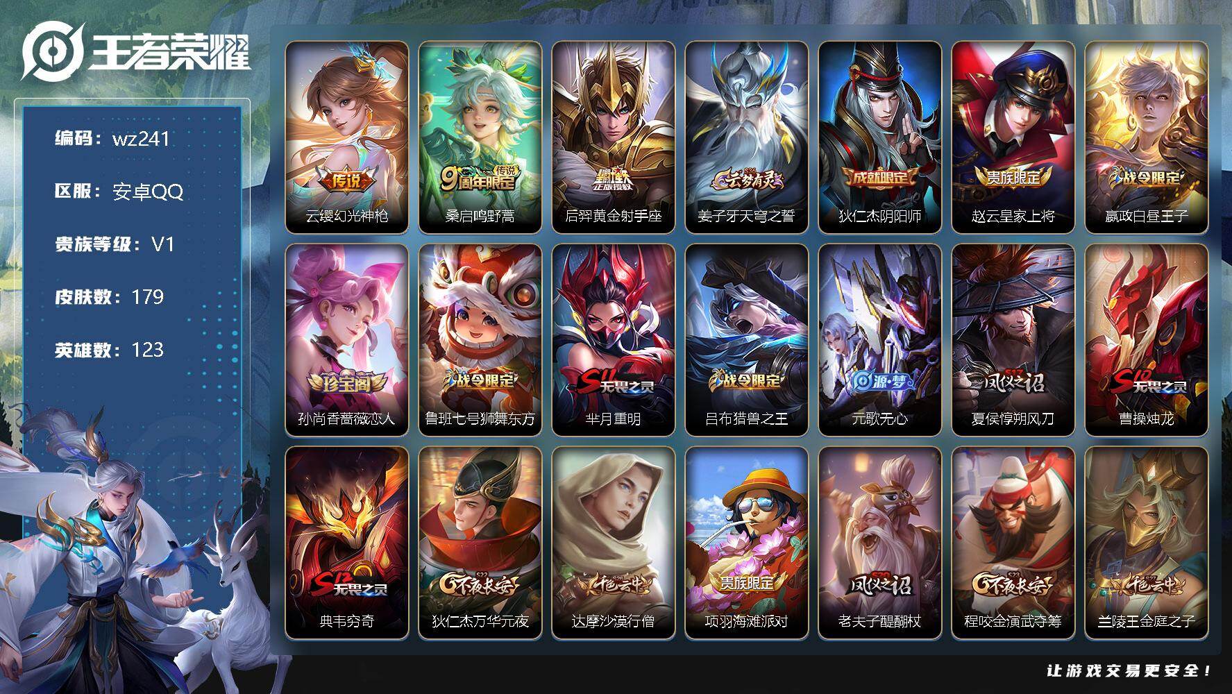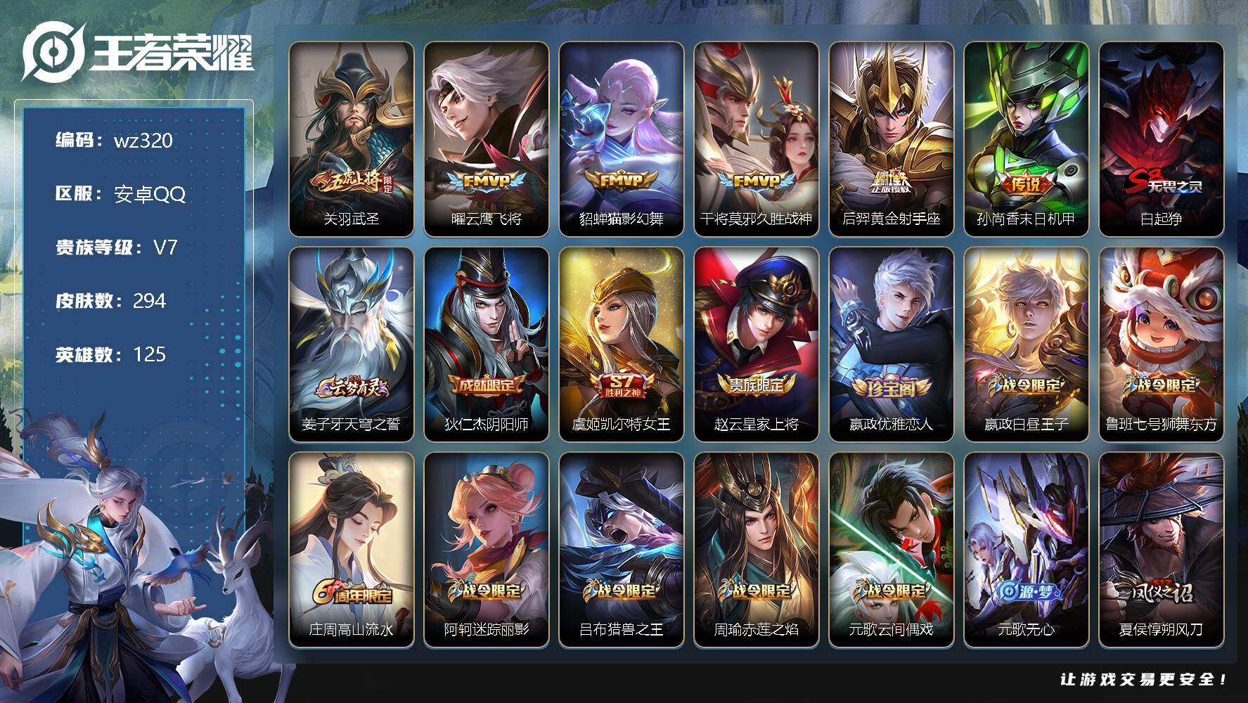 【账号佳】 【可二次实名】【wz320】【商品标题】:安卓Q-V7-最强王者段位-125英雄-294皮肤-0典藏-0珍品无双-0无双-0珍品传说-6传说-69史诗 【传说皮肤】:关羽武圣,曜云鹰飞将,貂蝉猫影幻舞,干将莫邪久胜战神,后羿黄金射手座,孙尚香末日机甲 【限定皮肤】:白起狰,姜子牙天穹之誓,狄仁杰阴阳师,虞姬凯尔特女王,赵云皇家上将,嬴政优雅恋人,嬴政白昼王子,鲁班七号狮舞东方,庄周高山流水,阿轲迷踪丽影,吕布猎兽之王,周瑜赤莲之焰,元歌云间偶戏,元歌无心,夏侯惇朔风刀,甄姬游园惊梦,曹操烛龙,曹操天狼征服者,典韦穷奇,典韦蓝屏警告,马可波罗暗影游猎,狄仁杰魔术师,狄仁杰万华元夜,达摩星际陆战队,达摩沙漠行僧,项羽海滩派对,老夫子醍醐杖,关羽武圣,程咬金演武夺筹,露娜一生所爱,刘邦夺宝奇兵,韩信飞衡,兰陵王金庭之子,亚瑟潮玩骑士王,孙悟空大圣娶亲,牛魔御旌,张飞虎魄,李元芳银河之约,李元芳云中旅人,钟馗神迹守卫,钟馗驱傩正仪,杨玉环遇见飞天,女娲朔望之晖,干将莫邪胡桃夹子,雅典娜单词大作战,雅典娜黎明之约,蔡文姬繁星吟游,太乙真人饕餮,鬼谷子原初探秘者,鬼谷子五谷丰年,苏烈千军破阵,百里玄策原初追逐者,弈星混沌棋,梦奇顽趣,沈梦溪星空之诺,沈梦溪大漠名商,明世隐疑决卦,裴擒虎天狼狩猎者,裴擒虎李小龙,裴擒虎擒涛扼浪,狂铁御狮,米莱狄御霄,米莱狄胡桃异想国,盾山御銮,猪八戒西部大镖客,猪八戒猪悟能,上官婉儿梁祝,上官婉儿天狼绘梦者,蒙犽狂想玩偶喵,鲁班大师探海日志,桑启海盐诗旅,阿古朵江河有灵,张良古海寻踪,蒙恬荣光圣徽,鬼谷子天穹祈灯,沈梦溪龙舞盛年,鲁班七号蔬乡物语,李元芳蔬乡物语,刘邦剑破天穹,刘备异域游侠 【年限皮肤】:韩信飞衡,马超神威,关羽武圣,张飞虎魄 【赛季限定】:白起狰,夏侯惇朔风刀,曹操烛龙,典韦穷奇,狄仁杰万华元夜,达摩沙漠行僧,老夫子醍醐杖,程咬金演武夺筹,兰陵王金庭之子,张良古海寻踪,牛魔御旌,李元芳云中旅人,虞姬凯尔特女王,钟馗驱傩正仪,雅典娜黎明之约,太乙真人饕餮,鬼谷子原初探秘者,苏烈千军破阵,百里玄策原初追逐者,弈星混沌棋,梦奇顽趣,沈梦溪大漠名商,明世隐疑决卦,裴擒虎擒涛扼浪,狂铁御狮,米莱狄御霄,盾山御銮,鲁班大师探海日志,桑启海盐诗旅,鬼谷子天穹祈灯,蒙恬荣光圣徽,刘邦剑破天穹,姜子牙天穹之誓 【战令限定】:嬴政白昼王子,鲁班七号狮舞东方,阿轲迷踪丽影,吕布猎兽之王,周瑜赤莲之焰,元歌云间偶戏,典韦蓝屏警告,马可波罗暗影游猎,达摩星际陆战队,刘邦夺宝奇兵,亚瑟潮玩骑士王,李元芳银河之约,钟馗神迹守卫,女娲朔望之晖,雅典娜单词大作战,沈梦溪星空之诺,米莱狄胡桃异想国,猪八戒西部大镖客,蒙犽狂想玩偶喵,鲁班七号蔬乡物语,李元芳蔬乡物语 【史诗皮肤】:露娜紫霞仙子,阿轲暗夜猫娘,赵云皇家上将,赵云未来纪元,貂蝉圣诞恋歌,甄姬冰雪圆舞曲,王昭君偶像歌手,狄仁杰魔术师,廉颇地狱岩魂,宫本武藏鬼剑武藏,孙尚香水果甜心,嬴政优雅恋人,嬴政摇滚巨星,妲己魅力维加斯,妲己女仆咖啡,墨子金属风暴,吕布圣诞狂欢,曹操幽灵船长,李白千年之狐,张飞乱世虎臣,韩信白龙吟,花木兰水晶猎龙者,夏侯惇乘风破浪,小乔缤纷独角兽,兰陵王暗隐猎兽者,甄姬游园惊梦,雅典娜冰冠公主,蔡文姬舞动绿茵,刘禅天才门将,李元芳逐浪之夏,白起星夜王子,杨玉环遇见飞天,嬴政白昼王子,孙策猫狗日记,大乔猫狗日记,露娜一生所爱,孙悟空大圣娶亲,典韦蓝屏警告,伽罗箭羽风息,裴擒虎天狼狩猎者,鲁班七号狮舞东方,狄仁杰鹰眼统帅,上官婉儿梁祝,曹操天狼征服者,蔡文姬繁星吟游,李元芳银河之约,韩信飞衡,阿轲迷踪丽影,橘右京修罗,马超神威,上官婉儿天狼绘梦者,马可波罗暗影游猎,张飞虎魄,蒙犽狂想玩偶喵,百里玄策原初追逐者,裴擒虎李小龙,元歌云间偶戏,米莱狄胡桃异想国,猪八戒猪悟能,庄周高山流水,雅典娜黎明之约,鬼谷子五谷丰年,元歌无心,梦奇顽趣,刘禅电玩爆裂旋风,阿古朵江河有灵,周瑜雪夜绮愿,蒙恬荣光圣徽,鲁班七号蔬乡物语 【其他皮肤】:项羽海滩派对,韩信教廷特使,韩信街头霸王,露娜哥特玫瑰,阿轲致命风华,阿轲爱心护理,达摩大发明家,赵云白执事,赵云忍炎影,芈月红桃皇后,程咬金星际陆战队,白起白色死神,牛魔西部大镖客,扁鹊化身博士,宫本武藏未来纪元,安琪拉玩偶对对碰,孙膑天使之翼,姜子牙时尚教父,妲己少女阿狸,典韦黄金武士,亚瑟死亡骑士,达摩拳王,花木兰兔女郎,张飞五福同心,甄姬花好人间,刘备万事如意,宫本武藏万象初新,后羿阿尔法小队,狄仁杰阴阳师,刘备纽约教父,刘备汉昭烈帝,关羽龙腾万里,虞姬凯尔特女王,墨子进击墨子号,白起狰,钟无艳海滩丽影,太乙真人饕餮,宫本武藏霸王丸,曹操烛龙,王昭君幻想奇妙夜,狂铁命运角斗场,老夫子功夫老勺,牛魔制霸全明星,孙尚香沉稳之力,典韦穷
