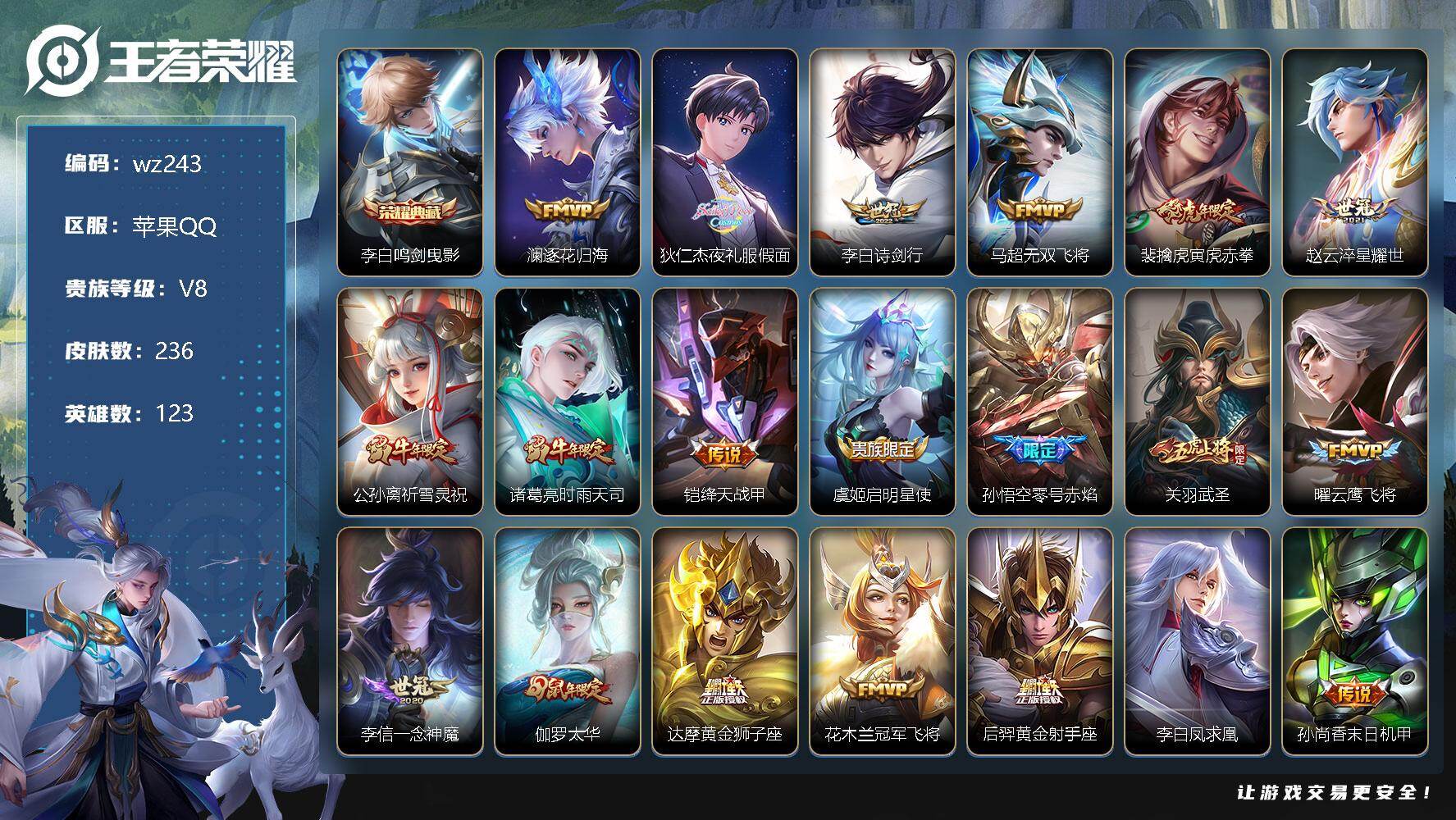 【账号佳】 【可二次实名】【wz243】【商品标题】:苹果Q-V8-至尊星耀IV段位-123英雄-236皮肤-1典藏-0珍品无双-0无双-0珍品传说-23传说-82史诗 【荣耀典藏】:李白鸣剑曳影 【传说皮肤】:澜逐花归海,狄仁杰夜礼服假面,李白诗剑行,马超无双飞将,裴擒虎寅虎赤拳,赵云淬星耀世,公孙离祈雪灵祝,诸葛亮时雨天司,铠绛天战甲,虞姬启明星使,孙悟空零号赤焰,关羽武圣,曜云鹰飞将,李信一念神魔,伽罗太华,达摩黄金狮子座,花木兰冠军飞将,后羿黄金射手座,李白凤求凰,孙尚香末日机甲,宫本武藏地狱之眼,孙悟空地狱火,狄仁杰超时空战士 【限定皮肤】:狄仁杰阴阳师,廉颇寅虎御盾,赵云皇家上将,赵云龙胆,墨子神迹守卫,孙尚香蔷薇恋人,钟无艳超时空战士,芈月重明,吕布御风骁将,元歌云间偶戏,元歌无心,夏侯惇朔风刀,甄姬落雪兰心,典韦穷奇,典韦岱宗,马可波罗暗影游猎,马可波罗山海玄木吟,狄仁杰魔术师,狄仁杰万华元夜,达摩星际陆战队,达摩沙漠行僧,项羽海滩派对,项羽霸王别姬,老夫子醍醐杖,老夫子航海奇遇记,关羽冰锋战神,关羽武圣,程咬金演武夺筹,韩信飞衡,韩信傲雪梅枪,兰陵王金庭之子,亚瑟潮玩骑士王,孙悟空至尊宝,孙悟空大圣娶亲,孙悟空零号赤焰,后羿辉光之辰,刘备百相守梦,李元芳银河之约,李元芳云中旅人,虞姬霸王别姬,虞姬启明星使,钟馗驱傩正仪,杨戬潮玩骑兵,女娲朔望之晖,干将莫邪冰霜恋舞曲,鬼谷子原初探秘者,诸葛亮时雨天司,苏烈千军破阵,弈星混沌棋,公孙离祈雪灵祝,沈梦溪星空之诺,沈梦溪大漠名商,明世隐疑决卦,裴擒虎李小龙,裴擒虎寅虎赤拳,裴擒虎擒涛扼浪,狂铁御狮,米莱狄御霄,米莱狄胡桃异想国,云中君纤云弄巧,伽罗太华,盾山御銮,猪八戒西部大镖客,嫦娥拒霜思,嫦娥暖冬兔眠,鲁班大师探海日志,桑启海盐诗旅,暃星界游侠,张良古海寻踪,狄仁杰夜礼服假面,蒙犽百解令,高渐离燃音魔法,妲己灵卜魔法,鬼谷子天穹祈灯 【年限皮肤】:裴擒虎寅虎赤拳,廉颇寅虎御盾,李白凤求凰,后羿辉光之辰,公孙离祈雪灵祝,吕布御风骁将,诸葛亮时雨天司,伽罗太华,韩信飞衡,典韦岱宗,关羽武圣,赵云龙胆,马可波罗山海玄木吟 【赛季限定】:芈月重明,夏侯惇朔风刀,典韦穷奇,狄仁杰万华元夜,达摩沙漠行僧,老夫子醍醐杖,程咬金演武夺筹,兰陵王金庭之子,张良古海寻踪,李元芳云中旅人,钟馗驱傩正仪,鬼谷子原初探秘者,苏烈千军破阵,弈星混沌棋,沈梦溪大漠名商,明世隐疑决卦,裴擒虎擒涛扼浪,狂铁御狮,米莱狄御霄,盾山御銮,鲁班大师探海日志,桑启海盐诗旅,鬼谷子天穹祈灯 【战令限定】:墨子神迹守卫,钟无艳超时空战士,元歌云间偶戏,甄姬落雪兰心,马可波罗暗影游猎,达摩星际陆战队,老夫子航海奇遇记,亚瑟潮玩骑士王,李元芳银河之约,杨戬潮玩骑兵,女娲朔望之晖,沈梦溪星空之诺,米莱狄胡桃异想国,猪八戒西部大镖客,嫦娥暖冬兔眠,暃星界游侠,高渐离燃音魔法,妲己灵卜魔法 【史诗皮肤】:鲁班七号电玩小子,项羽苍穹之光,露娜紫霞仙子,阿轲暗夜猫娘,赵云皇家上将,赵云未来纪元,貂蝉圣诞恋歌,甄姬冰雪圆舞曲,王昭君偶像歌手,狄仁杰魔术师,廉颇地狱岩魂,孙尚香蔷薇恋人,孙尚香水果甜心,嬴政暗夜贵公子,嬴政摇滚巨星,妲己魅力维加斯,妲己女仆咖啡,墨子金属风暴,吕布圣诞狂欢,曹操幽灵船长,李白千年之狐,吕布末日机甲,韩信白龙吟,项羽霸王别姬,虞姬霸王别姬,关羽冰锋战神,孙悟空至尊宝,花木兰水晶猎龙者,刘邦德古拉伯爵,夏侯惇乘风破浪,小乔缤纷独角兽,兰陵王暗隐猎兽者,诸葛亮黄金分割率,亚瑟心灵战警,雅典娜冰冠公主,安琪拉心灵骇客,后羿辉光之辰,百里守约特工魅影,铠曙光守护者,蔡文姬舞动绿茵,刘禅天才门将,李元芳逐浪之夏,程咬金功夫厨神,白起星夜王子,阿轲节奏热浪,孙策猫狗日记,干将莫邪冰霜恋舞曲,孙悟空大圣娶亲,伽罗箭羽风息,狄仁杰鹰眼统帅,公孙离无限星赏官,李元芳银河之约,韩信飞衡,典韦岱宗,不知火舞魅语,橘右京修罗,赵云龙胆,马可波罗暗影游猎,裴擒虎李小龙,云中君纤云弄巧,元歌云间偶戏,吕布御风骁将,米莱狄胡桃异想国,百里玄策热力回旋,老夫子航海奇遇记,杨戬天秀启明,嫦娥拒霜思,韩信傲雪梅枪,廉颇寅虎御盾,澜赏金猎手,钟无艳超时空战士,元歌无心,暃星界游侠,马可波罗山海玄木吟,刘备百相守梦,蒙犽百解令,妲己灵卜魔法,高渐离燃音魔法,刘禅鸭鸭历险记,狂铁龙之律动,牛魔小牛鸭,后羿石田雨龙,云缨赞萌露比 【其他皮肤】:项羽海滩派对,韩信教廷特使,韩信街头霸王,露娜哥特玫瑰,阿轲爱心护理,达摩大发明家,赵云忍炎影,芈月红桃皇后,程咬金星际陆战队,白起白色死神,牛魔西部大镖客,扁鹊化身博士,安琪拉玩偶对对碰,孙膑天使之翼,妲己少女阿狸,典韦黄金武士,亚瑟死亡骑士,达摩拳王,花木兰兔女郎,张飞五福同心,甄姬花好人间,刘备万事如意,宫本武藏万