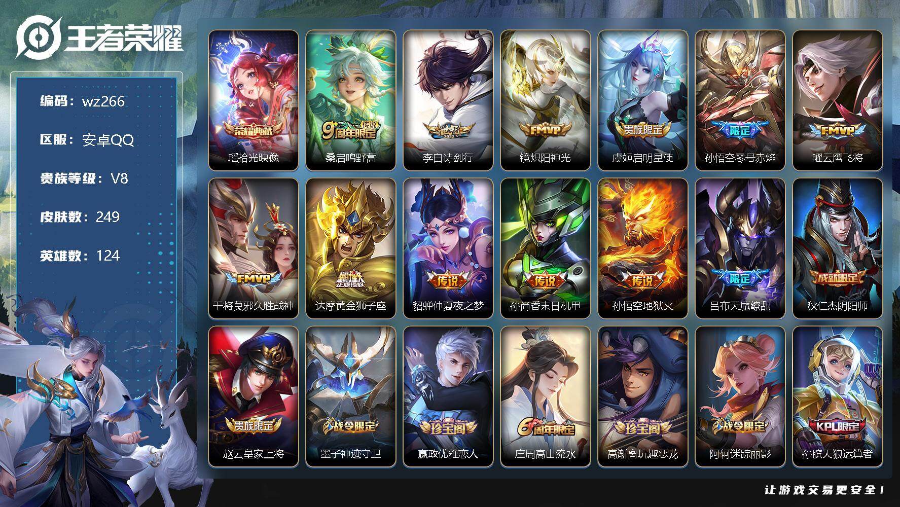 【账号佳】 【可二次实名】【wz266】【商品标题】:安卓Q-V8-永恒钻石II段位-124英雄-249皮肤-1典藏-0珍品无双-0无双-0珍品传说-12传说-71史诗 【荣耀典藏】:瑶拾光映像 【传说皮肤】:桑启鸣野蒿,李白诗剑行,镜炽阳神光,虞姬启明星使,孙悟空零号赤焰,曜云鹰飞将,干将莫邪久胜战神,达摩黄金狮子座,貂蝉仲夏夜之梦,孙尚香末日机甲,孙悟空地狱火,吕布天魔缭乱 【限定皮肤】:狄仁杰阴阳师,赵云皇家上将,墨子神迹守卫,嬴政优雅恋人,庄周高山流水,高渐离玩趣恶龙,阿轲迷踪丽影,孙膑天狼运算者,芈月白晶晶,吕布天魔缭乱,周瑜赤莲之焰,元歌云间偶戏,元歌无心,夏侯惇朔风刀,甄姬游园惊梦,马可波罗暗影游猎,马可波罗山海玄木吟,狄仁杰魔术师,狄仁杰万华元夜,达摩星际陆战队,达摩沙漠行僧,项羽海滩派对,老夫子醍醐杖,老夫子航海奇遇记,关羽冰锋战神,程咬金演武夺筹,刘邦夺宝奇兵,韩信飞衡,韩信傲雪梅枪,兰陵王驯魔猎人,兰陵王金庭之子,亚瑟潮玩骑士王,孙悟空至尊宝,孙悟空大圣娶亲,孙悟空零号赤焰,牛魔御旌,后羿如梦令,李元芳银河之约,李元芳云中旅人,虞姬启明星使,钟馗神迹守卫,钟馗驱傩正仪,杨玉环遇见飞天,雅典娜单词大作战,蔡文姬繁星吟游,鬼谷子原初探秘者,苏烈千军破阵,百里玄策原初追逐者,百里守约朱雀志,弈星混沌棋,沈梦溪星空之诺,沈梦溪大漠名商,明世隐疑决卦,裴擒虎李小龙,裴擒虎擒涛扼浪,米莱狄胡桃异想国,云中君纤云弄巧,盾山御銮,猪八戒西部大镖客,上官婉儿梁祝,蒙犽狂想玩偶喵,鲁班大师探海日志,桑启海盐诗旅,阿古朵江河有灵,张良古海寻踪,蒙恬荣光圣徽,高渐离燃音魔法,妲己灵卜魔法,鬼谷子天穹祈灯,刘邦剑破天穹,程咬金群星魔术团,镜青焰无极,项羽苍威无极,刘备异域游侠,周瑜熔金海岸 【年限皮肤】:百里守约朱雀志,韩信飞衡,马可波罗山海玄木吟 【赛季限定】:夏侯惇朔风刀,狄仁杰万华元夜,达摩沙漠行僧,老夫子醍醐杖,程咬金演武夺筹,兰陵王金庭之子,张良古海寻踪,牛魔御旌,李元芳云中旅人,钟馗驱傩正仪,鬼谷子原初探秘者,苏烈千军破阵,百里玄策原初追逐者,弈星混沌棋,沈梦溪大漠名商,明世隐疑决卦,裴擒虎擒涛扼浪,盾山御銮,鲁班大师探海日志,桑启海盐诗旅,鬼谷子天穹祈灯,蒙恬荣光圣徽,刘邦剑破天穹 【战令限定】:墨子神迹守卫,阿轲迷踪丽影,周瑜赤莲之焰,元歌云间偶戏,马可波罗暗影游猎,达摩星际陆战队,老夫子航海奇遇记,刘邦夺宝奇兵,兰陵王驯魔猎人,亚瑟潮玩骑士王,李元芳银河之约,钟馗神迹守卫,雅典娜单词大作战,沈梦溪星空之诺,米莱狄胡桃异想国,猪八戒西部大镖客,蒙犽狂想玩偶喵,高渐离燃音魔法,妲己灵卜魔法,镜青焰无极,项羽苍威无极 【史诗皮肤】:鲁班七号电玩小子,阿轲暗夜猫娘,赵云皇家上将,赵云未来纪元,貂蝉圣诞恋歌,甄姬冰雪圆舞曲,狄仁杰魔术师,廉颇地狱岩魂,宫本武藏鬼剑武藏,孙尚香水果甜心,嬴政优雅恋人,嬴政暗夜贵公子,嬴政摇滚巨星,妲己魅力维加斯,妲己女仆咖啡,墨子金属风暴,吕布圣诞狂欢,刘禅绅士熊喵,曹操幽灵船长,李白千年之狐,吕布末日机甲,张飞乱世虎臣,韩信白龙吟,关羽冰锋战神,孙悟空至尊宝,花木兰水晶猎龙者,夏侯惇乘风破浪,小乔缤纷独角兽,兰陵王暗隐猎兽者,甄姬游园惊梦,安琪拉心灵骇客,百里守约特工魅影,铠曙光守护者,蔡文姬舞动绿茵,李元芳逐浪之夏,白起星夜王子,杨玉环遇见飞天,大乔猫狗日记,百里守约朱雀志,孙悟空大圣娶亲,狄仁杰鹰眼统帅,兰陵王驯魔猎人,上官婉儿梁祝,蔡文姬繁星吟游,李元芳银河之约,韩信飞衡,后羿如梦令,不知火舞魅语,阿轲迷踪丽影,孙尚香时之恋人,马可波罗暗影游猎,蒙犽狂想玩偶喵,百里玄策原初追逐者,裴擒虎李小龙,云中君纤云弄巧,孙膑天狼运算者,元歌云间偶戏,芈月白晶晶,米莱狄胡桃异想国,老夫子航海奇遇记,庄周高山流水,韩信傲雪梅枪,元歌无心,马可波罗山海玄木吟,刘禅电玩爆裂旋风,阿古朵江河有灵,妲己灵卜魔法,高渐离燃音魔法,蒙恬荣光圣徽,镜青焰无极,阿轲化蝶舞,公孙离涂山容容 【其他皮肤】:项羽海滩派对,韩信教廷特使,韩信街头霸王,露娜哥特玫瑰,阿轲爱心护理,赵云白执事,赵云忍炎影,芈月红桃皇后,白起白色死神,牛魔西部大镖客,武则天东方不败,扁鹊化身博士,宫本武藏未来纪元,安琪拉玩偶对对碰,孙膑天使之翼,姜子牙时尚教父,妲己少女阿狸,典韦黄金武士,亚瑟死亡骑士,花木兰兔女郎,张飞五福同心,甄姬花好人间,刘备万事如意,宫本武藏万象初新,狄仁杰阴阳师,刘备纽约教父,刘备汉昭烈帝,关羽龙腾万里,钟无艳海滩丽影,宫本武藏霸王丸,王昭君幻想奇妙夜,狂铁命运角斗场,老夫子功夫老勺,孙尚香沉稳之力,李白敏锐之力,鬼谷子幻乐之宴,苏烈坚韧之力,大乔守护之力,项羽科学大爆炸,明世隐虹云星官,庄周奇妙博物学,牛魔御旌,钟馗神迹守卫,盾山御銮,