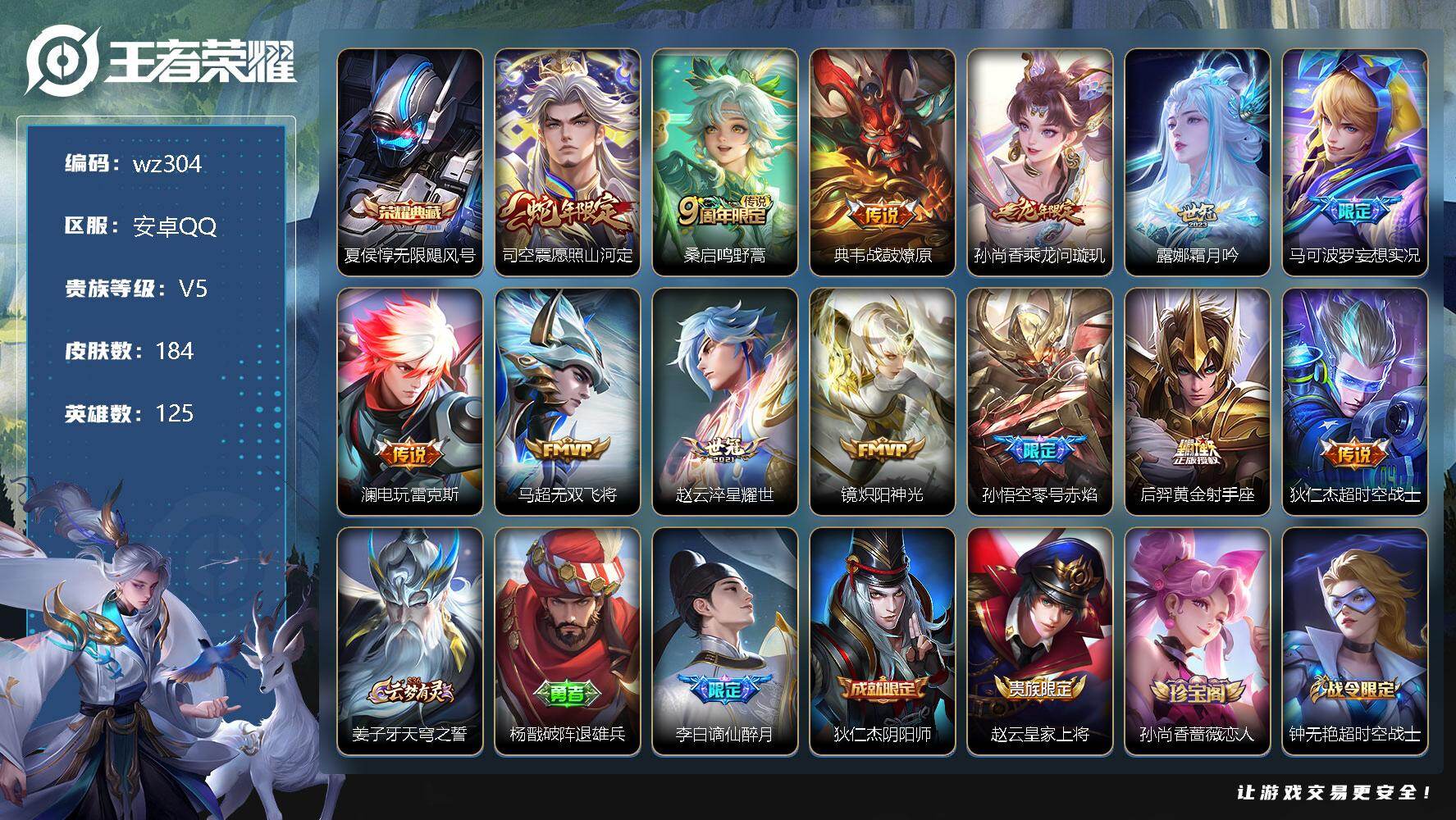 【账号佳】 【可二次实名】【wz304】【商品标题】:安卓Q-V5-最强王者段位-125英雄-184皮肤-1典藏-0珍品无双-0无双-0珍品传说-13传说-53史诗 【荣耀典藏】:夏侯惇无限飓风号 【传说皮肤】:司空震愿照山河定,桑启鸣野蒿,典韦战鼓燎原,孙尚香乘龙问璇玑,露娜霜月吟,马可波罗妄想实况,澜电玩雷克斯,马超无双飞将,赵云淬星耀世,镜炽阳神光,孙悟空零号赤焰,后羿黄金射手座,狄仁杰超时空战士 【限定皮肤】:姜子牙天穹之誓,杨戬破阵退雄兵,李白谪仙醉月,狄仁杰阴阳师,赵云皇家上将,孙尚香蔷薇恋人,钟无艳超时空战士,元歌无心,甄姬落雪兰心,马可波罗山海玄木吟,马可波罗妄想实况,狄仁杰魔术师,达摩沙漠行僧,项羽海滩派对,程咬金演武夺筹,韩信飞衡,兰陵王金庭之子,孙悟空至尊宝,孙悟空零号赤焰,李元芳云中旅人,钟馗驱傩正仪,杨玉环遇见飞天,鬼谷子五谷丰年,苏烈千军破阵,百里玄策原初追逐者,沈梦溪大漠名商,裴擒虎李小龙,裴擒虎擒涛扼浪,鲁班大师探海日志,桑启海盐诗旅,阿古朵江河有灵,张良古海寻踪,高渐离燃音魔法,妲己灵卜魔法,鬼谷子天穹祈灯,姬小满妄想食味,孙尚香乘龙问璇玑,沈梦溪龙舞盛年,刘邦剑破天穹,程咬金群星魔术团,镜青焰无极,项羽苍威无极,周瑜熔金海岸 【年限皮肤】:韩信飞衡,马可波罗山海玄木吟,孙尚香乘龙问璇玑 【赛季限定】:达摩沙漠行僧,程咬金演武夺筹,兰陵王金庭之子,张良古海寻踪,李元芳云中旅人,钟馗驱傩正仪,苏烈千军破阵,百里玄策原初追逐者,沈梦溪大漠名商,裴擒虎擒涛扼浪,鲁班大师探海日志,桑启海盐诗旅,鬼谷子天穹祈灯,刘邦剑破天穹,姜子牙天穹之誓 【战令限定】:钟无艳超时空战士,甄姬落雪兰心,高渐离燃音魔法,妲己灵卜魔法,镜青焰无极,项羽苍威无极 【史诗皮肤】:赵云皇家上将,赵云未来纪元,甄姬冰雪圆舞曲,王昭君偶像歌手,狄仁杰魔术师,宫本武藏鬼剑武藏,孙尚香蔷薇恋人,孙尚香水果甜心,妲己魅力维加斯,妲己女仆咖啡,墨子龙骑士,墨子金属风暴,吕布圣诞狂欢,曹操幽灵船长,吕布末日机甲,孙悟空至尊宝,花木兰水晶猎龙者,刘邦德古拉伯爵,夏侯惇乘风破浪,兰陵王暗隐猎兽者,诸葛亮黄金分割率,亚瑟心灵战警,雅典娜冰冠公主,安琪拉心灵骇客,百里守约特工魅影,铠曙光守护者,李元芳逐浪之夏,程咬金功夫厨神,白起星夜王子,阿轲节奏热浪,杨玉环遇见飞天,伽罗箭羽风息,狄仁杰鹰眼统帅,韩信飞衡,百里玄策原初追逐者,裴擒虎李小龙,司马懿暗渊魔法,钟无艳超时空战士,鬼谷子五谷丰年,元歌无心,马可波罗山海玄木吟,阿古朵江河有灵,周瑜雪夜绮愿,妲己灵卜魔法,高渐离燃音魔法,姬小满妄想食味,镜青焰无极,亚连破空之剑,李白谪仙醉月,牛魔星界战将,姬小满飞车小橘子,赵怀真器灵浮梦炉,狂铁龙之律动,后羿石田雨龙 【其他皮肤】:项羽海滩派对,韩信教廷特使,韩信街头霸王,达摩大发明家,赵云白执事,赵云忍炎影,芈月红桃皇后,白起白色死神,牛魔西部大镖客,扁鹊化身博士,扁鹊救世之瞳,孙膑天使之翼,妲己少女阿狸,典韦黄金武士,亚瑟死亡骑士,花木兰兔女郎,张飞五福同心,甄姬花好人间,宫本武藏万象初新,后羿阿尔法小队,狄仁杰阴阳师,刘备纽约教父,李元芳黑猫爱糖果,关羽龙腾万里,钟无艳海滩丽影,老夫子功夫老勺,孙尚香沉稳之力,诸葛亮掌控之力,李白敏锐之力,鬼谷子幻乐之宴,苏烈坚韧之力,大乔守护之力,明世隐虹云星官,小乔丁香结,吕布野性能量,沈梦溪鲨炮海盗猫,哪吒次元突破,盾山圆桌骑士,狂铁特工战影,刘禅秘密基地,程咬金演武夺筹,张良缤纷绘卷,钟馗驱傩正仪,鲁班大师乓乓大师,苏烈千军破阵,典韦铁甲之心,达摩沙漠行僧,程咬金无双福将,兰陵王金庭之子,刘禅唤灵魔甲,沈梦溪大漠名商,甄姬落雪兰心,李元芳云中旅人,戈娅危途狂花,桑启海盐诗旅,海月幻泉雾影,猪八戒潮玩探月行,白起乐园追猎者,裴擒虎擒涛扼浪,太乙真人劲辣红锅,莱西奥西部游侠,鲁班大师探海日志,李元芳妄想特派,张良古海寻踪,钟无艳聚星闪耀,后羿完美运算,鬼谷子天穹祈灯,妲己灵卜魔法,朵莉亚金色潮汐,廉颇功夫炙烤,亚瑟鸿运当头,沈梦溪龙舞盛年,钟无艳春野之旅,刘邦剑破天穹,程咬金群星魔术团,项羽苍威无极,杨戬破阵退雄兵,姜子牙天穹之誓,周瑜熔金海岸,孙悟空神迹守卫,东皇太一噬灭天穹,亚瑟动物派对,干将莫邪雾都夜雨,苍苍林狼骑,太乙真人谧流熔炉,典韦铁骨偃魂,西施雪境奇遇,姜子牙星梦巡礼,钟馗虚灵犬护,阿古朵布丁狗之约,露娜命运加冕,姬小满小满鸭,白起死霸装,甄姬逆浪荇歌,庄周锦麟游梦,莱西奥踏浪烽翎,貂蝉异域舞娘,曹操超能战警,张良一千零一夜,小乔万圣前夜,孙悟空西部大镖客,铠龙域领主,百里玄策威尼斯狂欢,梦奇美梦成真,元歌午夜歌剧院,司马懿魇语军师,李信灼热之刃,嫦娥露花倒影,猪八戒年年有余,曜归虚梦演,马超幸存者,镜冰刃幻境,阿古朵熊喵