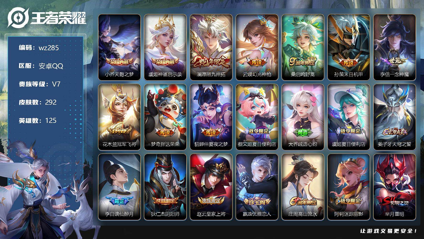 【账号佳】 【可二次实名】【wz285】【商品标题】:安卓Q-V7-至尊星耀II段位-125英雄-292皮肤-2典藏-0珍品无双-0无双-0珍品传说-8传说-85史诗 【荣耀典藏】:小乔天鹅之梦,虞姬神鉴启示录 【传说皮肤】:澜愿照九州拓,云缨幻光神枪,桑启鸣野蒿,孙策末日机甲,李信一念神魔,花木兰冠军飞将,梦奇胖达荣荣,貂蝉仲夏夜之梦 【限定皮肤】:蔡文姬夏日便利店,大乔绒语心约,虞姬夏日便利店,姜子牙天穹之誓,李白谪仙醉月,狄仁杰阴阳师,赵云皇家上将,嬴政优雅恋人,庄周高山流水,阿轲迷踪丽影,芈月重明,曹操烛龙,典韦穷奇,马可波罗暗影游猎,狄仁杰魔术师,狄仁杰万华元夜,达摩沙漠行僧,项羽海滩派对,老夫子醍醐杖,程咬金演武夺筹,刘邦夺宝奇兵,王昭君午后时光,兰陵王金庭之子,花木兰瑞麟志,亚瑟潮玩骑士王,孙悟空孙行者,牛魔御旌,后羿圣弓游侠,李元芳云中旅人,钟馗驱傩正仪,杨玉环遇见飞天,杨戬潮玩骑兵,干将莫邪真爱魔法,雅典娜单词大作战,蔡文姬繁星吟游,太乙真人饕餮,鬼谷子原初探秘者,鬼谷子五谷丰年,铠青龙志,苏烈千军破阵,百里玄策原初追逐者,弈星混沌棋,沈梦溪大漠名商,明世隐疑决卦,裴擒虎李小龙,狂铁电玩高手,米莱狄御霄,云中君纤云弄巧,盾山御銮,猪八戒西部大镖客,上官婉儿天狼绘梦者,蒙犽狂想玩偶喵,桑启海盐诗旅,司空震地狱燃心,高渐离燃音魔法,妲己灵卜魔法,鬼谷子天穹祈灯,伽罗琥珀纪元,姬小满妄想食味,沈梦溪龙舞盛年,鲁班七号蔬乡物语,李元芳蔬乡物语,刘邦剑破天穹,程咬金群星魔术团,镜青焰无极,海诺心动手记,刘备异域游侠,周瑜熔金海岸 【年限皮肤】:花木兰瑞麟志,铠青龙志 【赛季限定】:芈月重明,曹操烛龙,典韦穷奇,狄仁杰万华元夜,达摩沙漠行僧,老夫子醍醐杖,程咬金演武夺筹,兰陵王金庭之子,牛魔御旌,李元芳云中旅人,钟馗驱傩正仪,太乙真人饕餮,鬼谷子原初探秘者,苏烈千军破阵,百里玄策原初追逐者,弈星混沌棋,沈梦溪大漠名商,明世隐疑决卦,米莱狄御霄,盾山御銮,桑启海盐诗旅,鬼谷子天穹祈灯,刘邦剑破天穹,姜子牙天穹之誓 【战令限定】:蔡文姬夏日便利店,虞姬夏日便利店,阿轲迷踪丽影,马可波罗暗影游猎,刘邦夺宝奇兵,王昭君午后时光,亚瑟潮玩骑士王,后羿圣弓游侠,杨戬潮玩骑兵,干将莫邪真爱魔法,雅典娜单词大作战,狂铁电玩高手,猪八戒西部大镖客,蒙犽狂想玩偶喵,司空震地狱燃心,高渐离燃音魔法,妲己灵卜魔法,鲁班七号蔬乡物语,李元芳蔬乡物语,镜青焰无极 【史诗皮肤】:露娜紫霞仙子,阿轲暗夜猫娘,赵云皇家上将,赵云未来纪元,貂蝉圣诞恋歌,甄姬冰雪圆舞曲,王昭君偶像歌手,狄仁杰魔术师,廉颇地狱岩魂,宫本武藏鬼剑武藏,孙尚香水果甜心,嬴政优雅恋人,嬴政摇滚巨星,妲己魅力维加斯,妲己女仆咖啡,墨子龙骑士,墨子金属风暴,吕布圣诞狂欢,刘禅绅士熊喵,曹操幽灵船长,吕布末日机甲,刘邦德古拉伯爵,夏侯惇乘风破浪,小乔缤纷独角兽,兰陵王暗隐猎兽者,诸葛亮黄金分割率,雅典娜冰冠公主,安琪拉心灵骇客,百里守约特工魅影,铠曙光守护者,蔡文姬舞动绿茵,李元芳逐浪之夏,程咬金功夫厨神,白起星夜王子,阿轲节奏热浪,杨玉环遇见飞天,孙策猫狗日记,大乔猫狗日记,铠青龙志,花木兰瑞麟志,伽罗箭羽风息,狄仁杰鹰眼统帅,蔡文姬繁星吟游,娜可露露晚萤,大乔白蛇,小乔青蛇,阿轲迷踪丽影,瑶遇见神鹿,上官婉儿天狼绘梦者,马可波罗暗影游猎,蒙犽狂想玩偶喵,百里玄策原初追逐者,裴擒虎李小龙,云中君纤云弄巧,杨戬天秀启明,干将莫邪真爱魔法,安琪拉时之奇旅,孙悟空孙行者,庄周高山流水,澜赏金猎手,狂铁电玩高手,鬼谷子五谷丰年,司空震地狱燃心,妲己灵卜魔法,高渐离燃音魔法,伽罗琥珀纪元,姬小满妄想食味,鲁班七号蔬乡物语,镜青焰无极,海诺心动手记,蔡文姬夏日便利店,亚连破空之剑,李白谪仙醉月,艾琳陌上桑,百里守约百相守梦,牛魔星界战将,孙膑茶境仙,赵怀真器灵浮梦炉,阿轲化蝶舞,刘禅鸭鸭历险记,狂铁龙之律动,后羿石田雨龙,周瑜百相守梦,黄忠百相守梦,西施织梦人,公孙离涂山容容 【其他皮肤】:项羽海滩派对,韩信教廷特使,韩信街头霸王,露娜哥特玫瑰,达摩大发明家,赵云忍炎影,芈月红桃皇后,白起白色死神,牛魔西部大镖客,扁鹊化身博士,安琪拉玩偶对对碰,姜子牙时尚教父,妲己少女阿狸,亚瑟死亡骑士,达摩拳王,花木兰兔女郎,张飞五福同心,甄姬花好人间,刘备万事如意,宫本武藏万象初新,狄仁杰阴阳师,刘备纽约教父,李元芳黑猫爱糖果,关羽龙腾万里,墨子进击墨子号,钟无艳海滩丽影,太乙真人饕餮,宫本武藏霸王丸,曹操烛龙,王昭君幻想奇妙夜,芈月重明,狂铁命运角斗场,老夫子功夫老勺,牛魔制霸全明星,孙尚香沉稳之力,典韦穷奇,诸葛亮掌控之力,鬼谷子幻乐之宴,苏烈坚韧之力,大乔守护之力,项羽科学大爆炸,米莱狄御霄,明世隐虹云星官,牛魔御旌,小乔丁