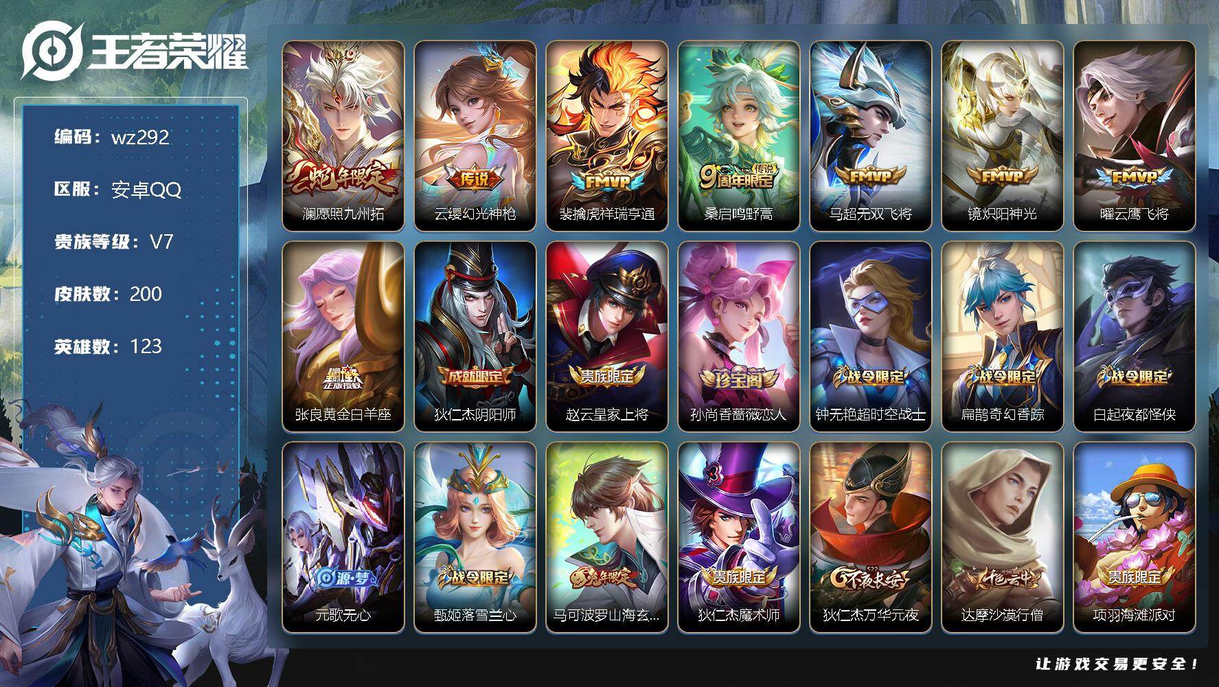 【账号佳】 【可二次实名】【wz292】【商品标题】:安卓Q-V7-最强王者段位-123英雄-200皮肤-0典藏-0珍品无双-0无双-0珍品传说-8传说-52史诗 【传说皮肤】:澜愿照九州拓,云缨幻光神枪,裴擒虎祥瑞亨通,桑启鸣野蒿,马超无双飞将,镜炽阳神光,曜云鹰飞将,张良黄金白羊座 【限定皮肤】:狄仁杰阴阳师,赵云皇家上将,孙尚香蔷薇恋人,钟无艳超时空战士,扁鹊奇幻香踪,白起夜都怪侠,元歌无心,甄姬落雪兰心,马可波罗山海玄木吟,狄仁杰魔术师,狄仁杰万华元夜,达摩沙漠行僧,项羽海滩派对,老夫子醍醐杖,程咬金演武夺筹,韩信飞衡,王昭君午后时光,兰陵王金庭之子,李元芳云中旅人,钟馗驱傩正仪,杨戬潮玩骑兵,鬼谷子五谷丰年,苏烈千军破阵,百里玄策原初追逐者,弈星混沌棋,梦奇顽趣,沈梦溪大漠名商,明世隐疑决卦,明世隐吟游魔法,裴擒虎擒涛扼浪,狂铁电玩高手,嫦娥暖冬兔眠,西施玲珑珍味,鲁班大师探海日志,桑启海盐诗旅,暃星界游侠,戈娅驭风魔法,阿古朵江河有灵,张良古海寻踪,蒙恬荣光圣徽,鬼谷子天穹祈灯,姬小满妄想食味,刘邦剑破天穹 【年限皮肤】:韩信飞衡,马超神威,马可波罗山海玄木吟 【赛季限定】:狄仁杰万华元夜,达摩沙漠行僧,老夫子醍醐杖,程咬金演武夺筹,兰陵王金庭之子,张良古海寻踪,李元芳云中旅人,钟馗驱傩正仪,苏烈千军破阵,百里玄策原初追逐者,弈星混沌棋,梦奇顽趣,沈梦溪大漠名商,明世隐疑决卦,裴擒虎擒涛扼浪,鲁班大师探海日志,桑启海盐诗旅,鬼谷子天穹祈灯,蒙恬荣光圣徽,刘邦剑破天穹 【战令限定】:钟无艳超时空战士,扁鹊奇幻香踪,白起夜都怪侠,甄姬落雪兰心,王昭君午后时光,杨戬潮玩骑兵,明世隐吟游魔法,狂铁电玩高手,嫦娥暖冬兔眠,西施玲珑珍味,暃星界游侠,戈娅驭风魔法 【史诗皮肤】:露娜紫霞仙子,赵云皇家上将,赵云未来纪元,甄姬冰雪圆舞曲,狄仁杰魔术师,廉颇地狱岩魂,宫本武藏鬼剑武藏,孙尚香蔷薇恋人,孙尚香水果甜心,嬴政摇滚巨星,妲己魅力维加斯,妲己女仆咖啡,墨子金属风暴,吕布圣诞狂欢,刘禅绅士熊喵,曹操幽灵船长,吕布末日机甲,花木兰水晶猎龙者,兰陵王暗隐猎兽者,诸葛亮黄金分割率,蔡文姬舞动绿茵,李元芳逐浪之夏,程咬金功夫厨神,大乔猫狗日记,狄仁杰鹰眼统帅,韩信飞衡,不知火舞魅语,橘右京修罗,马超神威,孙尚香时之恋人,百里玄策原初追逐者,杨戬天秀启明,澜赏金猎手,明世隐吟游魔法,狂铁电玩高手,钟无艳超时空战士,鬼谷子五谷丰年,元歌无心,梦奇顽趣,暃星界游侠,马可波罗山海玄木吟,扁鹊奇幻香踪,刘禅电玩爆裂旋风,戈娅驭风魔法,阿古朵江河有灵,蒙恬荣光圣徽,姬小满妄想食味,艾琳陌上桑,孙膑茶境仙,赵怀真器灵浮梦炉,狂铁龙之律动,黄忠百相守梦 【其他皮肤】:项羽海滩派对,韩信教廷特使,韩信街头霸王,达摩大发明家,芈月红桃皇后,程咬金爱与正义,白起白色死神,扁鹊化身博士,妲己少女阿狸,典韦黄金武士,亚瑟死亡骑士,花木兰兔女郎,张飞五福同心,宫本武藏万象初新,狄仁杰阴阳师,刘备汉昭烈帝,关羽龙腾万里,钟无艳海滩丽影,王昭君幻想奇妙夜,狂铁命运角斗场,老夫子功夫老勺,李白敏锐之力,鬼谷子幻乐之宴,大乔守护之力,小乔丁香结,吕布野性能量,孙膑归虚梦演,沈梦溪鲨炮海盗猫,姜子牙炽热元素使,弈星混沌棋,哪吒次元突破,明世隐疑决卦,老夫子醍醐杖,狂铁特工战影,狄仁杰万华元夜,程咬金演武夺筹,张良缤纷绘卷,钟馗驱傩正仪,鲁班大师乓乓大师,苏烈千军破阵,达摩沙漠行僧,白起夜都怪侠,兰陵王金庭之子,刘禅唤灵魔甲,米莱狄契约魔法,王昭君午后时光,沈梦溪大漠名商,蒙犽胡桃狂想曲,蒙恬蔚蓝守将,甄姬落雪兰心,李元芳云中旅人,戈娅危途狂花,刘备潮玩造梦师,桑启海盐诗旅,嫦娥暖冬兔眠,海月幻泉雾影,猪八戒潮玩探月行,牛魔牛运亨通,白起乐园追猎者,裴擒虎擒涛扼浪,杨戬潮玩骑兵,太乙真人劲辣红锅,莱西奥西部游侠,鲁班大师探海日志,西施玲珑珍味,李元芳妄想特派,哪吒热血海滩,张良古海寻踪,亚连破局者,后羿完美运算,鬼谷子天穹祈灯,刘邦剑破天穹,东皇太一噬灭天穹,亚瑟动物派对,苍苍林狼骑,太乙真人谧流熔炉,典韦铁骨偃魂,马超访茗客,影魅影绮裳,西施雪境奇遇,姜子牙星梦巡礼,钟馗虚灵犬护,苏烈春野闲踪,露娜命运加冕,白起死霸装,甄姬逆浪荇歌,庄周锦麟游梦,莱西奥踏浪烽翎,鬼谷子克喵,高渐离金属狂潮,项羽帝国元帅,露娜绯红之刃,貂蝉异域舞娘,花木兰剑舞者,老夫子潮流仙人,王昭君精灵公主,曹操超能战警,小乔万圣前夜,孙悟空西部大镖客,周瑜海军大将,后羿精灵王,刘禅英喵野望,刘邦圣殿之光,虞姬加勒比小姐,雅典娜战争女神,马可波罗激情绿茵,杨戬埃及法老,太乙真人圆桌骑士,黄忠芝加哥教父,东皇太一东海龙王,干将莫邪第七人偶,铠龙域领主,百里守约绝影神枪,梦奇美梦成真,明世隐占星师,公孙离花间舞,杨玉环霓裳曲,裴