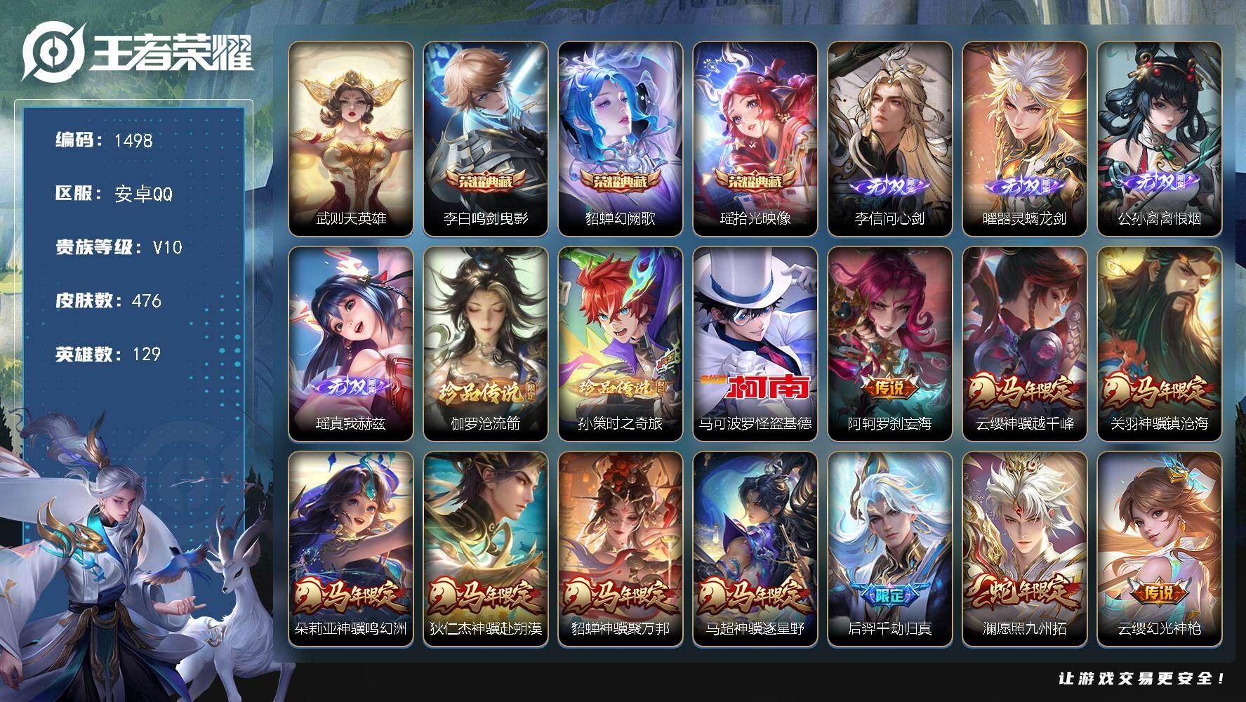 【账号佳】 【可二次实名】可二次 安卓Q-V10-最强王者段位-129英雄-593皮肤-7典藏皮肤-1典藏英雄-2珍品传说-86传说-200史诗【英雄全皮】:嬴政全皮,刘禅全皮,扁鹊全皮,元歌全皮,项羽全皮,司马懿全皮,刘邦全皮,孙权全皮,娜可露露全皮,橘右京全皮,牛魔全皮,刘备全皮,虞姬全皮,女娲全皮,哪吒全皮,干将莫邪全皮,雅典娜全皮,东皇太一全皮,鬼谷子全皮,黄忠全皮,苏烈全皮,狂铁全皮,米莱狄全皮,盾山全皮,猪八戒全皮,大司命全皮,敖隐全皮,鲁班大师全皮,澜全皮,阿古朵全皮,夏洛特全皮,司空震全皮,金蝉全皮,戈娅全皮,空空儿全皮,影全皮,海诺全皮,姬小满全皮,少司缘全皮【荣耀典藏】:武则天英雄,武则天倪克斯神谕,夏侯惇无限飓风号,鲁班七号星空梦想,花木兰九霄神辉,关羽赤影疾锋,铠银白咏叹调,虞姬神鉴启示录【珍品传说】:鲁班七号江户川柯南,马可波罗怪盗基德【传说皮肤】:后羿神树通天,干将莫邪千山共赴,元歌诡秘之主,大司命死亡执政官,司马懿九山相柳,公孙离云诺千山,司空震愿照山河定,女娲愿照千秋盛,妲己愿照众生和,澜愿照九州拓,蔡文姬愿照福禄聚,虞姬愿照岁时盈,云缨幻光神枪,嬴政玄雷天君,桑启鸣野蒿,铠冥王哈迪斯,朵莉亚心动手记,墨子黄金天蝎座,亚连落雪白狼,澜逐花归海,艾琳觅芳踪,兰陵王影龙天霄,吕布遇见神鼓,云缨鹤归松栖,上官婉儿妄想奇谈,马可波罗妄想实况,东皇太一灼幽烈阳,诸葛亮鹤羽星尊,澜电玩雷克斯,亚瑟追逃游戏,安琪拉追逃游戏,张飞百相守梦,夏洛特浮生妄,干将莫邪画中仙,虞姬无限倾心,项羽无限倾心,伽罗炽翼辉光,曜山海苍雷引,李信山海炽霜斩,吕布怒海麟威,狄仁杰神器狴犴令,不知火舞绯月行,王昭君星穹之声,橘右京枫霜尽,娜可露露前尘镜,马可波罗深海之息,后羿无尽星芒,马超无双飞将,大乔挚爱花嫁,孙策挚爱之约,露娜启示之音,女娲补天,瑶时之祈愿,裴擒虎寅虎赤拳,鲁班七号寅虎瑞焰,孙尚香异界灵契,貂蝉遇见胡旋,赵云淬星耀世,西施游龙清影,曜李逍遥 ,周瑜音你心动,公孙离祈雪灵祝,铠绛天战甲,镜炽阳神光,虞姬启明星使,孙悟空零号赤焰,关羽武圣,曜云鹰飞将,李信一念神魔,刘备时之恋人,伽罗太华,貂蝉猫影幻舞,张良黄金白羊座,干将莫邪久胜战神,虞姬云霓雀翎,达摩黄金狮子座,梦奇胖达荣荣,后羿黄金射手座,诸葛亮武陵仙君,貂蝉仲夏夜之梦,李白凤求凰,孙尚香末日机甲,宫本武藏地狱之眼,孙悟空地狱火,吕布天魔缭乱,武则天海洋之心【限定皮肤】:白起狰,铠冥王哈迪斯,暃埋骨钱,蔡文姬夏日便利店,大乔绒语心约,虞姬夏日便利店,姜子牙天穹之誓,杨戬破阵退雄兵,狄仁杰阴阳师,虞姬凯尔特女王,廉颇寅虎御盾,赵云皇家上将,赵云引擎之心,赵云龙胆,赵云百木心枪,墨子神迹守卫,妲己热情桑巴,妲己时之奇旅,嬴政优雅恋人,嬴政白昼王子,孙尚香异界灵契,鲁班七号乒乒小将,鲁班七号寅虎瑞焰,庄周高山流水,阿轲迷踪丽影,钟无艳超时空战士,孙膑妖精王,孙膑天狼运算者,孙膑寅虎展翼,扁鹊炼金王,扁鹊奇幻香踪,白起夜都怪侠,芈月重明,芈月白晶晶,芈月幻夜卜梦,吕布天魔缭乱,吕布猎兽之王,吕布御风骁将,吕布遇见神鼓,周瑜赤莲之焰,元歌云间偶戏,元歌无心,夏侯惇朔风刀,夏侯惇匿光决锋者,甄姬女儿国国王,甄姬游园惊梦,甄姬落雪兰心,曹操烛龙,曹操天狼征服者,典韦穷奇,典韦岱宗,马可波罗逐梦之星,马可波罗暗影游猎,马可波罗深海之息,马可波罗妄想实况,狄仁杰魔术师,狄仁杰万华元夜,狄仁杰神器狴犴令,达摩星际陆战队,达摩沙漠行僧,项羽海滩派对,项羽霸王别姬,项羽无限倾心,老夫子醍醐杖,老夫子航海奇遇记,关羽冰锋战神,关羽武圣,关羽百相守梦,貂蝉遇见胡旋,安琪拉追逃游戏,程咬金演武夺筹,露娜启示之音,刘邦夺宝奇兵,韩信逐梦之影,韩信飞衡,韩信傲雪梅枪,王昭君凤凰于飞,王昭君午后时光,王昭君星穹之声,兰陵王影龙天霄,兰陵王金庭之子,花木兰青春决赛季,不知火舞绯月行,娜可露露前尘镜,橘右京枫霜尽,亚瑟潮玩骑士王,亚瑟追逃游戏,孙悟空美猴王,孙悟空至尊宝,孙悟空大圣娶亲,孙悟空零号赤焰,孙悟空孙行者,牛魔御旌,牛魔奔雷神使,后羿如梦令,后羿圣弓游侠,后羿无尽星芒,刘备百相守梦,张飞虎魄,张飞百相守梦,李元芳银河之约,李元芳匿光侦查者,李元芳云中旅人,虞姬霸王别姬,虞姬启明星使,虞姬无限倾心,钟馗驱傩正仪,杨玉环遇见飞天,杨玉环寅虎心曲,杨戬潮玩骑兵,女娲朔望之晖,女娲补天,哪吒逐梦之翼,各种道具详情看截图、低价出售找回包 赔、截图展示段位不代 表实际段位,如赛季更新等不可抗拒因素发生变化、时限道具不保证所剩时间、标题未写送点劵默认不送【卖号买号首选亿梦】