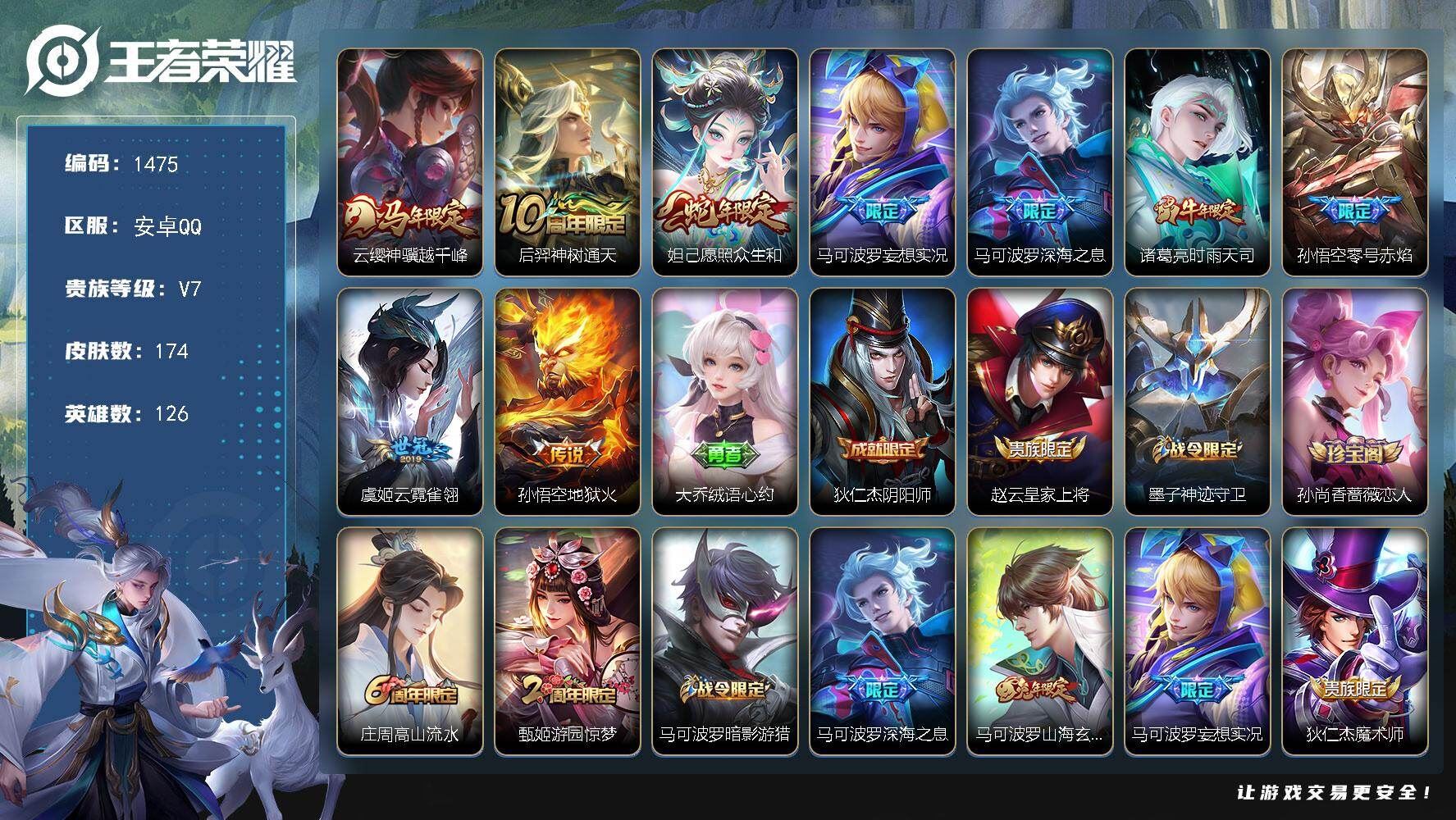 【账号佳】 【可二次实名】可二次 安卓Q-V7-最强王者段位-126英雄-174皮肤-9传说-55史诗【英雄全皮】:孙权全皮,猪八戒全皮【传说皮肤】:云缨神骥越千峰,后羿神树通天,妲己愿照众生和,马可波罗妄想实况,马可波罗深海之息,诸葛亮时雨天司,孙悟空零号赤焰,虞姬云霓雀翎,孙悟空地狱火【限定皮肤】:大乔绒语心约,狄仁杰阴阳师,赵云皇家上将,墨子神迹守卫,孙尚香蔷薇恋人,庄周高山流水,甄姬游园惊梦,马可波罗暗影游猎,马可波罗深海之息,马可波罗山海玄木吟,马可波罗妄想实况,狄仁杰魔术师,狄仁杰万华元夜,达摩星际陆战队,达摩沙漠行僧,项羽海滩派对,老夫子醍醐杖,老夫子航海奇遇记,程咬金演武夺筹,韩信逐梦之影,兰陵王金庭之子,孙悟空至尊宝,孙悟空零号赤焰,后羿圣弓游侠,李元芳云中旅人,钟馗驱傩正仪,干将莫邪冰霜恋舞曲,干将莫邪真爱魔法,雅典娜黎明之约,鬼谷子原初探秘者,鬼谷子五谷丰年,诸葛亮时雨天司,苏烈千军破阵,百里玄策原初追逐者,弈星混沌棋,梦奇顽趣,沈梦溪大漠名商,明世隐疑决卦,裴擒虎李小龙,裴擒虎擒涛扼浪,米莱狄胡桃异想国,猪八戒西部大镖客,猪八戒猪悟能,鲁班大师探海日志,桑启海盐诗旅,阿古朵江河有灵,张良古海寻踪,鬼谷子天穹祈灯,伽罗琥珀纪元,沈梦溪龙舞盛年【年限皮肤】:诸葛亮时雨天司,马可波罗山海玄木吟,妲己愿照众生和【赛季限定】:弈星混沌棋,明世隐疑决卦,老夫子醍醐杖,鬼谷子原初探秘者,狄仁杰万华元夜,程咬金演武夺筹,钟馗驱傩正仪,苏烈千军破阵,达摩沙漠行僧,兰陵王金庭之子,沈梦溪大漠名商,李元芳云中旅人,桑启海盐诗旅,裴擒虎擒涛扼浪,鲁班大师探海日志,张良古海寻踪,鬼谷子天穹祈灯,太乙真人谧流熔炉,钟馗虚灵犬护,甄姬逆浪荇歌,百里玄策原初追逐者,雅典娜黎明之约,梦奇顽趣,牛魔星界战将,项羽九幽镇关【战令限定】:马可波罗暗影游猎,猪八戒西部大镖客,米莱狄胡桃异想国,达摩星际陆战队,老夫子航海奇遇记,墨子神迹守卫,干将莫邪真爱魔法,后羿圣弓游侠,周瑜线条小狗【史诗皮肤】:周瑜线条小狗,项羽九幽镇关,女娲万灵启世,百里玄策罗小黑战记,黄忠百相守梦,阿轲化蝶舞,弈星万物之道,牛魔星界战将,马可波罗星界特工,伽罗琥珀纪元,阿古朵江河有灵,马可波罗山海玄木吟,梦奇顽趣,鬼谷子五谷丰年,雅典娜黎明之约,庄周高山流水,猪八戒猪悟能,干将莫邪真爱魔法,老夫子航海奇遇记,米莱狄胡桃异想国,裴擒虎李小龙,百里玄策原初追逐者,马可波罗暗影游猎,孙尚香时之恋人,娜可露露晚萤,狄仁杰鹰眼统帅,伽罗箭羽风息,干将莫邪冰霜恋舞曲,大乔猫狗日记,阿轲节奏热浪,白起星夜王子,程咬金功夫厨神,李元芳逐浪之夏,刘禅天才门将,百里守约特工魅影,亚瑟心灵战警,甄姬游园惊梦,兰陵王暗隐猎兽者,夏侯惇乘风破浪,韩信逐梦之影,孙悟空至尊宝,张飞乱世虎臣,曹操幽灵船长,刘禅绅士熊喵,吕布圣诞狂欢,墨子金属风暴,墨子龙骑士,孙尚香水果甜心,孙尚香蔷薇恋人,宫本武藏鬼剑武藏,狄仁杰魔术师,甄姬冰雪圆舞曲,赵云未来纪元,赵云皇家上将,阿轲暗夜猫娘,鲁班七号电玩小子,【营地ID】:2113277128。各种道具详情看截图、低价出售找回包 赔、截图展示段位不代 表实际段位,如赛季更新等不可抗拒因素发生变化、时限道具不保证所剩时间、标题未写送点劵默认不送【卖号买号首选亿梦】
