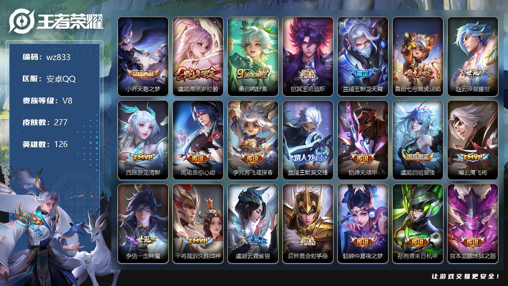 【账号佳】 【可二次实名】【wz833】【商品标题】:安卓Q-V8-最强王者段位-126英雄-277皮肤-1典藏-0珍品无双-0无双-0珍品传说-21传说-81史诗 【荣耀典藏】:小乔天鹅之梦 【传说皮肤】:虞姬愿照岁时盈,桑启鸣野蒿,铠冥王哈迪斯,兰陵王影龙天霄,鲁班七号寅虎瑞焰,赵云淬星耀世,西施游龙清影,周瑜音你心动,李元芳飞鸢探春,兰陵王默契交锋,铠绛天战甲,虞姬启明星使,曜云鹰飞将,李信一念神魔,干将莫邪久胜战神,虞姬云霓雀翎,后羿黄金射手座,貂蝉仲夏夜之梦,孙尚香末日机甲,宫本武藏地狱之眼,狄仁杰超时空战士 【限定皮肤】:铠冥王哈迪斯,蒙犽顽岩魄,蔡文姬夏日便利店,大乔绒语心约,虞姬夏日便利店,姜子牙天穹之誓,狄仁杰阴阳师,赵云皇家上将,赵云百木心枪,墨子神迹守卫,鲁班七号寅虎瑞焰,芈月幻夜卜梦,元歌云间偶戏,元歌无心,夏侯惇朔风刀,马可波罗暗影游猎,狄仁杰魔术师,狄仁杰万华元夜,达摩星际陆战队,达摩沙漠行僧,项羽海滩派对,老夫子醍醐杖,老夫子航海奇遇记,关羽冰锋战神,程咬金演武夺筹,韩信逐梦之影,王昭君午后时光,兰陵王默契交锋,兰陵王影龙天霄,兰陵王驯魔猎人,兰陵王金庭之子,亚瑟潮玩骑士王,李元芳云中旅人,虞姬启明星使,钟馗驱傩正仪,杨玉环遇见飞天,雅典娜单词大作战,雅典娜黎明之约,鬼谷子原初探秘者,鬼谷子五谷丰年,黄忠烈魂,黄忠火炮绅士,苏烈千军破阵,百里玄策原初追逐者,弈星混沌棋,梦奇顽趣,沈梦溪大漠名商,明世隐疑决卦,裴擒虎李小龙,裴擒虎擒涛扼浪,狂铁电玩高手,米莱狄御霄,米莱狄胡桃异想国,云中君纤云弄巧,伽罗天狼溯光者,猪八戒西部大镖客,嫦娥暖冬兔眠,鲁班大师探海日志,桑启海盐诗旅,暃星界游侠,艾琳女武神,艾琳流音漫舞,司空震地狱燃心,阿古朵江河有灵,张良古海寻踪,蒙恬荣光圣徽,高渐离燃音魔法,妲己灵卜魔法,鬼谷子天穹祈灯,伽罗琥珀纪元,姬小满妄想食味,鲁班七号蔬乡物语,李元芳蔬乡物语,刘邦剑破天穹,程咬金群星魔术团,周瑜熔金海岸 【年限皮肤】:鲁班七号寅虎瑞焰,马超神威,黄忠烈魂 【赛季限定】:夏侯惇朔风刀,狄仁杰万华元夜,达摩沙漠行僧,老夫子醍醐杖,程咬金演武夺筹,兰陵王金庭之子,张良古海寻踪,李元芳云中旅人,钟馗驱傩正仪,雅典娜黎明之约,鬼谷子原初探秘者,苏烈千军破阵,百里玄策原初追逐者,弈星混沌棋,梦奇顽趣,沈梦溪大漠名商,明世隐疑决卦,裴擒虎擒涛扼浪,米莱狄御霄,鲁班大师探海日志,桑启海盐诗旅,鬼谷子天穹祈灯,蒙恬荣光圣徽,刘邦剑破天穹,姜子牙天穹之誓 【战令限定】:墨子神迹守卫,蔡文姬夏日便利店,虞姬夏日便利店,芈月幻夜卜梦,元歌云间偶戏,马可波罗暗影游猎,达摩星际陆战队,老夫子航海奇遇记,王昭君午后时光,兰陵王驯魔猎人,艾琳流音漫舞,亚瑟潮玩骑士王,雅典娜单词大作战,黄忠火炮绅士,狂铁电玩高手,米莱狄胡桃异想国,猪八戒西部大镖客,嫦娥暖冬兔眠,司空震地狱燃心,暃星界游侠,高渐离燃音魔法,妲己灵卜魔法,鲁班七号蔬乡物语,李元芳蔬乡物语 【史诗皮肤】:鲁班七号电玩小子,项羽苍穹之光,露娜紫霞仙子,阿轲暗夜猫娘,赵云皇家上将,赵云未来纪元,貂蝉圣诞恋歌,甄姬冰雪圆舞曲,王昭君偶像歌手,狄仁杰魔术师,廉颇地狱岩魂,宫本武藏鬼剑武藏,孙尚香水果甜心,嬴政暗夜贵公子,嬴政摇滚巨星,妲己魅力维加斯,妲己女仆咖啡,墨子龙骑士,墨子金属风暴,吕布圣诞狂欢,刘禅绅士熊喵,曹操幽灵船长,李白千年之狐,关羽冰锋战神,花木兰水晶猎龙者,刘邦德古拉伯爵,韩信逐梦之影,夏侯惇乘风破浪,小乔缤纷独角兽,兰陵王暗隐猎兽者,诸葛亮黄金分割率,亚瑟心灵战警,雅典娜冰冠公主,安琪拉心灵骇客,百里守约特工魅影,铠曙光守护者,蔡文姬舞动绿茵,刘禅天才门将,李元芳逐浪之夏,程咬金功夫厨神,白起星夜王子,阿轲节奏热浪,杨玉环遇见飞天,孙策猫狗日记,伽罗箭羽风息,狄仁杰鹰眼统帅,兰陵王驯魔猎人,娜可露露晚萤,马超神威,黄忠烈魂,马可波罗暗影游猎,百里玄策原初追逐者,裴擒虎李小龙,云中君纤云弄巧,元歌云间偶戏,米莱狄胡桃异想国,老夫子航海奇遇记,伽罗天狼溯光者,黄忠火炮绅士,雅典娜黎明之约,赵云百木心枪,狂铁电玩高手,鬼谷子五谷丰年,元歌无心,梦奇顽趣,暃星界游侠,刘禅电玩爆裂旋风,司空震地狱燃心,阿古朵江河有灵,妲己灵卜魔法,高渐离燃音魔法,蒙恬荣光圣徽,伽罗琥珀纪元,姬小满妄想食味,鲁班七号蔬乡物语,黄忠怒海争锋,蔡文姬夏日便利店,蒙犽顽岩魄,牛魔星界战将,赵怀真器灵浮梦炉,周瑜百相守梦,公孙离涂山容容 【其他皮肤】:项羽海滩派对,韩信教廷特使,韩信街头霸王,露娜哥特玫瑰,阿轲爱心护理,达摩大发明家,赵云白执事,赵云忍炎影,芈月红桃皇后,艾琳女武神,白起白色死神,牛魔西部大镖客,武则天东方不败,扁鹊化身博士,宫本武藏未来纪元,安琪拉玩偶对对碰,孙膑天使之翼,典
