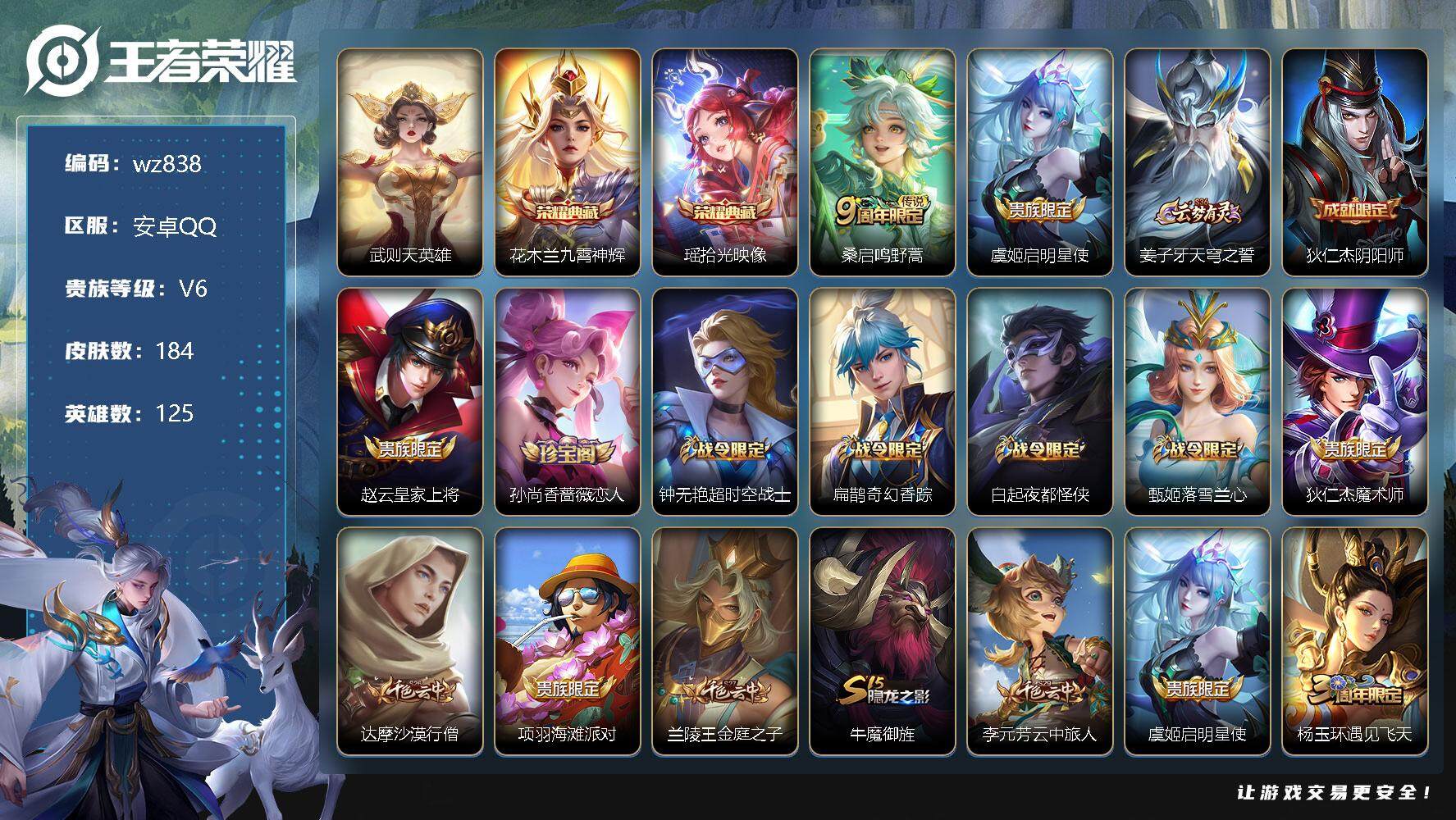 【账号佳】 【可二次实名】【wz838】【商品标题】:安卓Q-V6-最强王者段位-125英雄-184皮肤-2典藏-0珍品无双-0无双-0珍品传说-2传说-39史诗 【荣耀典藏】:武则天英雄,花木兰九霄神辉,瑶拾光映像 【传说皮肤】:桑启鸣野蒿,虞姬启明星使 【限定皮肤】:姜子牙天穹之誓,狄仁杰阴阳师,赵云皇家上将,孙尚香蔷薇恋人,钟无艳超时空战士,扁鹊奇幻香踪,白起夜都怪侠,甄姬落雪兰心,狄仁杰魔术师,达摩沙漠行僧,项羽海滩派对,兰陵王金庭之子,牛魔御旌,李元芳云中旅人,虞姬启明星使,杨玉环遇见飞天,杨戬潮玩骑兵,女娲朔望之晖,鬼谷子五谷丰年,苏烈千军破阵,沈梦溪大漠名商,明世隐吟游魔法,裴擒虎擒涛扼浪,盾山御銮,上官婉儿梁祝,嫦娥暖冬兔眠,鲁班大师探海日志,桑启海盐诗旅,暃星界游侠,艾琳女武神,艾琳流音漫舞,司空震地狱燃心,阿古朵江河有灵,张良古海寻踪,高渐离燃音魔法,妲己灵卜魔法,鬼谷子天穹祈灯,沈梦溪龙舞盛年,李元芳蔬乡物语,周瑜熔金海岸 【赛季限定】:达摩沙漠行僧,兰陵王金庭之子,张良古海寻踪,牛魔御旌,李元芳云中旅人,苏烈千军破阵,沈梦溪大漠名商,裴擒虎擒涛扼浪,盾山御銮,鲁班大师探海日志,桑启海盐诗旅,鬼谷子天穹祈灯,姜子牙天穹之誓 【战令限定】:钟无艳超时空战士,扁鹊奇幻香踪,白起夜都怪侠,甄姬落雪兰心,艾琳流音漫舞,杨戬潮玩骑兵,女娲朔望之晖,明世隐吟游魔法,嫦娥暖冬兔眠,司空震地狱燃心,暃星界游侠,高渐离燃音魔法,妲己灵卜魔法,李元芳蔬乡物语 【史诗皮肤】:露娜紫霞仙子,阿轲暗夜猫娘,赵云皇家上将,赵云未来纪元,貂蝉圣诞恋歌,甄姬冰雪圆舞曲,王昭君偶像歌手,狄仁杰魔术师,宫本武藏鬼剑武藏,孙尚香蔷薇恋人,孙尚香水果甜心,妲己魅力维加斯,墨子金属风暴,刘禅绅士熊喵,吕布末日机甲,夏侯惇乘风破浪,小乔缤纷独角兽,诸葛亮黄金分割率,亚瑟心灵战警,安琪拉心灵骇客,蔡文姬舞动绿茵,李元芳逐浪之夏,白起星夜王子,杨玉环遇见飞天,孙策猫狗日记,伽罗箭羽风息,狄仁杰鹰眼统帅,上官婉儿梁祝,不知火舞魅语,明世隐吟游魔法,钟无艳超时空战士,鬼谷子五谷丰年,暃星界游侠,扁鹊奇幻香踪,刘禅电玩爆裂旋风,司空震地狱燃心,阿古朵江河有灵,妲己灵卜魔法,高渐离燃音魔法,黄忠百相守梦 【其他皮肤】:项羽海滩派对,韩信教廷特使,露娜哥特玫瑰,芈月红桃皇后,艾琳女武神,程咬金星际陆战队,牛魔西部大镖客,扁鹊化身博士,扁鹊救世之瞳,宫本武藏未来纪元,安琪拉玩偶对对碰,孙膑天使之翼,姜子牙时尚教父,妲己少女阿狸,典韦黄金武士,亚瑟死亡骑士,达摩拳王,花木兰兔女郎,张飞五福同心,甄姬花好人间,刘备万事如意,宫本武藏万象初新,后羿阿尔法小队,狄仁杰阴阳师,关羽龙腾万里,王昭君幻想奇妙夜,狂铁命运角斗场,老夫子功夫老勺,孙尚香沉稳之力,李白敏锐之力,鬼谷子幻乐之宴,苏烈坚韧之力,大乔守护之力,明世隐虹云星官,牛魔御旌,女娲朔望之晖,小乔丁香结,盾山御銮,沈梦溪鲨炮海盗猫,哪吒次元突破,狂铁特工战影,张良缤纷绘卷,鲁班大师乓乓大师,苏烈千军破阵,达摩沙漠行僧,程咬金无双福将,白起夜都怪侠,兰陵王金庭之子,刘禅唤灵魔甲,米莱狄契约魔法,沈梦溪大漠名商,蒙恬蔚蓝守将,甄姬落雪兰心,李元芳云中旅人,桑启海盐诗旅,嫦娥暖冬兔眠,猪八戒潮玩探月行,赵怀真太极少年,裴擒虎擒涛扼浪,杨戬潮玩骑兵,太乙真人劲辣红锅,鲁班大师探海日志,李元芳妄想特派,艾琳流音漫舞,张良古海寻踪,钟无艳聚星闪耀,鬼谷子天穹祈灯,妲己灵卜魔法,廉颇功夫炙烤,沈梦溪龙舞盛年,钟无艳春野之旅,李元芳蔬乡物语,姜子牙天穹之誓,周瑜熔金海岸,盘古敬我三分,东皇太一噬灭天穹,干将莫邪雾都夜雨,太乙真人谧流熔炉,典韦铁骨偃魂,影魅影绮裳,西施雪境奇遇,姜子牙星梦巡礼,阿古朵布丁狗之约,露娜命运加冕,姬小满小满鸭,甄姬逆浪荇歌,莱西奥踏浪烽翎,鬼谷子克喵,鲁班七号福禄兄弟,鲁班七号木偶奇遇记,高渐离金属狂潮,项羽帝国元帅,貂蝉异域舞娘,花木兰剑舞者,老夫子潮流仙人,王昭君精灵公主,狄仁杰锦衣卫,曹操超能战警,孙膑未来旅行,孙悟空西部大镖客,周瑜海军大将,后羿精灵王,兰陵王隐刃,李白范海辛,虞姬加勒比小姐,关羽天启骑士,夏侯惇战争骑士,雅典娜战争女神,杨戬埃及法老,诸葛亮星航指挥官,黄忠芝加哥教父,大乔伊势巫女,东皇太一东海龙王,铠龙域领主,百里守约绝影神枪,百里玄策威尼斯狂欢,苏烈爱与和平,杨玉环霓裳曲,裴擒虎街头旋风,弈星踏雪寻梅,米莱狄精准探案法,元歌午夜歌剧院,孙策海之征途,司马懿魇语军师,盾山极冰防御线,伽罗花见巫女,李信灼热之刃,上官婉儿修竹墨客,盘古创世神祝,瑶森,云中君荷鲁斯之眼,曜归虚梦演,马超幸存者,西施归虚梦演,蒙犽归虚梦演,镜冰刃幻境,阿古朵熊喵少女,司空震启蛰,云缨赤焰之缨,金蝉前尘,桑启画中游 【内测皮