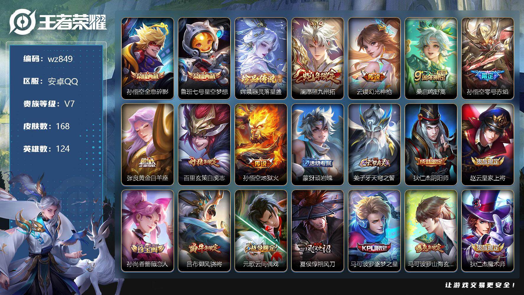 【账号佳】 【可二次实名】【wz849】【商品标题】:安卓Q-V7-最强王者段位-124英雄-168皮肤-2典藏-0珍品无双-0无双-1珍品传说-7传说-45史诗 【荣耀典藏】:孙悟空全息碎影,鲁班七号星空梦想 【珍品传说】:嫦娥器灵落星盏 【传说皮肤】:澜愿照九州拓,云缨幻光神枪,桑启鸣野蒿,孙悟空零号赤焰,张良黄金白羊座,百里玄策白虎志,孙悟空地狱火 【限定皮肤】:蒙犽顽岩魄,姜子牙天穹之誓,狄仁杰阴阳师,赵云皇家上将,孙尚香蔷薇恋人,吕布御风骁将,元歌云间偶戏,夏侯惇朔风刀,马可波罗逐梦之星,马可波罗山海玄木吟,狄仁杰魔术师,狄仁杰万华元夜,达摩沙漠行僧,项羽海滩派对,老夫子醍醐杖,关羽冰锋战神,程咬金演武夺筹,兰陵王金庭之子,亚瑟潮玩骑士王,孙悟空大圣娶亲,孙悟空零号赤焰,孙悟空孙行者,后羿圣弓游侠,干将莫邪真爱魔法,雅典娜单词大作战,蔡文姬繁星吟游,鬼谷子原初探秘者,鬼谷子五谷丰年,苏烈千军破阵,百里玄策白虎志,百里玄策原初追逐者,弈星混沌棋,明世隐疑决卦,裴擒虎李小龙,云中君纤云弄巧,蒙犽狂想玩偶喵,鲁班大师探海日志,阿古朵江河有灵,张良古海寻踪,鬼谷子天穹祈灯,姬小满妄想食味,沈梦溪龙舞盛年,刘邦剑破天穹,程咬金群星魔术团,周瑜熔金海岸 【年限皮肤】:百里玄策白虎志,吕布御风骁将,马可波罗山海玄木吟 【赛季限定】:夏侯惇朔风刀,狄仁杰万华元夜,达摩沙漠行僧,老夫子醍醐杖,程咬金演武夺筹,兰陵王金庭之子,张良古海寻踪,鬼谷子原初探秘者,苏烈千军破阵,百里玄策原初追逐者,弈星混沌棋,明世隐疑决卦,鲁班大师探海日志,鬼谷子天穹祈灯,刘邦剑破天穹,姜子牙天穹之誓 【战令限定】:元歌云间偶戏,亚瑟潮玩骑士王,后羿圣弓游侠,干将莫邪真爱魔法,雅典娜单词大作战,蒙犽狂想玩偶喵 【史诗皮肤】:赵云皇家上将,赵云未来纪元,貂蝉圣诞恋歌,甄姬冰雪圆舞曲,狄仁杰魔术师,宫本武藏鬼剑武藏,孙尚香蔷薇恋人,孙尚香水果甜心,妲己魅力维加斯,妲己女仆咖啡,墨子龙骑士,吕布圣诞狂欢,刘禅绅士熊喵,曹操幽灵船长,张飞乱世虎臣,关羽冰锋战神,花木兰水晶猎龙者,兰陵王暗隐猎兽者,马可波罗逐梦之星,亚瑟心灵战警,雅典娜冰冠公主,刘禅天才门将,白起星夜王子,孙悟空大圣娶亲,伽罗箭羽风息,狄仁杰鹰眼统帅,蔡文姬繁星吟游,橘右京修罗,蒙犽狂想玩偶喵,百里玄策原初追逐者,裴擒虎李小龙,云中君纤云弄巧,元歌云间偶戏,吕布御风骁将,干将莫邪真爱魔法,安琪拉时之奇旅,孙悟空孙行者,鬼谷子五谷丰年,马可波罗山海玄木吟,阿古朵江河有灵,姬小满妄想食味,蒙犽顽岩魄,后羿石田雨龙,黄忠百相守梦,西施织梦人 【其他皮肤】:项羽海滩派对,韩信街头霸王,露娜哥特玫瑰,赵云白执事,赵云忍炎影,程咬金星际陆战队,白起白色死神,武则天东方不败,宫本武藏未来纪元,孙膑天使之翼,典韦黄金武士,亚瑟死亡骑士,达摩拳王,花木兰兔女郎,张飞五福同心,甄姬花好人间,宫本武藏万象初新,狄仁杰阴阳师,刘备汉昭烈帝,关羽龙腾万里,孙尚香沉稳之力,李白敏锐之力,项羽科学大爆炸,明世隐虹云星官,吕布野性能量,沈梦溪鲨炮海盗猫,夏侯惇朔风刀,弈星混沌棋,哪吒次元突破,明世隐疑决卦,老夫子醍醐杖,鬼谷子原初探秘者,雅典娜单词大作战,狄仁杰万华元夜,亚瑟潮玩骑士王,杨戬次元傲视,程咬金演武夺筹,张良缤纷绘卷,鲁班大师乓乓大师,苏烈千军破阵,后羿圣弓游侠,妲己紫罗兰之誓,达摩沙漠行僧,程咬金无双福将,兰陵王金庭之子,蒙恬蔚蓝守将,猪八戒潮玩探月行,鲁班大师探海日志,李元芳妄想特派,哪吒热血海滩,张良古海寻踪,钟无艳聚星闪耀,后羿完美运算,鬼谷子天穹祈灯,嫦娥漠中幻影,廉颇功夫炙烤,沈梦溪龙舞盛年,刘邦剑破天穹,程咬金群星魔术团,姜子牙天穹之誓,周瑜熔金海岸,盘古敬我三分,东皇太一噬灭天穹,干将莫邪雾都夜雨,苍苍林狼骑,太乙真人谧流熔炉,典韦铁骨偃魂,西施雪境奇遇,姜子牙星梦巡礼,戈娅玫蓝誓约,钟馗虚灵犬护,苏烈春野闲踪,张良灵野札记,阿古朵布丁狗之约,姬小满小满鸭,白起死霸装,甄姬逆浪荇歌,云中君云械蓝图,庄周锦麟游梦,莱西奥踏浪烽翎,鬼谷子克喵,貂蝉异域舞娘,曹操死神来了,曹操超能战警,孙悟空西部大镖客,周瑜海军大将,兰陵王隐刃,虞姬加勒比小姐,夏侯惇战争骑士,雅典娜战争女神,马可波罗激情绿茵,干将莫邪第七人偶,百里守约绝影神枪,百里玄策威尼斯狂欢,女娲尼罗河女神,公孙离花间舞,弈星踏雪寻梅,元歌午夜歌剧院,孙策海之征途,上官婉儿修竹墨客,嫦娥露花倒影,猪八戒年年有余,盘古创世神祝,曜归虚梦演,马超幸存者,西施归虚梦演,鲁班大师归虚梦演,镜冰刃幻境,澜孤猎,司空震启蛰,云缨赤焰之缨,金蝉前尘,暃碧珀绯影 【内测皮肤】:孙尚香蔷薇恋人 【营地ID】:98038364