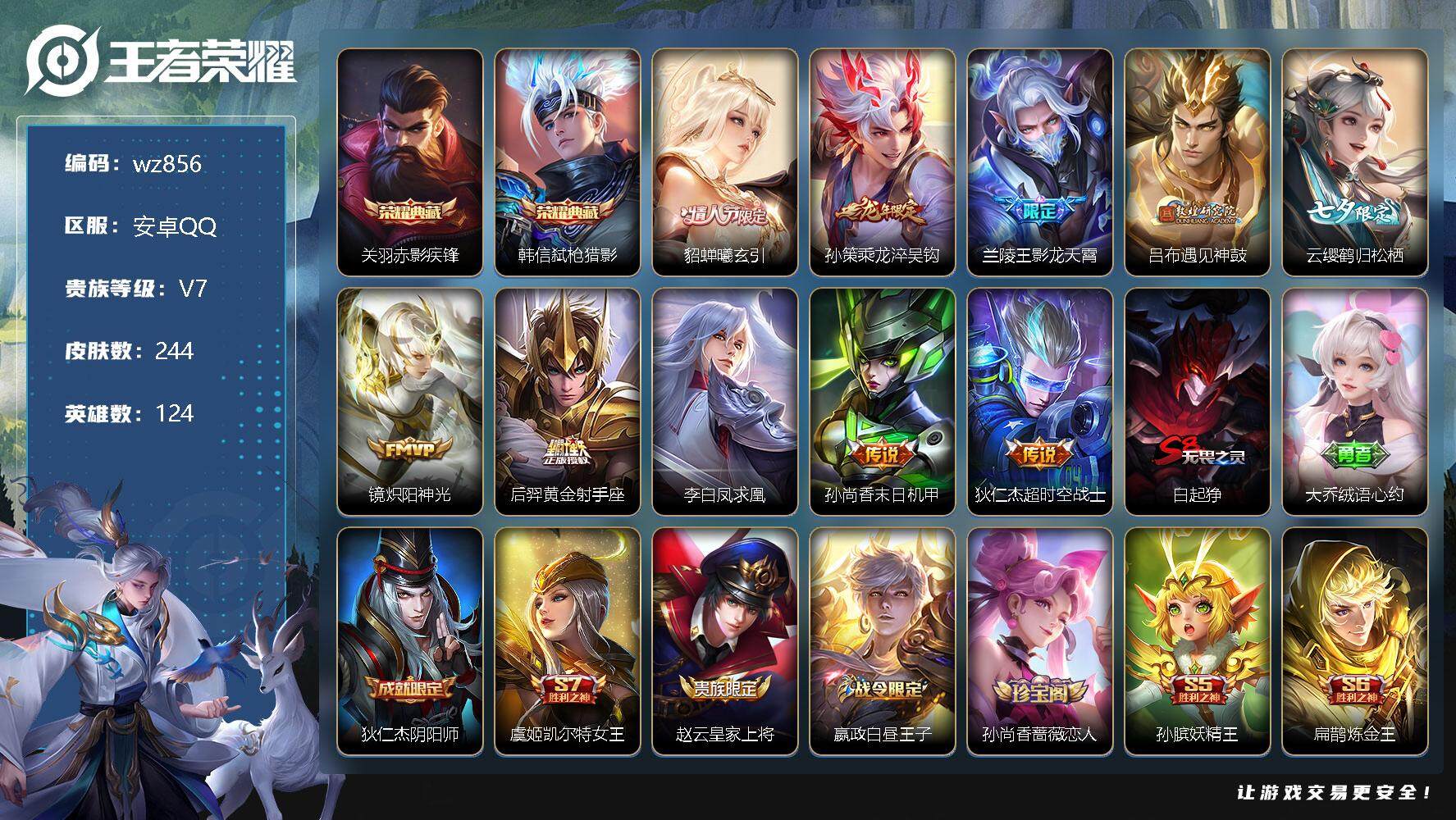 【账号佳】 【可二次实名】【wz856】【商品标题】:安卓Q-V7-最强王者段位-124英雄-244皮肤-2典藏-0珍品无双-0无双-0珍品传说-10传说-56史诗 【荣耀典藏】:关羽赤影疾锋,韩信弑枪猎影 【传说皮肤】:貂蝉曦玄引,孙策乘龙淬吴钩,兰陵王影龙天霄,吕布遇见神鼓,云缨鹤归松栖,镜炽阳神光,后羿黄金射手座,李白凤求凰,孙尚香末日机甲,狄仁杰超时空战士 【限定皮肤】:白起狰,大乔绒语心约,狄仁杰阴阳师,虞姬凯尔特女王,赵云皇家上将,嬴政白昼王子,孙尚香蔷薇恋人,孙膑妖精王,扁鹊炼金王,芈月重明,吕布猎兽之王,吕布遇见神鼓,元歌云间偶戏,夏侯惇朔风刀,甄姬游园惊梦,曹操烛龙,典韦穷奇,典韦蓝屏警告,狄仁杰魔术师,狄仁杰万华元夜,项羽海滩派对,老夫子醍醐杖,程咬金演武夺筹,兰陵王影龙天霄,兰陵王金庭之子,孙悟空至尊宝,牛魔御旌,李元芳银河之约,李元芳云中旅人,钟馗驱傩正仪,杨玉环遇见飞天,女娲朔望之晖,太乙真人饕餮,鬼谷子原初探秘者,鬼谷子五谷丰年,苏烈千军破阵,百里玄策原初追逐者,弈星混沌棋,沈梦溪星空之诺,明世隐疑决卦,裴擒虎李小龙,狂铁御狮,米莱狄御霄,云中君纤云弄巧,盾山御銮,上官婉儿梁祝,嫦娥拒霜思,西施玲珑珍味,鲁班大师探海日志,桑启海盐诗旅,戈娅驭风魔法,艾琳流音漫舞,赵怀真鹤归松栖,云缨鹤归松栖,司空震地狱燃心,阿古朵江河有灵,张良古海寻踪,蒙犽百解令,高渐离燃音魔法,妲己灵卜魔法,鬼谷子天穹祈灯,孙策乘龙淬吴钩,貂蝉曦玄引,沈梦溪龙舞盛年,刘邦剑破天穹 【年限皮肤】:李白凤求凰,孙策乘龙淬吴钩 【赛季限定】:孙膑妖精王,扁鹊炼金王,白起狰,芈月重明,夏侯惇朔风刀,曹操烛龙,典韦穷奇,狄仁杰万华元夜,老夫子醍醐杖,程咬金演武夺筹,兰陵王金庭之子,张良古海寻踪,牛魔御旌,李元芳云中旅人,虞姬凯尔特女王,钟馗驱傩正仪,太乙真人饕餮,鬼谷子原初探秘者,苏烈千军破阵,百里玄策原初追逐者,弈星混沌棋,明世隐疑决卦,狂铁御狮,米莱狄御霄,盾山御銮,鲁班大师探海日志,桑启海盐诗旅,鬼谷子天穹祈灯,刘邦剑破天穹 【战令限定】:嬴政白昼王子,吕布猎兽之王,元歌云间偶戏,典韦蓝屏警告,艾琳流音漫舞,李元芳银河之约,女娲朔望之晖,沈梦溪星空之诺,西施玲珑珍味,司空震地狱燃心,戈娅驭风魔法,高渐离燃音魔法,妲己灵卜魔法 【史诗皮肤】:鲁班七号电玩小子,赵云皇家上将,赵云未来纪元,貂蝉圣诞恋歌,甄姬冰雪圆舞曲,狄仁杰魔术师,廉颇地狱岩魂,宫本武藏鬼剑武藏,孙尚香蔷薇恋人,孙尚香水果甜心,嬴政暗夜贵公子,妲己魅力维加斯,妲己女仆咖啡,墨子金属风暴,吕布圣诞狂欢,曹操幽灵船长,李白千年之狐,韩信白龙吟,孙悟空至尊宝,花木兰水晶猎龙者,刘邦德古拉伯爵,夏侯惇乘风破浪,小乔缤纷独角兽,兰陵王暗隐猎兽者,诸葛亮黄金分割率,甄姬游园惊梦,亚瑟心灵战警,雅典娜冰冠公主,安琪拉心灵骇客,百里守约特工魅影,铠曙光守护者,刘禅天才门将,白起星夜王子,杨玉环遇见飞天,嬴政白昼王子,孙策猫狗日记,典韦蓝屏警告,狄仁杰鹰眼统帅,上官婉儿梁祝,李元芳银河之约,小乔青蛇,百里玄策原初追逐者,裴擒虎李小龙,云中君纤云弄巧,元歌云间偶戏,杨戬天秀启明,嫦娥拒霜思,鬼谷子五谷丰年,戈娅驭风魔法,赵怀真鹤归松栖,司空震地狱燃心,阿古朵江河有灵,蒙犽百解令,妲己灵卜魔法,高渐离燃音魔法,弈星万物之道,刘禅鸭鸭历险记 【其他皮肤】:项羽海滩派对,韩信教廷特使,韩信街头霸王,露娜哥特玫瑰,阿轲致命风华,阿轲爱心护理,达摩大发明家,赵云忍炎影,芈月红桃皇后,程咬金星际陆战队,白起白色死神,扁鹊化身博士,扁鹊救世之瞳,宫本武藏未来纪元,安琪拉玩偶对对碰,孙膑天使之翼,姜子牙时尚教父,妲己少女阿狸,典韦黄金武士,亚瑟死亡骑士,达摩拳王,花木兰兔女郎,张飞五福同心,甄姬花好人间,刘备万事如意,宫本武藏万象初新,后羿阿尔法小队,狄仁杰阴阳师,刘备纽约教父,孙膑妖精王,刘备汉昭烈帝,扁鹊炼金王,关羽龙腾万里,虞姬凯尔特女王,白起狰,钟无艳海滩丽影,太乙真人饕餮,宫本武藏霸王丸,曹操烛龙,王昭君幻想奇妙夜,芈月重明,狂铁命运角斗场,老夫子功夫老勺,牛魔制霸全明星,典韦穷奇,鬼谷子幻乐之宴,狂铁御狮,苏烈坚韧之力,大乔守护之力,项羽科学大爆炸,米莱狄御霄,吕布猎兽之王,明世隐虹云星官,牛魔御旌,女娲朔望之晖,盾山御銮,孙膑归虚梦演,沈梦溪鲨炮海盗猫,姜子牙炽热元素使,夏侯惇朔风刀,沈梦溪星空之诺,弈星混沌棋,哪吒次元突破,明世隐疑决卦,盾山圆桌骑士,老夫子醍醐杖,狂铁特工战影,鬼谷子原初探秘者,狄仁杰万华元夜,刘禅秘密基地,露娜瓷语鉴心,程咬金演武夺筹,张良缤纷绘卷,钟馗驱傩正仪,鲁班大师乓乓大师,苏烈千军破阵,程咬金无双福将,兰陵王金庭之子,李元芳云中旅人,刘备潮玩造梦师,桑启海盐诗旅,猪八戒潮玩探月行,鲁