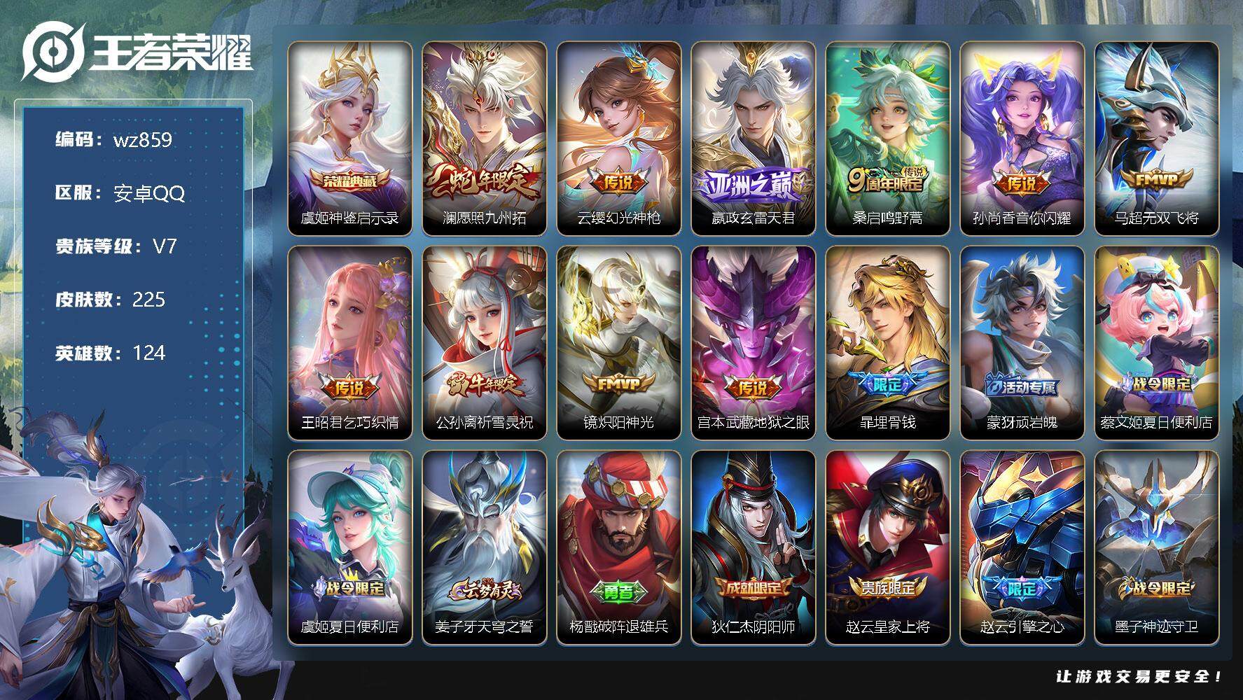 【账号佳】 【可二次实名】【wz859】【商品标题】:安卓Q-V7-永恒钻石III段位-124英雄-225皮肤-1典藏-0珍品无双-0无双-0珍品传说-10传说-64史诗 【荣耀典藏】:虞姬神鉴启示录 【传说皮肤】:澜愿照九州拓,云缨幻光神枪,嬴政玄雷天君,桑启鸣野蒿,孙尚香音你闪耀,马超无双飞将,王昭君乞巧织情,公孙离祈雪灵祝,镜炽阳神光,宫本武藏地狱之眼 【限定皮肤】:暃埋骨钱,蒙犽顽岩魄,蔡文姬夏日便利店,虞姬夏日便利店,姜子牙天穹之誓,杨戬破阵退雄兵,狄仁杰阴阳师,赵云皇家上将,赵云引擎之心,墨子神迹守卫,孙尚香蔷薇恋人,吕布御风骁将,周瑜赤莲之焰,元歌无心,狄仁杰魔术师,达摩沙漠行僧,项羽海滩派对,韩信飞衡,韩信傲雪梅枪,兰陵王金庭之子,花木兰默契交锋,李元芳云中旅人,鬼谷子五谷丰年,百里玄策原初追逐者,公孙离祈雪灵祝,沈梦溪大漠名商,裴擒虎擒涛扼浪,狂铁电玩高手,蒙犽狂想玩偶喵,鲁班大师探海日志,桑启海盐诗旅,阿古朵江河有灵,张良古海寻踪,鬼谷子天穹祈灯,姬小满妄想食味,沈梦溪龙舞盛年,刘邦剑破天穹,程咬金群星魔术团,关羽决胜骁骑,镜青焰无极,项羽苍威无极,周瑜熔金海岸 【年限皮肤】:公孙离祈雪灵祝,吕布御风骁将,韩信飞衡,马超神威 【赛季限定】:达摩沙漠行僧,兰陵王金庭之子,张良古海寻踪,李元芳云中旅人,百里玄策原初追逐者,沈梦溪大漠名商,裴擒虎擒涛扼浪,鲁班大师探海日志,桑启海盐诗旅,鬼谷子天穹祈灯,刘邦剑破天穹,姜子牙天穹之誓 【战令限定】:墨子神迹守卫,蔡文姬夏日便利店,虞姬夏日便利店,周瑜赤莲之焰,狂铁电玩高手,蒙犽狂想玩偶喵,镜青焰无极,项羽苍威无极 【史诗皮肤】:露娜紫霞仙子,赵云皇家上将,甄姬冰雪圆舞曲,王昭君偶像歌手,狄仁杰魔术师,宫本武藏鬼剑武藏,孙尚香蔷薇恋人,孙尚香水果甜心,嬴政摇滚巨星,妲己女仆咖啡,墨子龙骑士,墨子金属风暴,吕布圣诞狂欢,刘禅绅士熊喵,曹操幽灵船长,李白千年之狐,吕布末日机甲,张飞乱世虎臣,赵云引擎之心,花木兰水晶猎龙者,夏侯惇乘风破浪,小乔缤纷独角兽,兰陵王暗隐猎兽者,安琪拉心灵骇客,铠曙光守护者,程咬金功夫厨神,白起星夜王子,阿轲节奏热浪,孙策猫狗日记,伽罗箭羽风息,狄仁杰鹰眼统帅,韩信飞衡,橘右京修罗,马超神威,蒙犽狂想玩偶喵,百里玄策原初追逐者,吕布御风骁将,花木兰默契交锋,杨戬天秀启明,沈梦溪月团寄思,钟馗乐园奇幻夜,韩信傲雪梅枪,澜赏金猎手,貂蝉唤灵魅影,狂铁电玩高手,鬼谷子五谷丰年,元歌无心,阿古朵江河有灵,姬小满妄想食味,镜青焰无极,关羽决胜骁骑,蔡文姬夏日便利店,蒙犽顽岩魄,暃埋骨钱,亚连破空之剑,百里守约百相守梦,牛魔星界战将,孙膑茶境仙,赵怀真器灵浮梦炉,阿轲化蝶舞,刘禅鸭鸭历险记,狂铁龙之律动,周瑜百相守梦,黄忠百相守梦,公孙离涂山容容 【其他皮肤】:项羽海滩派对,韩信教廷特使,韩信街头霸王,露娜哥特玫瑰,达摩大发明家,赵云白执事,赵云忍炎影,芈月红桃皇后,白起白色死神,扁鹊化身博士,宫本武藏未来纪元,孙膑天使之翼,妲己少女阿狸,典韦黄金武士,亚瑟死亡骑士,花木兰兔女郎,甄姬花好人间,刘备万事如意,后羿阿尔法小队,狄仁杰阴阳师,刘备纽约教父,刘备汉昭烈帝,关羽龙腾万里,墨子进击墨子号,钟无艳海滩丽影,王昭君幻想奇妙夜,老夫子功夫老勺,诸葛亮掌控之力,李白敏锐之力,鬼谷子幻乐之宴,苏烈坚韧之力,大乔守护之力,明世隐虹云星官,小乔丁香结,吕布野性能量,沈梦溪鲨炮海盗猫,周瑜赤莲之焰,哪吒次元突破,盾山圆桌骑士,狂铁特工战影,刘禅秘密基地,墨子神迹守卫,鲁班大师乓乓大师,马可波罗潮玩牛仔,达摩沙漠行僧,程咬金无双福将,兰陵王金庭之子,米莱狄契约魔法,沈梦溪大漠名商,蒙犽胡桃狂想曲,蒙恬蔚蓝守将,李元芳云中旅人,刘备潮玩造梦师,桑启海盐诗旅,海月幻泉雾影,猪八戒潮玩探月行,牛魔牛运亨通,裴擒虎擒涛扼浪,太乙真人劲辣红锅,鲁班大师探海日志,李元芳妄想特派,哪吒热血海滩,张良古海寻踪,后羿完美运算,鬼谷子天穹祈灯,海诺时空谍影,廉颇功夫炙烤,沈梦溪龙舞盛年,钟无艳春野之旅,刘邦剑破天穹,程咬金群星魔术团,项羽苍威无极,大司命暗都幽影,杨戬破阵退雄兵,姜子牙天穹之誓,周瑜熔金海岸,虞姬夏日便利店,孙悟空神迹守卫,盘古敬我三分,东皇太一噬灭天穹,老夫子百相守梦,干将莫邪雾都夜雨,吕布逐霄战戟,苍苍林狼骑,太乙真人谧流熔炉,典韦铁骨偃魂,马超访茗客,影魅影绮裳,西施雪境奇遇,姜子牙星梦巡礼,东皇太一金福满堂,少司缘灵卦秘语,明世隐景韶洛都,戈娅玫蓝誓约,刘备浪漫序章,钟馗虚灵犬护,沈梦溪鸭鸭历险记,苏烈春野闲踪,张良灵野札记,阿古朵布丁狗之约,露娜命运加冕,雅典娜潮玩士官长,姬小满小满鸭,白起死霸装,甄姬逆浪荇歌,孙策百相守梦,庄周锦麟游梦,莱西奥踏浪烽翎,鬼谷子克喵,高渐离金属狂潮,貂