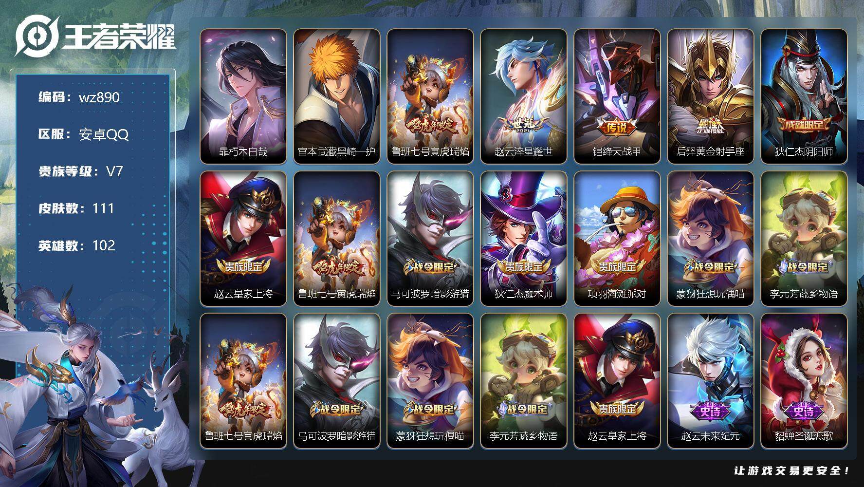 【账号佳】 【可二次实名】【wz890】【商品标题】:安卓Q-V7-永恒钻石I段位-102英雄-111皮肤-0典藏-0珍品无双-0无双-2珍品传说-4传说-29史诗 【珍品传说】:暃朽木白哉,宫本武藏黑崎一护 【传说皮肤】:鲁班七号寅虎瑞焰,赵云淬星耀世,铠绛天战甲,后羿黄金射手座 【限定皮肤】:狄仁杰阴阳师,赵云皇家上将,鲁班七号寅虎瑞焰,马可波罗暗影游猎,狄仁杰魔术师,项羽海滩派对,蒙犽狂想玩偶喵,李元芳蔬乡物语 【年限皮肤】:鲁班七号寅虎瑞焰 【战令限定】:马可波罗暗影游猎,蒙犽狂想玩偶喵,李元芳蔬乡物语 【史诗皮肤】:赵云皇家上将,赵云未来纪元,貂蝉圣诞恋歌,狄仁杰魔术师,廉颇地狱岩魂,宫本武藏鬼剑武藏,孙尚香水果甜心,妲己魅力维加斯,吕布圣诞狂欢,夏侯惇乘风破浪,兰陵王暗隐猎兽者,诸葛亮黄金分割率,铠曙光守护者,狄仁杰鹰眼统帅,不知火舞魅语,瑶遇见神鹿,孙尚香时之恋人,马可波罗暗影游猎,蒙犽狂想玩偶喵,孙膑茶境仙,阿轲化蝶舞,刘禅鸭鸭历险记,狂铁龙之律动,牛魔小牛鸭,后羿石田雨龙,周瑜百相守梦,钟无艳戍鼓铭心,黄忠百相守梦,西施织梦人 【其他皮肤】:项羽海滩派对,韩信街头霸王,赵云白执事,赵云忍炎影,芈月红桃皇后,白起白色死神,牛魔西部大镖客,安琪拉玩偶对对碰,姜子牙时尚教父,妲己少女阿狸,典韦黄金武士,亚瑟死亡骑士,达摩拳王,甄姬花好人间,后羿阿尔法小队,狄仁杰阴阳师,刘备汉昭烈帝,钟无艳海滩丽影,王昭君幻想奇妙夜,诸葛亮掌控之力,小乔丁香结,盘古重装意志,马可波罗潮玩牛仔,蒙犽胡桃狂想曲,海月幻泉雾影,莱西奥西部游侠,李元芳蔬乡物语,太乙真人谧流熔炉,马超访茗客,明世隐景韶洛都,戈娅玫蓝誓约,刘备浪漫序章,钟馗虚灵犬护,沈梦溪鸭鸭历险记,苏烈春野闲踪,小乔秘证寻踪,张良灵野札记,阿古朵布丁狗之约,露娜命运加冕,雅典娜潮玩士官长,姬小满小满鸭,白起死霸装,甄姬逆浪荇歌,孙策百相守梦,庄周锦麟游梦,空空儿戏梦巡演,莱西奥踏浪烽翎,鬼谷子克喵,鲁班七号福禄兄弟,鲁班七号木偶奇遇记,项羽帝国元帅,钟无艳生化警戒,张良一千零一夜,小乔万圣前夜,后羿精灵王,刘禅英喵野望,虞姬加勒比小姐,蔡文姬蔷薇王座,夏侯惇战争骑士,马可波罗激情绿茵,杨戬埃及法老,诸葛亮星航指挥官,黄忠芝加哥教父,干将莫邪第七人偶,铠龙域领主,百里守约绝影神枪,米莱狄精准探案法,伽罗花见巫女,李信灼热之刃,猪八戒年年有余,瑶森,云中君荷鲁斯之眼,西施归虚梦演,鲁班大师归虚梦演,澜孤猎,云缨赤焰之缨 【营地ID】:1644207872