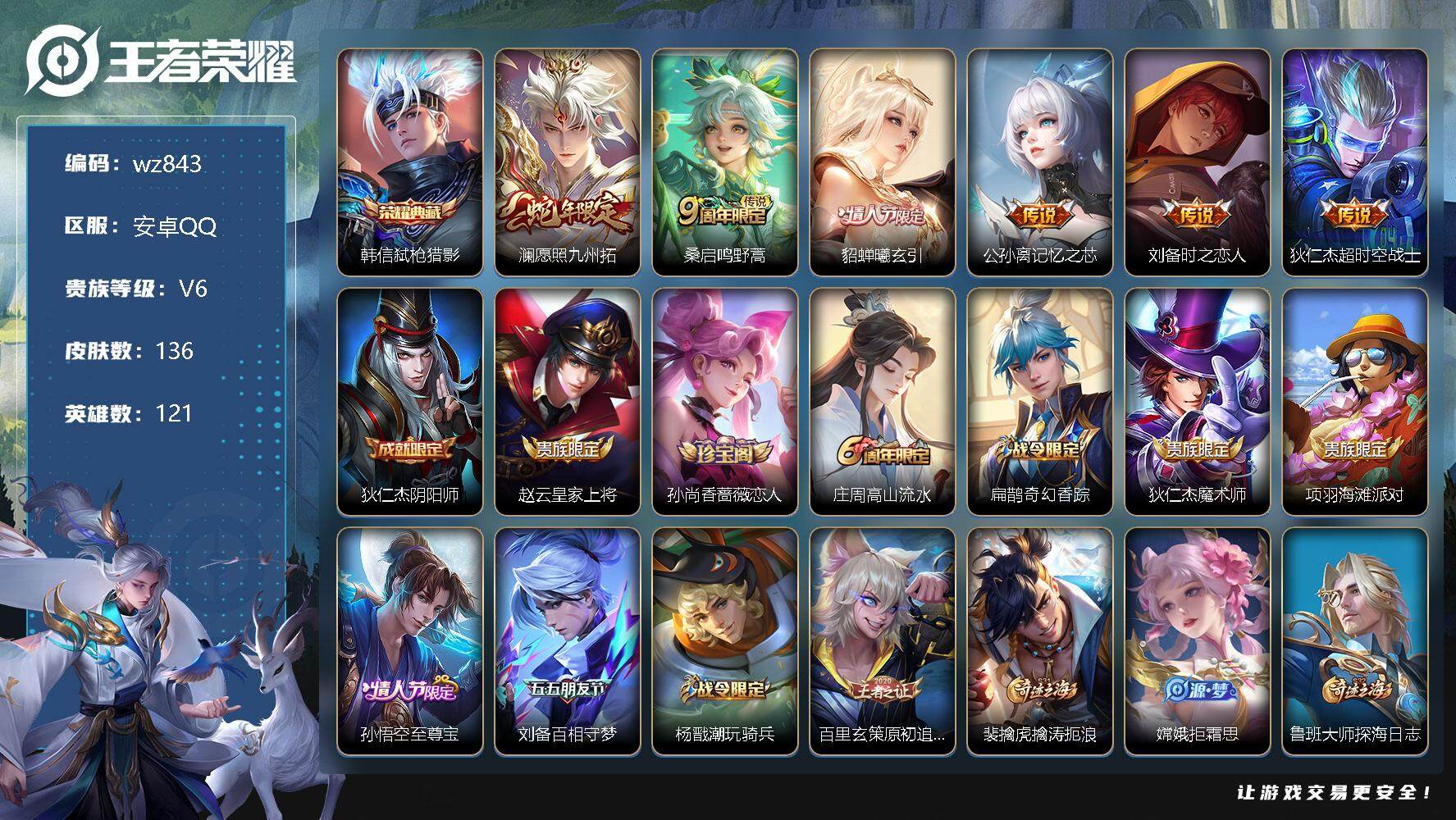 【账号佳】 【可二次实名】【wz843】【商品标题】:安卓Q-V6-最强王者段位-121英雄-136皮肤-1典藏-0珍品无双-0无双-0珍品传说-6传说-41史诗 【荣耀典藏】:韩信弑枪猎影 【传说皮肤】:澜愿照九州拓,桑启鸣野蒿,貂蝉曦玄引,公孙离记忆之芯,刘备时之恋人,狄仁杰超时空战士 【限定皮肤】:狄仁杰阴阳师,赵云皇家上将,孙尚香蔷薇恋人,庄周高山流水,扁鹊奇幻香踪,狄仁杰魔术师,项羽海滩派对,孙悟空至尊宝,刘备百相守梦,杨戬潮玩骑兵,百里玄策原初追逐者,裴擒虎擒涛扼浪,嫦娥拒霜思,鲁班大师探海日志,阿古朵江河有灵,张良古海寻踪,鬼谷子天穹祈灯,大乔乘龙忆丹青,貂蝉曦玄引,沈梦溪龙舞盛年,刘邦剑破天穹,周瑜熔金海岸 【年限皮肤】:大乔乘龙忆丹青 【赛季限定】:张良古海寻踪,百里玄策原初追逐者,裴擒虎擒涛扼浪,鲁班大师探海日志,鬼谷子天穹祈灯,刘邦剑破天穹 【战令限定】:扁鹊奇幻香踪,杨戬潮玩骑兵 【史诗皮肤】:鲁班七号电玩小子,露娜紫霞仙子,赵云皇家上将,赵云未来纪元,甄姬冰雪圆舞曲,狄仁杰魔术师,廉颇地狱岩魂,宫本武藏鬼剑武藏,孙尚香蔷薇恋人,孙尚香水果甜心,嬴政摇滚巨星,妲己魅力维加斯,墨子金属风暴,李白千年之狐,吕布末日机甲,孙悟空至尊宝,花木兰水晶猎龙者,夏侯惇乘风破浪,兰陵王暗隐猎兽者,诸葛亮黄金分割率,亚瑟心灵战警,百里守约特工魅影,李元芳逐浪之夏,程咬金功夫厨神,白起星夜王子,孙策猫狗日记,大乔猫狗日记,狄仁杰鹰眼统帅,小乔青蛇,百里玄策原初追逐者,庄周高山流水,嫦娥拒霜思,扁鹊奇幻香踪,刘备百相守梦,刘禅电玩爆裂旋风,阿古朵江河有灵,大乔乘龙忆丹青,亚连破空之剑,牛魔星界战将,阿轲化蝶舞,黄忠百相守梦 【其他皮肤】:项羽海滩派对,韩信教廷特使,韩信街头霸王,露娜哥特玫瑰,阿轲爱心护理,赵云忍炎影,程咬金星际陆战队,白起白色死神,扁鹊救世之瞳,宫本武藏未来纪元,安琪拉玩偶对对碰,孙膑天使之翼,典韦黄金武士,亚瑟死亡骑士,张飞五福同心,甄姬花好人间,狄仁杰阴阳师,刘备纽约教父,关羽龙腾万里,王昭君幻想奇妙夜,狂铁命运角斗场,老夫子功夫老勺,诸葛亮掌控之力,李白敏锐之力,小乔丁香结,哪吒次元突破,狂铁特工战影,刘禅秘密基地,鲁班大师乓乓大师,猪八戒潮玩探月行,裴擒虎擒涛扼浪,杨戬潮玩骑兵,太乙真人劲辣红锅,鲁班大师探海日志,姬小满零食大作战,李元芳妄想特派,张良古海寻踪,钟无艳聚星闪耀,海月王牌新星,亚连破局者,后羿完美运算,鬼谷子天穹祈灯,嫦娥漠中幻影,沈梦溪龙舞盛年,刘邦剑破天穹,周瑜熔金海岸,孙悟空神迹守卫,盘古敬我三分,东皇太一噬灭天穹,干将莫邪雾都夜雨,苍苍林狼骑,太乙真人谧流熔炉,典韦铁骨偃魂,影魅影绮裳,西施雪境奇遇,明世隐景韶洛都,甄姬逆浪荇歌,莱西奥踏浪烽翎,鲁班七号福禄兄弟,高渐离金属狂潮,钟无艳生化警戒,老夫子潮流仙人,王昭君精灵公主,狄仁杰锦衣卫,小乔万圣前夜,孙膑未来旅行,孙悟空西部大镖客,后羿精灵王,李白范海辛,钟馗地府判官,马可波罗激情绿茵,杨戬埃及法老,哪吒三太子,黄忠芝加哥教父,大乔伊势巫女,铠龙域领主,女娲尼罗河女神,公孙离花间舞,杨玉环霓裳曲,米莱狄精准探案法,司马懿魇语军师,李信灼热之刃,盘古创世神祝,曜归虚梦演,阿古朵熊喵少女,澜孤猎,云缨赤焰之缨,暃碧珀绯影 【内测皮肤】:孙尚香蔷薇恋人,狂铁特工战影 【营地ID】:1791132426