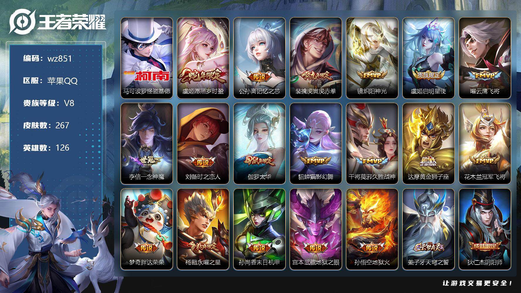【账号佳】 【可二次实名】【wz851】【商品标题】:苹果Q-V8-至尊星耀III段位-126英雄-267皮肤-0典藏-0珍品无双-0无双-1珍品传说-18传说-73史诗 【珍品传说】:马可波罗怪盗基德 【传说皮肤】:虞姬愿照岁时盈,公孙离记忆之芯,裴擒虎寅虎赤拳,镜炽阳神光,虞姬启明星使,曜云鹰飞将,李信一念神魔,刘备时之恋人,伽罗太华,貂蝉猫影幻舞,干将莫邪久胜战神,达摩黄金狮子座,花木兰冠军飞将,梦奇胖达荣荣,杨戬永曜之星,孙尚香末日机甲,宫本武藏地狱之眼,孙悟空地狱火 【限定皮肤】:姜子牙天穹之誓,狄仁杰阴阳师,赵云皇家上将,庄周高山流水,扁鹊奇幻香踪,吕布猎兽之王,元歌云间偶戏,夏侯惇朔风刀,甄姬游园惊梦,典韦岱宗,狄仁杰魔术师,狄仁杰万华元夜,达摩沙漠行僧,项羽海滩派对,老夫子醍醐杖,程咬金演武夺筹,韩信飞衡,兰陵王金庭之子,亚瑟潮玩骑士王,后羿辉光之辰,李元芳银河之约,李元芳匿光侦查者,李元芳云中旅人,虞姬启明星使,钟馗驱傩正仪,杨戬永曜之星,杨戬潮玩骑兵,雅典娜单词大作战,蔡文姬繁星吟游,鬼谷子原初探秘者,鬼谷子五谷丰年,苏烈千军破阵,百里玄策原初追逐者,弈星混沌棋,梦奇顽趣,沈梦溪星空之诺,明世隐疑决卦,裴擒虎李小龙,裴擒虎寅虎赤拳,裴擒虎擒涛扼浪,云中君纤云弄巧,伽罗太华,盾山御銮,猪八戒猪悟能,上官婉儿天狼绘梦者,嫦娥拒霜思,西施玲珑珍味,蒙犽狂想玩偶喵,鲁班大师探海日志,桑启海盐诗旅,戈娅驭风魔法,艾琳女武神,艾琳流音漫舞,司空震地狱燃心,阿古朵江河有灵,张良古海寻踪,蒙犽百解令,蒙恬荣光圣徽,高渐离燃音魔法,妲己灵卜魔法,鬼谷子天穹祈灯,姬小满妄想食味,沈梦溪龙舞盛年,刘邦剑破天穹,程咬金群星魔术团,周瑜熔金海岸 【年限皮肤】:裴擒虎寅虎赤拳,杨戬永曜之星,后羿辉光之辰,伽罗太华,韩信飞衡,典韦岱宗,马超神威 【赛季限定】:夏侯惇朔风刀,狄仁杰万华元夜,达摩沙漠行僧,老夫子醍醐杖,程咬金演武夺筹,兰陵王金庭之子,张良古海寻踪,李元芳云中旅人,钟馗驱傩正仪,鬼谷子原初探秘者,苏烈千军破阵,百里玄策原初追逐者,弈星混沌棋,梦奇顽趣,明世隐疑决卦,裴擒虎擒涛扼浪,盾山御銮,鲁班大师探海日志,桑启海盐诗旅,鬼谷子天穹祈灯,蒙恬荣光圣徽,刘邦剑破天穹,姜子牙天穹之誓 【战令限定】:扁鹊奇幻香踪,吕布猎兽之王,元歌云间偶戏,艾琳流音漫舞,亚瑟潮玩骑士王,李元芳银河之约,杨戬潮玩骑兵,雅典娜单词大作战,沈梦溪星空之诺,西施玲珑珍味,蒙犽狂想玩偶喵,司空震地狱燃心,戈娅驭风魔法,高渐离燃音魔法,妲己灵卜魔法 【史诗皮肤】:鲁班七号电玩小子,露娜紫霞仙子,阿轲暗夜猫娘,赵云皇家上将,赵云未来纪元,貂蝉圣诞恋歌,甄姬冰雪圆舞曲,王昭君偶像歌手,狄仁杰魔术师,廉颇地狱岩魂,宫本武藏鬼剑武藏,孙尚香水果甜心,嬴政暗夜贵公子,嬴政摇滚巨星,墨子金属风暴,吕布圣诞狂欢,刘禅绅士熊喵,李白千年之狐,吕布末日机甲,花木兰水晶猎龙者,刘邦德古拉伯爵,夏侯惇乘风破浪,小乔缤纷独角兽,兰陵王暗隐猎兽者,诸葛亮黄金分割率,甄姬游园惊梦,亚瑟心灵战警,后羿辉光之辰,百里守约特工魅影,李元芳逐浪之夏,程咬金功夫厨神,白起星夜王子,阿轲节奏热浪,孙策猫狗日记,伽罗箭羽风息,狄仁杰鹰眼统帅,蔡文姬繁星吟游,李元芳银河之约,韩信飞衡,典韦岱宗,不知火舞魅语,橘右京修罗,马超神威,上官婉儿天狼绘梦者,蒙犽狂想玩偶喵,百里玄策原初追逐者,裴擒虎李小龙,云中君纤云弄巧,元歌云间偶戏,沈梦溪月团寄思,猪八戒猪悟能,庄周高山流水,嫦娥拒霜思,夏洛特永昼,艾琳奇遇舞章,鬼谷子五谷丰年,梦奇顽趣,扁鹊奇幻香踪,刘禅电玩爆裂旋风,戈娅驭风魔法,李元芳匿光侦查者,司空震地狱燃心,阿古朵江河有灵,蒙犽百解令,妲己灵卜魔法,高渐离燃音魔法,蒙恬荣光圣徽,姬小满妄想食味,百里守约百相守梦,牛魔星界战将,赵怀真器灵浮梦炉,狂铁龙之律动,扁鹊灵蛊蚀心,黄忠百相守梦 【其他皮肤】:项羽海滩派对,韩信教廷特使,韩信街头霸王,露娜哥特玫瑰,达摩大发明家,赵云忍炎影,芈月红桃皇后,艾琳女武神,程咬金星际陆战队,白起白色死神,扁鹊化身博士,扁鹊救世之瞳,孙膑天使之翼,妲己少女阿狸,典韦黄金武士,达摩拳王,花木兰兔女郎,张飞五福同心,甄姬花好人间,刘备万事如意,宫本武藏万象初新,后羿阿尔法小队,狄仁杰阴阳师,刘备纽约教父,刘备汉昭烈帝,关羽龙腾万里,钟无艳海滩丽影,宫本武藏霸王丸,老夫子功夫老勺,孙尚香沉稳之力,诸葛亮掌控之力,李白敏锐之力,鬼谷子幻乐之宴,苏烈坚韧之力,项羽科学大爆炸,吕布猎兽之王,明世隐虹云星官,吕布野性能量,盾山御銮,孙膑归虚梦演,沈梦溪鲨炮海盗猫,姜子牙炽热元素使,夏侯惇朔风刀,沈梦溪星空之诺,弈星混沌棋,哪吒次元突破,鲁班七号黑桃队长,明世隐疑决卦,盾山圆桌骑士,老夫子醍醐杖,狂铁特工