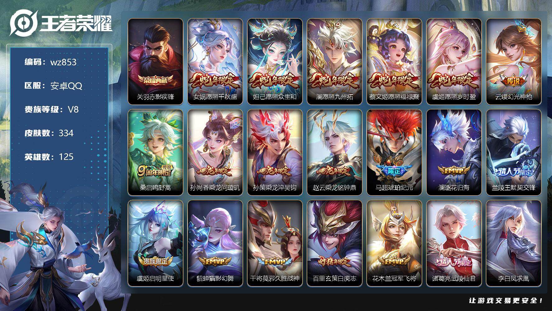 【账号佳】 【可二次实名】【wz853】【商品标题】:安卓Q-V8-永恒钻石I段位-125英雄-334皮肤-1典藏-0珍品无双-0无双-0珍品传说-22传说-96史诗 【荣耀典藏】:关羽赤影疾锋 【传说皮肤】:女娲愿照千秋盛,妲己愿照众生和,澜愿照九州拓,蔡文姬愿照福禄聚,虞姬愿照岁时盈,云缨幻光神枪,桑启鸣野蒿,孙尚香乘龙问璇玑,孙策乘龙淬吴钩,赵云乘龙铭钟鼎,马超琥珀纪元,澜逐花归海,兰陵王默契交锋,虞姬启明星使,貂蝉猫影幻舞,干将莫邪久胜战神,百里玄策白虎志,花木兰冠军飞将,诸葛亮武陵仙君,李白凤求凰,孙悟空地狱火,狄仁杰超时空战士 【限定皮肤】:白起狰,大乔绒语心约,姜子牙天穹之誓,李白谪仙醉月,狄仁杰阴阳师,虞姬凯尔特女王,赵云皇家上将,嬴政优雅恋人,鲁班七号狮舞东方,孙膑妖精王,扁鹊炼金王,芈月重明,周瑜赤莲之焰,元歌云间偶戏,元歌无心,夏侯惇朔风刀,曹操烛龙,典韦穷奇,典韦岱宗,马可波罗逐梦之星,狄仁杰魔术师,狄仁杰万华元夜,达摩沙漠行僧,项羽海滩派对,老夫子醍醐杖,程咬金演武夺筹,兰陵王默契交锋,兰陵王驯魔猎人,兰陵王金庭之子,花木兰青春决赛季,孙悟空至尊宝,牛魔御旌,后羿如梦令,李元芳银河之约,李元芳匿光侦查者,李元芳云中旅人,虞姬启明星使,钟馗神迹守卫,钟馗驱傩正仪,杨玉环遇见飞天,女娲朔望之晖,干将莫邪冰霜恋舞曲,蔡文姬繁星吟游,太乙真人饕餮,鬼谷子原初探秘者,诸葛亮武陵仙君,苏烈千军破阵,百里玄策白虎志,弈星混沌棋,梦奇顽趣,沈梦溪星空之诺,沈梦溪大漠名商,明世隐疑决卦,裴擒虎天狼狩猎者,裴擒虎李小龙,裴擒虎擒涛扼浪,狂铁御狮,狂铁电玩高手,云中君纤云弄巧,上官婉儿梁祝,嫦娥如梦令,嫦娥拒霜思,嫦娥暖冬兔眠,西施玲珑珍味,鲁班大师探海日志,桑启海盐诗旅,戈娅驭风魔法,艾琳流音漫舞,司空震地狱燃心,阿古朵江河有灵,张良古海寻踪,蒙犽百解令,蒙恬荣光圣徽,高渐离燃音魔法,妲己灵卜魔法,鬼谷子天穹祈灯,伽罗琥珀纪元,马超琥珀纪元,姬小满妄想食味,大乔乘龙忆丹青,安琪拉乘龙聚宝船,孙尚香乘龙问璇玑,孙策乘龙淬吴钩,赵云乘龙铭钟鼎,沈梦溪龙舞盛年,鲁班七号蔬乡物语,李元芳蔬乡物语,刘邦剑破天穹,程咬金群星魔术团,镜青焰无极,周瑜熔金海岸 【年限皮肤】:百里玄策白虎志,李白凤求凰,典韦岱宗,大乔乘龙忆丹青,安琪拉乘龙聚宝船,孙尚香乘龙问璇玑,孙策乘龙淬吴钩,赵云乘龙铭钟鼎 【赛季限定】:孙膑妖精王,扁鹊炼金王,白起狰,芈月重明,夏侯惇朔风刀,曹操烛龙,典韦穷奇,狄仁杰万华元夜,达摩沙漠行僧,老夫子醍醐杖,程咬金演武夺筹,兰陵王金庭之子,张良古海寻踪,牛魔御旌,李元芳云中旅人,虞姬凯尔特女王,钟馗驱傩正仪,太乙真人饕餮,鬼谷子原初探秘者,苏烈千军破阵,弈星混沌棋,梦奇顽趣,沈梦溪大漠名商,明世隐疑决卦,裴擒虎擒涛扼浪,狂铁御狮,鲁班大师探海日志,桑启海盐诗旅,鬼谷子天穹祈灯,蒙恬荣光圣徽,刘邦剑破天穹,姜子牙天穹之誓 【战令限定】:鲁班七号狮舞东方,周瑜赤莲之焰,元歌云间偶戏,兰陵王驯魔猎人,艾琳流音漫舞,李元芳银河之约,钟馗神迹守卫,女娲朔望之晖,沈梦溪星空之诺,狂铁电玩高手,嫦娥暖冬兔眠,西施玲珑珍味,司空震地狱燃心,戈娅驭风魔法,高渐离燃音魔法,妲己灵卜魔法,鲁班七号蔬乡物语,李元芳蔬乡物语,镜青焰无极 【史诗皮肤】:露娜紫霞仙子,赵云皇家上将,貂蝉圣诞恋歌,甄姬冰雪圆舞曲,王昭君偶像歌手,狄仁杰魔术师,廉颇地狱岩魂,宫本武藏鬼剑武藏,孙尚香水果甜心,嬴政优雅恋人,嬴政暗夜贵公子,嬴政摇滚巨星,妲己魅力维加斯,妲己女仆咖啡,墨子金属风暴,吕布圣诞狂欢,刘禅绅士熊喵,曹操幽灵船长,李白千年之狐,吕布末日机甲,张飞乱世虎臣,韩信白龙吟,孙悟空至尊宝,花木兰水晶猎龙者,刘邦德古拉伯爵,夏侯惇乘风破浪,小乔缤纷独角兽,兰陵王暗隐猎兽者,诸葛亮黄金分割率,马可波罗逐梦之星,亚瑟心灵战警,雅典娜冰冠公主,安琪拉心灵骇客,花木兰青春决赛季,百里守约特工魅影,铠曙光守护者,蔡文姬舞动绿茵,刘禅天才门将,李元芳逐浪之夏,程咬金功夫厨神,白起星夜王子,阿轲节奏热浪,杨玉环遇见飞天,孙策猫狗日记,大乔猫狗日记,干将莫邪冰霜恋舞曲,伽罗箭羽风息,裴擒虎天狼狩猎者,鲁班七号狮舞东方,狄仁杰鹰眼统帅,兰陵王驯魔猎人,上官婉儿梁祝,蔡文姬繁星吟游,李元芳银河之约,娜可露露晚萤,典韦岱宗,嫦娥如梦令,后羿如梦令,大乔白蛇,小乔青蛇,不知火舞魅语,瑶遇见神鹿,裴擒虎李小龙,云中君纤云弄巧,元歌云间偶戏,杨戬天秀启明,钟馗乐园奇幻夜,嫦娥拒霜思,高渐离天秀音浪,狂铁电玩高手,庄周天秀幻梦,元歌无心,梦奇顽趣,戈娅驭风魔法,莱西奥末日机甲,李元芳匿光侦查者,司空震地狱燃心,阿古朵江河有灵,蒙犽百解令,妲己灵卜魔法,高渐离燃音魔法,蒙恬荣光圣徽,伽罗琥珀纪元,姬小满妄想食