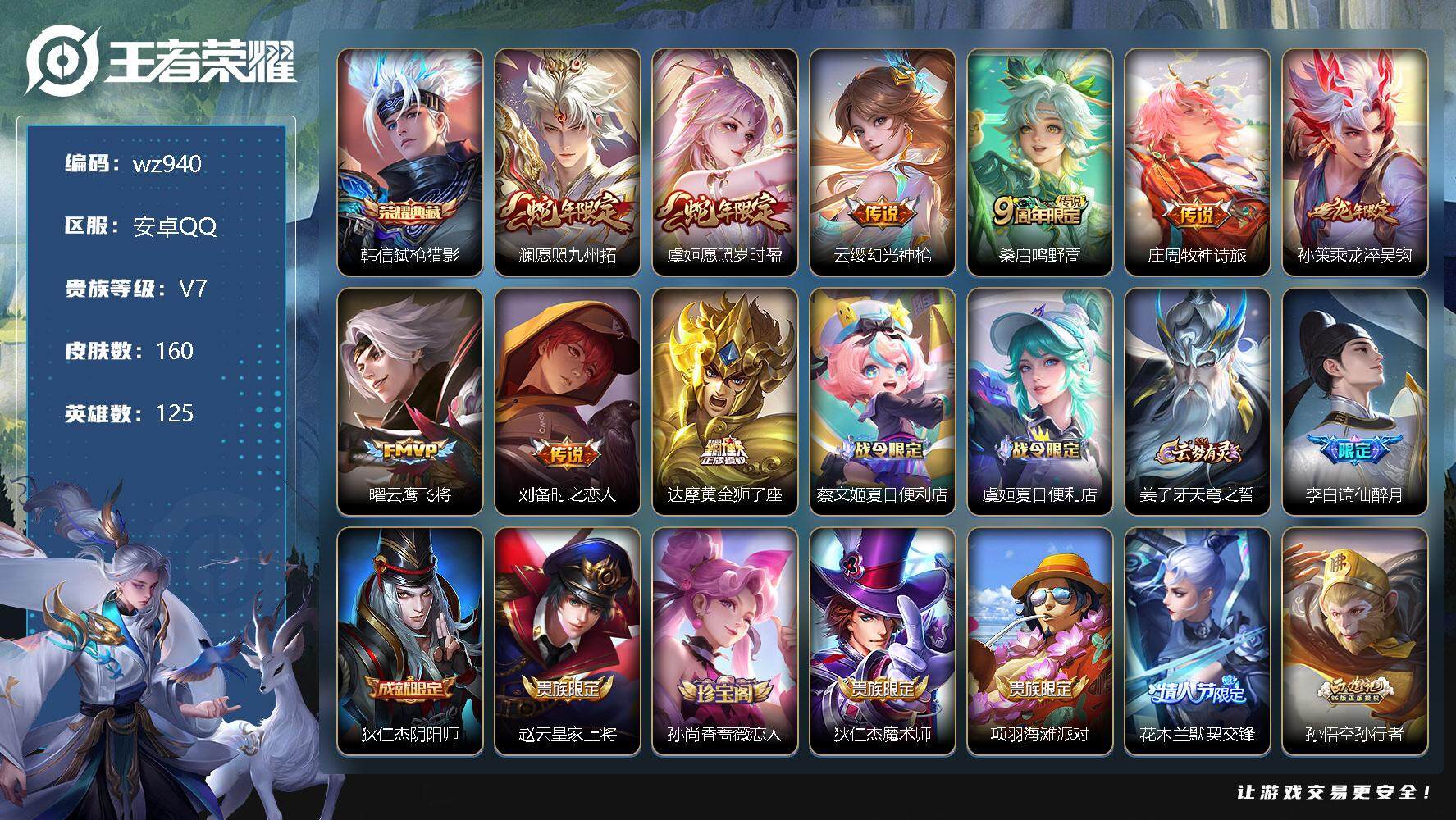 【账号佳】 【可二次实名】【wz940】【商品标题】:安卓Q-V7-尊贵铂金IV段位-125英雄-160皮肤-1典藏-0珍品无双-0无双-0珍品传说-9传说-69史诗 【荣耀典藏】:韩信弑枪猎影 【传说皮肤】:澜愿照九州拓,虞姬愿照岁时盈,云缨幻光神枪,桑启鸣野蒿,庄周牧神诗旅,孙策乘龙淬吴钩,曜云鹰飞将,刘备时之恋人,达摩黄金狮子座 【限定皮肤】:蔡文姬夏日便利店,虞姬夏日便利店,姜子牙天穹之誓,李白谪仙醉月,狄仁杰阴阳师,赵云皇家上将,孙尚香蔷薇恋人,狄仁杰魔术师,项羽海滩派对,花木兰默契交锋,孙悟空孙行者,后羿如梦令,钟馗神迹守卫,杨玉环遇见飞天,哪吒逐梦之翼,雅典娜单词大作战,沈梦溪大漠名商,云中君纤云弄巧,猪八戒西部大镖客,嫦娥拒霜思,鲁班大师探海日志,桑启海盐诗旅,艾琳流音漫舞,司空震地狱燃心,阿古朵江河有灵,张良古海寻踪,蒙犽百解令,高渐离燃音魔法,妲己灵卜魔法,鬼谷子天穹祈灯,伽罗琥珀纪元,孙策乘龙淬吴钩,沈梦溪龙舞盛年,刘邦剑破天穹,程咬金群星魔术团,镜青焰无极,项羽苍威无极,周瑜熔金海岸 【年限皮肤】:孙策乘龙淬吴钩 【赛季限定】:张良古海寻踪,沈梦溪大漠名商,鲁班大师探海日志,桑启海盐诗旅,鬼谷子天穹祈灯,刘邦剑破天穹,姜子牙天穹之誓 【战令限定】:蔡文姬夏日便利店,虞姬夏日便利店,艾琳流音漫舞,钟馗神迹守卫,雅典娜单词大作战,猪八戒西部大镖客,司空震地狱燃心,高渐离燃音魔法,妲己灵卜魔法,镜青焰无极,项羽苍威无极 【史诗皮肤】:露娜紫霞仙子,赵云皇家上将,貂蝉圣诞恋歌,甄姬冰雪圆舞曲,王昭君偶像歌手,狄仁杰魔术师,廉颇地狱岩魂,宫本武藏鬼剑武藏,孙尚香蔷薇恋人,孙尚香水果甜心,嬴政暗夜贵公子,嬴政摇滚巨星,妲己女仆咖啡,墨子龙骑士,吕布圣诞狂欢,刘禅绅士熊喵,李白千年之狐,吕布末日机甲,花木兰水晶猎龙者,刘邦德古拉伯爵,夏侯惇乘风破浪,小乔缤纷独角兽,兰陵王暗隐猎兽者,诸葛亮黄金分割率,亚瑟心灵战警,雅典娜冰冠公主,百里守约特工魅影,铠曙光守护者,蔡文姬舞动绿茵,哪吒逐梦之翼,李元芳逐浪之夏,白起星夜王子,杨玉环遇见飞天,孙策猫狗日记,大乔猫狗日记,伽罗箭羽风息,狄仁杰鹰眼统帅,公孙离无限星赏官,后羿如梦令,小乔青蛇,不知火舞魅语,云中君纤云弄巧,花木兰默契交锋,百里玄策热力回旋,杨戬天秀启明,沈梦溪月团寄思,孙悟空孙行者,司马懿暗渊魔法,嫦娥拒霜思,司空震地狱燃心,阿古朵江河有灵,蒙犽百解令,妲己灵卜魔法,高渐离燃音魔法,伽罗琥珀纪元,镜青焰无极,黄忠怒海争锋,蔡文姬夏日便利店,大司命东方月初,姬小满战舞者,亚连破空之剑,马可波罗星界特工,李白谪仙醉月,百里守约百相守梦,孙膑茶境仙,芈月瑰影绮梦,阿轲化蝶舞,刘禅鸭鸭历险记,狂铁龙之律动,后羿石田雨龙 【其他皮肤】:项羽海滩派对,韩信教廷特使,韩信街头霸王,露娜哥特玫瑰,赵云白执事,白起白色死神,扁鹊化身博士,孙膑天使之翼,典韦黄金武士,达摩拳王,刘备万事如意,宫本武藏万象初新,后羿阿尔法小队,狄仁杰阴阳师,关羽龙腾万里,王昭君幻想奇妙夜,老夫子功夫老勺,小乔丁香结,吕布野性能量,钟馗神迹守卫,猪八戒西部大镖客,狂铁特工战影,雅典娜单词大作战,鲁班大师乓乓大师,妲己紫罗兰之誓,刘邦虎啸剑宗,沈梦溪大漠名商,刘备潮玩造梦师,桑启海盐诗旅,太乙真人劲辣红锅,鲁班大师探海日志,李元芳妄想特派,哪吒热血海滩,艾琳流音漫舞,张良古海寻踪,钟无艳聚星闪耀,亚连破局者,曹操决胜大满贯,程咬金暖冬絮语,鬼谷子天穹祈灯,妲己灵卜魔法,嫦娥漠中幻影,廉颇功夫炙烤,亚瑟鸿运当头,沈梦溪龙舞盛年,刘邦剑破天穹,盘古经纬探寻者,程咬金群星魔术团,项羽苍威无极,姜子牙天穹之誓,周瑜熔金海岸,虞姬夏日便利店,孙悟空神迹守卫,盘古敬我三分,老夫子百相守梦,干将莫邪雾都夜雨,苍苍林狼骑,太乙真人谧流熔炉,典韦铁骨偃魂,马超访茗客,西施雪境奇遇,明世隐景韶洛都,戈娅玫蓝誓约,刘备浪漫序章,钟馗虚灵犬护,沈梦溪鸭鸭历险记,苏烈春野闲踪,张良灵野札记,阿古朵布丁狗之约,露娜命运加冕,白起死霸装,莱西奥踏浪烽翎,刘邦圣殿之光,夏侯惇战争骑士,苍维京掠夺者,哪吒三太子,铠龙域领主,百里守约绝影神枪,弈星踏雪寻梅,鲁班大师归虚梦演,蒙恬秩序猎龙将 【内测皮肤】:孙尚香蔷薇恋人,狂铁特工战影 【营地ID】:1703681035