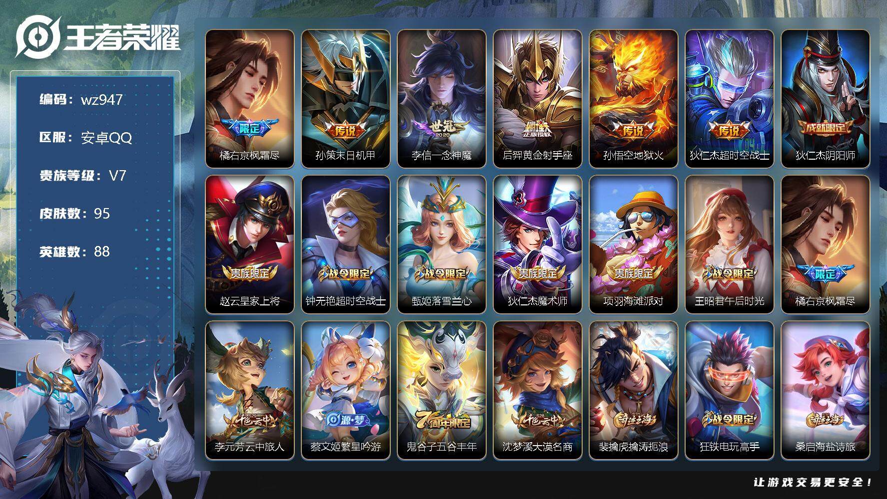 【账号佳】 【可二次实名】【wz947】【商品标题】:安卓Q-V7-最强王者段位-88英雄-95皮肤-0典藏-0珍品无双-0无双-0珍品传说-6传说-27史诗 【传说皮肤】:橘右京枫霜尽,孙策末日机甲,李信一念神魔,后羿黄金射手座,孙悟空地狱火,狄仁杰超时空战士 【限定皮肤】:狄仁杰阴阳师,赵云皇家上将,钟无艳超时空战士,甄姬落雪兰心,狄仁杰魔术师,项羽海滩派对,王昭君午后时光,橘右京枫霜尽,李元芳云中旅人,蔡文姬繁星吟游,鬼谷子五谷丰年,沈梦溪大漠名商,裴擒虎擒涛扼浪,狂铁电玩高手,桑启海盐诗旅 【赛季限定】:李元芳云中旅人,沈梦溪大漠名商,裴擒虎擒涛扼浪,桑启海盐诗旅 【战令限定】:钟无艳超时空战士,甄姬落雪兰心,王昭君午后时光,狂铁电玩高手 【史诗皮肤】:鲁班七号电玩小子,赵云皇家上将,赵云未来纪元,狄仁杰魔术师,宫本武藏鬼剑武藏,孙尚香水果甜心,妲己魅力维加斯,刘禅绅士熊喵,吕布末日机甲,花木兰水晶猎龙者,雅典娜冰冠公主,安琪拉心灵骇客,铠曙光守护者,李元芳逐浪之夏,白起星夜王子,阿轲节奏热浪,狄仁杰鹰眼统帅,蔡文姬繁星吟游,橘右京修罗,狂铁电玩高手,庄周天秀幻梦,钟无艳超时空战士,鬼谷子五谷丰年,弈星万物之道,狂铁龙之律动,黄忠百相守梦,西施织梦人 【其他皮肤】:项羽海滩派对,韩信教廷特使,阿轲爱心护理,赵云白执事,赵云忍炎影,白起白色死神,扁鹊化身博士,扁鹊救世之瞳,亚瑟死亡骑士,花木兰兔女郎,甄姬花好人间,宫本武藏万象初新,狄仁杰阴阳师,墨子进击墨子号,王昭君幻想奇妙夜,孙尚香沉稳之力,苏烈坚韧之力,吕布野性能量,王昭君午后时光,沈梦溪大漠名商,甄姬落雪兰心,李元芳云中旅人,戈娅危途狂花,刘备潮玩造梦师,桑启海盐诗旅,赵怀真太极少年,裴擒虎擒涛扼浪,钟馗虚灵犬护,张良灵野札记,阿古朵布丁狗之约,露娜命运加冕,姬小满小满鸭,白起死霸装,甄姬逆浪荇歌,庄周锦麟游梦,莱西奥踏浪烽翎,鬼谷子克喵,哪吒罗小黑战记,鲁班七号福禄兄弟,高渐离金属狂潮,项羽帝国元帅,露娜绯红之刃,小乔万圣前夜,孙悟空西部大镖客,后羿精灵王,刘禅英喵野望,兰陵王隐刃,李白范海辛,李元芳特种部队,虞姬加勒比小姐,马可波罗激情绿茵,黄忠芝加哥教父,铠龙域领主,百里守约绝影神枪,苏烈爱与和平,明世隐占星师,裴擒虎街头旋风,孙策海之征途,盾山极冰防御线,李信灼热之刃,澜孤猎,云缨赤焰之缨 【营地ID】:1824634739