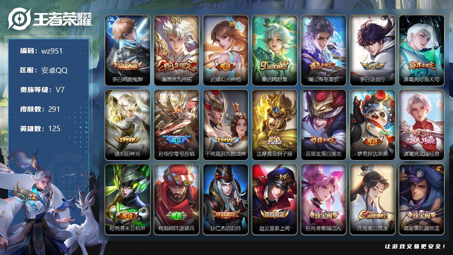 【账号佳】 【可二次实名】【wz951】【商品标题】:安卓Q-V7-最强王者段位-125英雄-291皮肤-1典藏-0珍品无双-0无双-0珍品传说-14传说-92史诗 【荣耀典藏】:李白鸣剑曳影 【传说皮肤】:澜愿照九州拓,云缨幻光神枪,桑启鸣野蒿,曜山海苍雷引,李白诗剑行,诸葛亮时雨天司,镜炽阳神光,孙悟空零号赤焰,干将莫邪久胜战神,达摩黄金狮子座,百里玄策白虎志,梦奇胖达荣荣,诸葛亮武陵仙君,孙尚香末日机甲 【限定皮肤】:杨戬破阵退雄兵,狄仁杰阴阳师,赵云皇家上将,孙尚香蔷薇恋人,庄周高山流水,高渐离玩趣恶龙,阿轲迷踪丽影,钟无艳超时空战士,芈月幻夜卜梦,吕布猎兽之王,元歌云间偶戏,元歌无心,甄姬游园惊梦,甄姬落雪兰心,马可波罗暗影游猎,狄仁杰魔术师,狄仁杰万华元夜,达摩星际陆战队,达摩沙漠行僧,项羽海滩派对,老夫子醍醐杖,程咬金演武夺筹,韩信逐梦之影,韩信飞衡,韩信傲雪梅枪,王昭君午后时光,兰陵王金庭之子,花木兰默契交锋,亚瑟潮玩骑士王,孙悟空大圣娶亲,孙悟空零号赤焰,孙悟空孙行者,后羿圣弓游侠,李元芳云中旅人,钟馗驱傩正仪,干将莫邪真爱魔法,雅典娜单词大作战,雅典娜黎明之约,蔡文姬繁星吟游,鬼谷子原初探秘者,鬼谷子五谷丰年,诸葛亮武陵仙君,诸葛亮时雨天司,黄忠火炮绅士,铠青龙志,苏烈千军破阵,百里玄策白虎志,百里玄策原初追逐者,梦奇顽趣,沈梦溪大漠名商,明世隐疑决卦,裴擒虎李小龙,裴擒虎擒涛扼浪,狂铁电玩高手,米莱狄胡桃异想国,云中君纤云弄巧,猪八戒西部大镖客,猪八戒猪悟能,上官婉儿天狼绘梦者,嫦娥拒霜思,嫦娥暖冬兔眠,曜山海苍雷引,西施玲珑珍味,蒙犽狂想玩偶喵,鲁班大师探海日志,镜匿光追影者,桑启海盐诗旅,暃星界游侠,戈娅驭风魔法,阿古朵江河有灵,张良古海寻踪,蒙犽百解令,蒙恬荣光圣徽,高渐离燃音魔法,妲己灵卜魔法,鬼谷子天穹祈灯,姬小满妄想食味,沈梦溪龙舞盛年,刘邦剑破天穹,程咬金群星魔术团,镜青焰无极,项羽苍威无极 【年限皮肤】:百里玄策白虎志,铠青龙志,诸葛亮时雨天司,韩信飞衡,曜山海苍雷引 【赛季限定】:狄仁杰万华元夜,达摩沙漠行僧,老夫子醍醐杖,程咬金演武夺筹,兰陵王金庭之子,张良古海寻踪,李元芳云中旅人,钟馗驱傩正仪,雅典娜黎明之约,鬼谷子原初探秘者,苏烈千军破阵,百里玄策原初追逐者,梦奇顽趣,沈梦溪大漠名商,明世隐疑决卦,裴擒虎擒涛扼浪,鲁班大师探海日志,桑启海盐诗旅,鬼谷子天穹祈灯,蒙恬荣光圣徽,刘邦剑破天穹 【战令限定】:阿轲迷踪丽影,钟无艳超时空战士,芈月幻夜卜梦,吕布猎兽之王,元歌云间偶戏,甄姬落雪兰心,马可波罗暗影游猎,达摩星际陆战队,王昭君午后时光,亚瑟潮玩骑士王,后羿圣弓游侠,干将莫邪真爱魔法,雅典娜单词大作战,黄忠火炮绅士,狂铁电玩高手,米莱狄胡桃异想国,猪八戒西部大镖客,嫦娥暖冬兔眠,西施玲珑珍味,蒙犽狂想玩偶喵,暃星界游侠,戈娅驭风魔法,高渐离燃音魔法,妲己灵卜魔法,镜青焰无极,项羽苍威无极 【史诗皮肤】:鲁班七号电玩小子,项羽苍穹之光,露娜紫霞仙子,赵云皇家上将,赵云未来纪元,貂蝉圣诞恋歌,甄姬冰雪圆舞曲,王昭君偶像歌手,狄仁杰魔术师,廉颇地狱岩魂,宫本武藏鬼剑武藏,孙尚香蔷薇恋人,孙尚香水果甜心,嬴政摇滚巨星,妲己魅力维加斯,妲己女仆咖啡,墨子金属风暴,吕布圣诞狂欢,刘禅绅士熊喵,曹操幽灵船长,李白千年之狐,吕布末日机甲,张飞乱世虎臣,韩信白龙吟,花木兰水晶猎龙者,刘邦德古拉伯爵,韩信逐梦之影,夏侯惇乘风破浪,小乔缤纷独角兽,兰陵王暗隐猎兽者,诸葛亮黄金分割率,甄姬游园惊梦,雅典娜冰冠公主,安琪拉心灵骇客,百里守约特工魅影,铠曙光守护者,蔡文姬舞动绿茵,刘禅天才门将,李元芳逐浪之夏,程咬金功夫厨神,白起星夜王子,阿轲节奏热浪,孙策猫狗日记,大乔猫狗日记,铠青龙志,孙悟空大圣娶亲,狄仁杰鹰眼统帅,公孙离无限星赏官,蔡文姬繁星吟游,娜可露露晚萤,韩信飞衡,阿轲迷踪丽影,橘右京修罗,上官婉儿天狼绘梦者,马可波罗暗影游猎,蒙犽狂想玩偶喵,百里玄策原初追逐者,裴擒虎李小龙,云中君纤云弄巧,元歌云间偶戏,花木兰默契交锋,米莱狄胡桃异想国,干将莫邪真爱魔法,沈梦溪月团寄思,孙悟空孙行者,猪八戒猪悟能,庄周高山流水,司马懿暗渊魔法,嫦娥拒霜思,镜匿光追影者,黄忠火炮绅士,雅典娜黎明之约,韩信傲雪梅枪,澜赏金猎手,狂铁电玩高手,钟无艳超时空战士,鬼谷子五谷丰年,元歌无心,梦奇顽趣,暃星界游侠,刘禅电玩爆裂旋风,戈娅驭风魔法,阿古朵江河有灵,蒙犽百解令,周瑜雪夜绮愿,妲己灵卜魔法,高渐离燃音魔法,蒙恬荣光圣徽,姬小满妄想食味,镜青焰无极,牛魔星界战将,阿轲化蝶舞,狂铁龙之律动 【其他皮肤】:项羽海滩派对,韩信教廷特使,韩信街头霸王,露娜哥特玫瑰,阿轲爱心护理,达摩大发明家,赵云忍炎影,白起白色死神,牛魔西部大镖客,武则天东