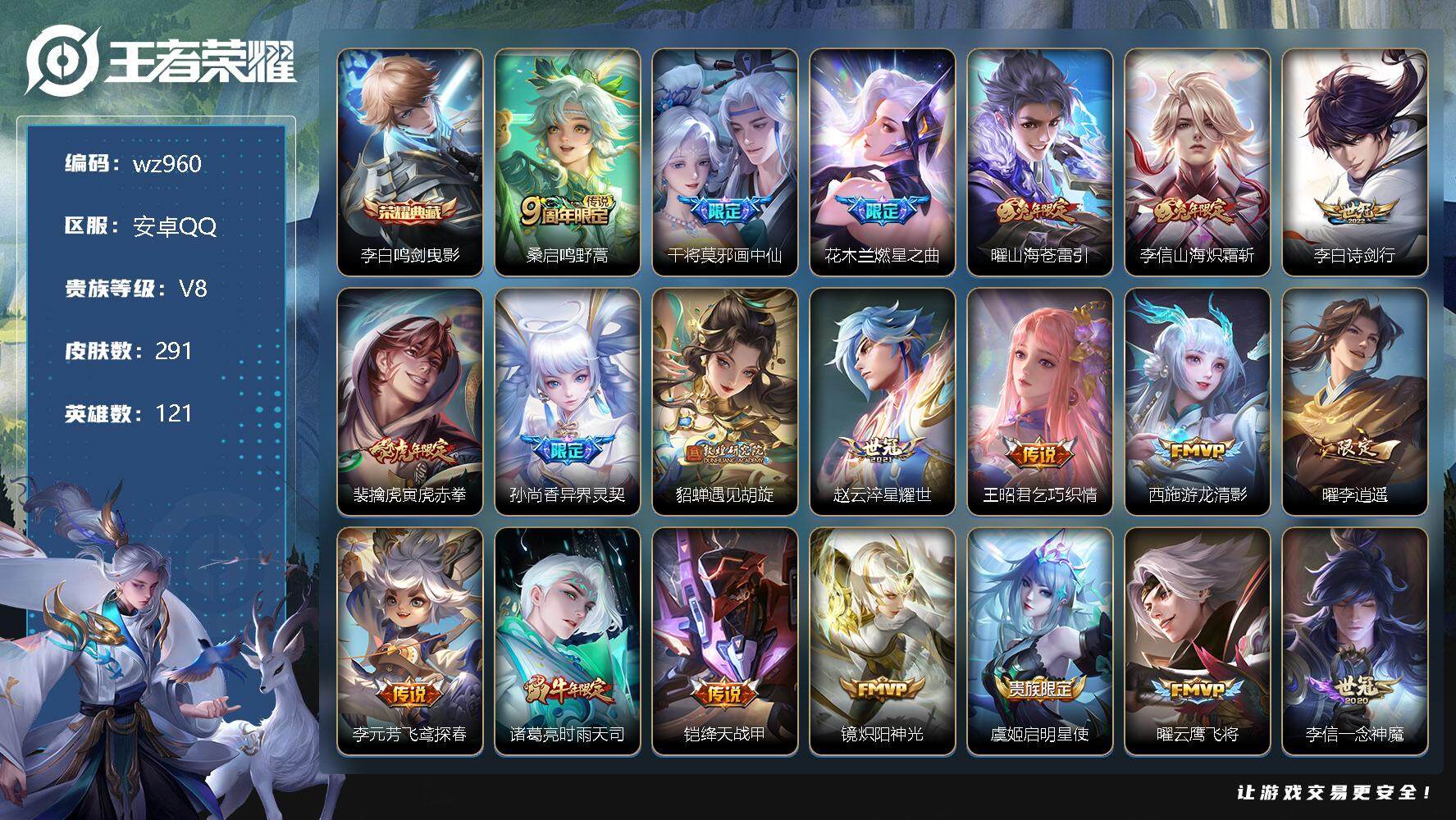 【账号佳】 【可二次实名】【wz960】【商品标题】:安卓Q-V8-永恒钻石I段位-121英雄-291皮肤-1典藏-0珍品无双-0无双-0珍品传说-30传说-89史诗 【荣耀典藏】:李白鸣剑曳影 【传说皮肤】:桑启鸣野蒿,干将莫邪画中仙,花木兰燃星之曲,曜山海苍雷引,李信山海炽霜斩,李白诗剑行,裴擒虎寅虎赤拳,孙尚香异界灵契,貂蝉遇见胡旋,赵云淬星耀世,王昭君乞巧织情,西施游龙清影,曜李逍遥 ,李元芳飞鸢探春,诸葛亮时雨天司,铠绛天战甲,镜炽阳神光,虞姬启明星使,曜云鹰飞将,李信一念神魔,伽罗太华,貂蝉猫影幻舞,干将莫邪久胜战神,梦奇胖达荣荣,后羿黄金射手座,貂蝉仲夏夜之梦,李白凤求凰,孙尚香末日机甲,孙悟空地狱火,狄仁杰超时空战士 【限定皮肤】:白起狰,姜子牙天穹之誓,狄仁杰阴阳师,虞姬凯尔特女王,赵云皇家上将,赵云龙胆,墨子神迹守卫,嬴政优雅恋人,孙尚香异界灵契,鲁班七号狮舞东方,鲁班七号乒乒小将,庄周高山流水,高渐离死亡摇滚,芈月重明,芈月幻夜卜梦,吕布御风骁将,周瑜赤莲之焰,元歌无心,夏侯惇朔风刀,甄姬游园惊梦,曹操烛龙,曹操天狼征服者,典韦穷奇,马可波罗暗影游猎,马可波罗山海玄木吟,狄仁杰魔术师,狄仁杰万华元夜,达摩沙漠行僧,项羽海滩派对,老夫子醍醐杖,老夫子航海奇遇记,关羽冰锋战神,貂蝉遇见胡旋,程咬金演武夺筹,韩信逐梦之影,韩信飞衡,韩信傲雪梅枪,兰陵王驯魔猎人,兰陵王金庭之子,花木兰默契交锋,花木兰燃星之曲,孙悟空至尊宝,孙悟空孙行者,牛魔御旌,后羿圣弓游侠,李元芳银河之约,李元芳云中旅人,虞姬启明星使,钟馗神迹守卫,钟馗驱傩正仪,杨玉环遇见飞天,干将莫邪冰霜恋舞曲,干将莫邪胡桃夹子,干将莫邪真爱魔法,干将莫邪画中仙,雅典娜单词大作战,雅典娜黎明之约,蔡文姬繁星吟游,鬼谷子原初探秘者,鬼谷子五谷丰年,诸葛亮时雨天司,大乔白鹤梁神女,黄忠火炮绅士,苏烈千军破阵,百里玄策原初追逐者,百里守约朱雀志,弈星混沌棋,梦奇顽趣,公孙离蜜橘之夏,沈梦溪星空之诺,沈梦溪大漠名商,明世隐疑决卦,裴擒虎李小龙,裴擒虎寅虎赤拳,裴擒虎擒涛扼浪,狂铁御狮,米莱狄御霄,云中君纤云弄巧,李信山海炽霜斩,伽罗太华,伽罗天狼溯光者,盾山御銮,猪八戒西部大镖客,猪八戒猪悟能,上官婉儿梁祝,嫦娥拒霜思,嫦娥暖冬兔眠,曜李逍遥 ,曜山海苍雷引,蒙犽狂想玩偶喵,鲁班大师探海日志,镜匿光追影者,桑启海盐诗旅,暃星界游侠,艾琳女武神,张良古海寻踪,鬼谷子天穹祈灯,刘邦剑破天穹 【年限皮肤】:百里守约朱雀志,裴擒虎寅虎赤拳,李白凤求凰,吕布御风骁将,诸葛亮时雨天司,伽罗太华,韩信飞衡,马超神威,赵云龙胆,马可波罗山海玄木吟,李信山海炽霜斩,曜山海苍雷引 【赛季限定】:白起狰,芈月重明,夏侯惇朔风刀,曹操烛龙,典韦穷奇,狄仁杰万华元夜,达摩沙漠行僧,老夫子醍醐杖,程咬金演武夺筹,兰陵王金庭之子,张良古海寻踪,牛魔御旌,李元芳云中旅人,虞姬凯尔特女王,钟馗驱傩正仪,雅典娜黎明之约,鬼谷子原初探秘者,苏烈千军破阵,百里玄策原初追逐者,弈星混沌棋,梦奇顽趣,沈梦溪大漠名商,明世隐疑决卦,裴擒虎擒涛扼浪,狂铁御狮,米莱狄御霄,盾山御銮,鲁班大师探海日志,桑启海盐诗旅,鬼谷子天穹祈灯,刘邦剑破天穹,姜子牙天穹之誓 【战令限定】:墨子神迹守卫,鲁班七号狮舞东方,芈月幻夜卜梦,周瑜赤莲之焰,马可波罗暗影游猎,老夫子航海奇遇记,兰陵王驯魔猎人,后羿圣弓游侠,李元芳银河之约,钟馗神迹守卫,干将莫邪真爱魔法,雅典娜单词大作战,黄忠火炮绅士,沈梦溪星空之诺,猪八戒西部大镖客,嫦娥暖冬兔眠,蒙犽狂想玩偶喵,暃星界游侠 【史诗皮肤】:鲁班七号电玩小子,项羽苍穹之光,阿轲暗夜猫娘,赵云皇家上将,貂蝉圣诞恋歌,甄姬冰雪圆舞曲,王昭君偶像歌手,狄仁杰魔术师,廉颇地狱岩魂,宫本武藏鬼剑武藏,孙尚香水果甜心,嬴政优雅恋人,嬴政暗夜贵公子,嬴政摇滚巨星,妲己魅力维加斯,妲己女仆咖啡,墨子龙骑士,墨子金属风暴,刘禅绅士熊喵,李白千年之狐,吕布末日机甲,张飞乱世虎臣,关羽冰锋战神,孙悟空至尊宝,花木兰水晶猎龙者,韩信逐梦之影,夏侯惇乘风破浪,小乔缤纷独角兽,兰陵王暗隐猎兽者,诸葛亮黄金分割率,甄姬游园惊梦,雅典娜冰冠公主,安琪拉心灵骇客,百里守约特工魅影,刘禅天才门将,公孙离蜜橘之夏,李元芳逐浪之夏,白起星夜王子,阿轲节奏热浪,杨玉环遇见飞天,孙策猫狗日记,百里守约朱雀志,干将莫邪冰霜恋舞曲,鲁班七号狮舞东方,狄仁杰鹰眼统帅,公孙离无限星赏官,兰陵王驯魔猎人,上官婉儿梁祝,曹操天狼征服者,蔡文姬繁星吟游,李元芳银河之约,娜可露露晚萤,韩信飞衡,小乔青蛇,不知火舞魅语,橘右京修罗,马超神威,赵云龙胆,马可波罗暗影游猎,蒙犽狂想玩偶喵,百里玄策原初追逐者,裴擒虎李小龙,云中君纤云弄巧,吕布御风骁将,花木兰默契交锋,百里玄策热