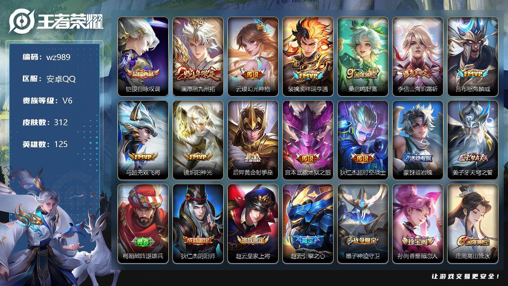 【账号佳】 【可二次实名】【wz989】【商品标题】:安卓Q-V6-至尊星耀II段位-125英雄-312皮肤-1典藏-0珍品无双-0无双-0珍品传说-11传说-91史诗 【荣耀典藏】:铠银白咏叹调 【传说皮肤】:澜愿照九州拓,云缨幻光神枪,裴擒虎祥瑞亨通,桑启鸣野蒿,李信山海炽霜斩,吕布怒海麟威,马超无双飞将,镜炽阳神光,后羿黄金射手座,宫本武藏地狱之眼,狄仁杰超时空战士 【限定皮肤】:蒙犽顽岩魄,姜子牙天穹之誓,杨戬破阵退雄兵,狄仁杰阴阳师,赵云皇家上将,赵云引擎之心,墨子神迹守卫,孙尚香蔷薇恋人,庄周高山流水,高渐离死亡摇滚,阿轲迷踪丽影,芈月幻夜卜梦,元歌云间偶戏,元歌无心,夏侯惇朔风刀,马可波罗暗影游猎,狄仁杰魔术师,狄仁杰万华元夜,达摩沙漠行僧,项羽海滩派对,老夫子醍醐杖,老夫子航海奇遇记,程咬金演武夺筹,刘邦夺宝奇兵,王昭君午后时光,兰陵王金庭之子,亚瑟潮玩骑士王,孙悟空孙行者,牛魔御旌,后羿圣弓游侠,李元芳匿光侦查者,李元芳云中旅人,钟馗驱傩正仪,杨玉环遇见飞天,女娲朔望之晖,干将莫邪真爱魔法,雅典娜黎明之约,太乙真人华丽摇滚,鬼谷子原初探秘者,鬼谷子五谷丰年,黄忠火炮绅士,苏烈千军破阵,百里玄策原初追逐者,弈星混沌棋,梦奇顽趣,沈梦溪大漠名商,明世隐疑决卦,裴擒虎李小龙,裴擒虎擒涛扼浪,狂铁电玩高手,米莱狄御霄,云中君纤云弄巧,李信山海炽霜斩,猪八戒西部大镖客,猪八戒猪悟能,上官婉儿梁祝,上官婉儿天狼绘梦者,嫦娥拒霜思,嫦娥暖冬兔眠,鲁班大师探海日志,桑启海盐诗旅,暃星界游侠,艾琳女武神,艾琳流音漫舞,司空震地狱燃心,阿古朵江河有灵,张良古海寻踪,蒙犽百解令,蒙恬荣光圣徽,高渐离燃音魔法,妲己灵卜魔法,鬼谷子天穹祈灯,伽罗琥珀纪元,姬小满妄想食味,沈梦溪龙舞盛年,鲁班七号蔬乡物语,李元芳蔬乡物语,刘邦剑破天穹,程咬金群星魔术团,镜青焰无极,项羽苍威无极,周瑜熔金海岸 【年限皮肤】:李信山海炽霜斩 【赛季限定】:夏侯惇朔风刀,狄仁杰万华元夜,达摩沙漠行僧,老夫子醍醐杖,程咬金演武夺筹,兰陵王金庭之子,张良古海寻踪,牛魔御旌,李元芳云中旅人,钟馗驱傩正仪,雅典娜黎明之约,鬼谷子原初探秘者,苏烈千军破阵,百里玄策原初追逐者,弈星混沌棋,梦奇顽趣,沈梦溪大漠名商,明世隐疑决卦,裴擒虎擒涛扼浪,米莱狄御霄,鲁班大师探海日志,桑启海盐诗旅,鬼谷子天穹祈灯,蒙恬荣光圣徽,刘邦剑破天穹,姜子牙天穹之誓 【战令限定】:墨子神迹守卫,阿轲迷踪丽影,芈月幻夜卜梦,元歌云间偶戏,马可波罗暗影游猎,老夫子航海奇遇记,刘邦夺宝奇兵,王昭君午后时光,艾琳流音漫舞,亚瑟潮玩骑士王,后羿圣弓游侠,女娲朔望之晖,干将莫邪真爱魔法,黄忠火炮绅士,狂铁电玩高手,猪八戒西部大镖客,嫦娥暖冬兔眠,司空震地狱燃心,暃星界游侠,高渐离燃音魔法,妲己灵卜魔法,鲁班七号蔬乡物语,李元芳蔬乡物语,镜青焰无极,项羽苍威无极 【史诗皮肤】:鲁班七号电玩小子,露娜紫霞仙子,阿轲暗夜猫娘,赵云皇家上将,赵云未来纪元,貂蝉圣诞恋歌,甄姬冰雪圆舞曲,狄仁杰魔术师,廉颇地狱岩魂,宫本武藏鬼剑武藏,孙尚香蔷薇恋人,孙尚香水果甜心,妲己魅力维加斯,妲己女仆咖啡,墨子金属风暴,吕布圣诞狂欢,刘禅绅士熊喵,曹操幽灵船长,李白千年之狐,吕布末日机甲,赵云引擎之心,花木兰水晶猎龙者,刘邦德古拉伯爵,小乔缤纷独角兽,兰陵王暗隐猎兽者,诸葛亮黄金分割率,亚瑟心灵战警,雅典娜冰冠公主,安琪拉心灵骇客,百里守约特工魅影,铠曙光守护者,蔡文姬舞动绿茵,刘禅天才门将,李元芳逐浪之夏,白起星夜王子,阿轲节奏热浪,杨玉环遇见飞天,孙策猫狗日记,伽罗箭羽风息,狄仁杰鹰眼统帅,公孙离无限星赏官,上官婉儿梁祝,不知火舞魅语,阿轲迷踪丽影,橘右京修罗,上官婉儿天狼绘梦者,马可波罗暗影游猎,百里玄策原初追逐者,裴擒虎李小龙,云中君纤云弄巧,元歌云间偶戏,老夫子航海奇遇记,杨戬天秀启明,干将莫邪真爱魔法,沈梦溪月团寄思,钟馗乐园奇幻夜,孙悟空孙行者,猪八戒猪悟能,庄周高山流水,嫦娥拒霜思,黄忠火炮绅士,雅典娜黎明之约,澜赏金猎手,狂铁电玩高手,鬼谷子五谷丰年,元歌无心,梦奇顽趣,暃星界游侠,刘禅电玩爆裂旋风,李元芳匿光侦查者,司空震地狱燃心,阿古朵江河有灵,蒙犽百解令,妲己灵卜魔法,高渐离燃音魔法,蒙恬荣光圣徽,伽罗琥珀纪元,姬小满妄想食味,鲁班七号蔬乡物语,镜青焰无极,蒙犽顽岩魄,大司命东方月初,牛魔星界战将,孙膑茶境仙,赵怀真器灵浮梦炉,阿轲化蝶舞,刘禅鸭鸭历险记,狂铁龙之律动,扁鹊灵蛊蚀心,后羿石田雨龙,黄忠百相守梦,公孙离涂山容容 【其他皮肤】:项羽海滩派对,韩信教廷特使,韩信街头霸王,露娜哥特玫瑰,阿轲爱心护理,达摩大发明家,赵云白执事,赵云忍炎影,芈月红桃皇后,艾琳女武神,程咬金星际陆战队,白起白色死神,牛魔西部大镖客,扁鹊化